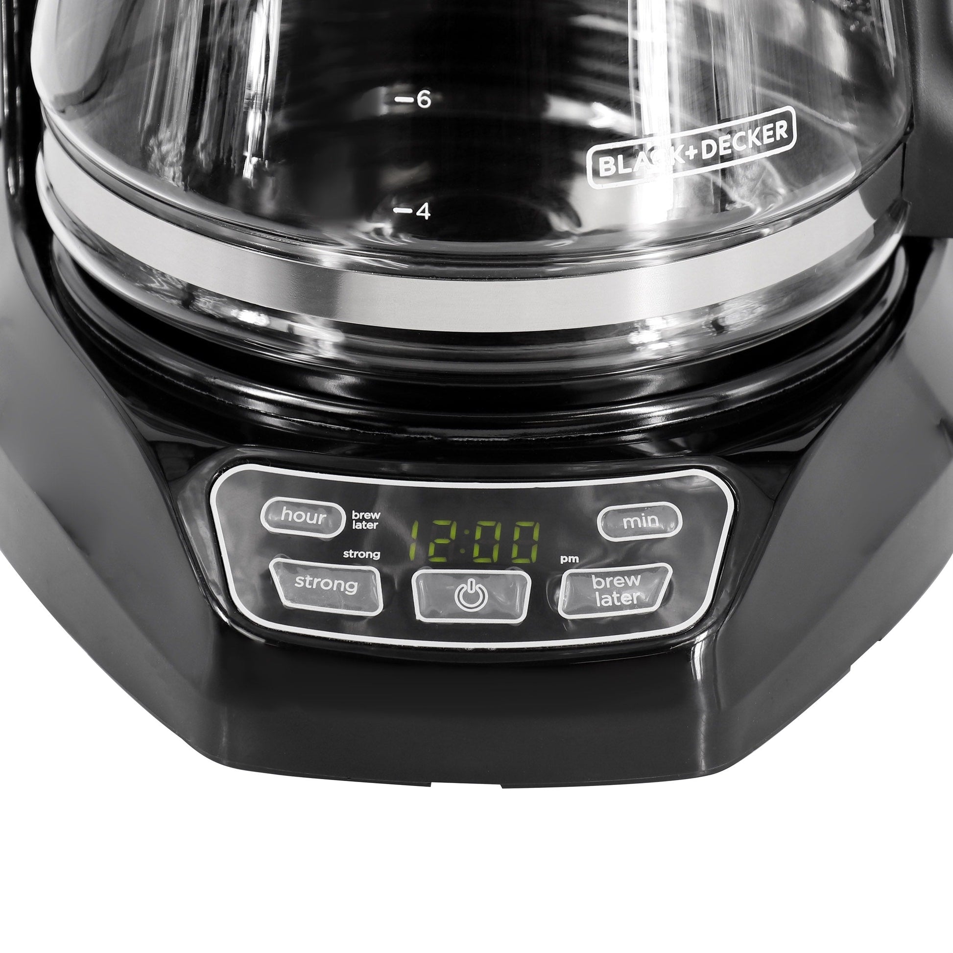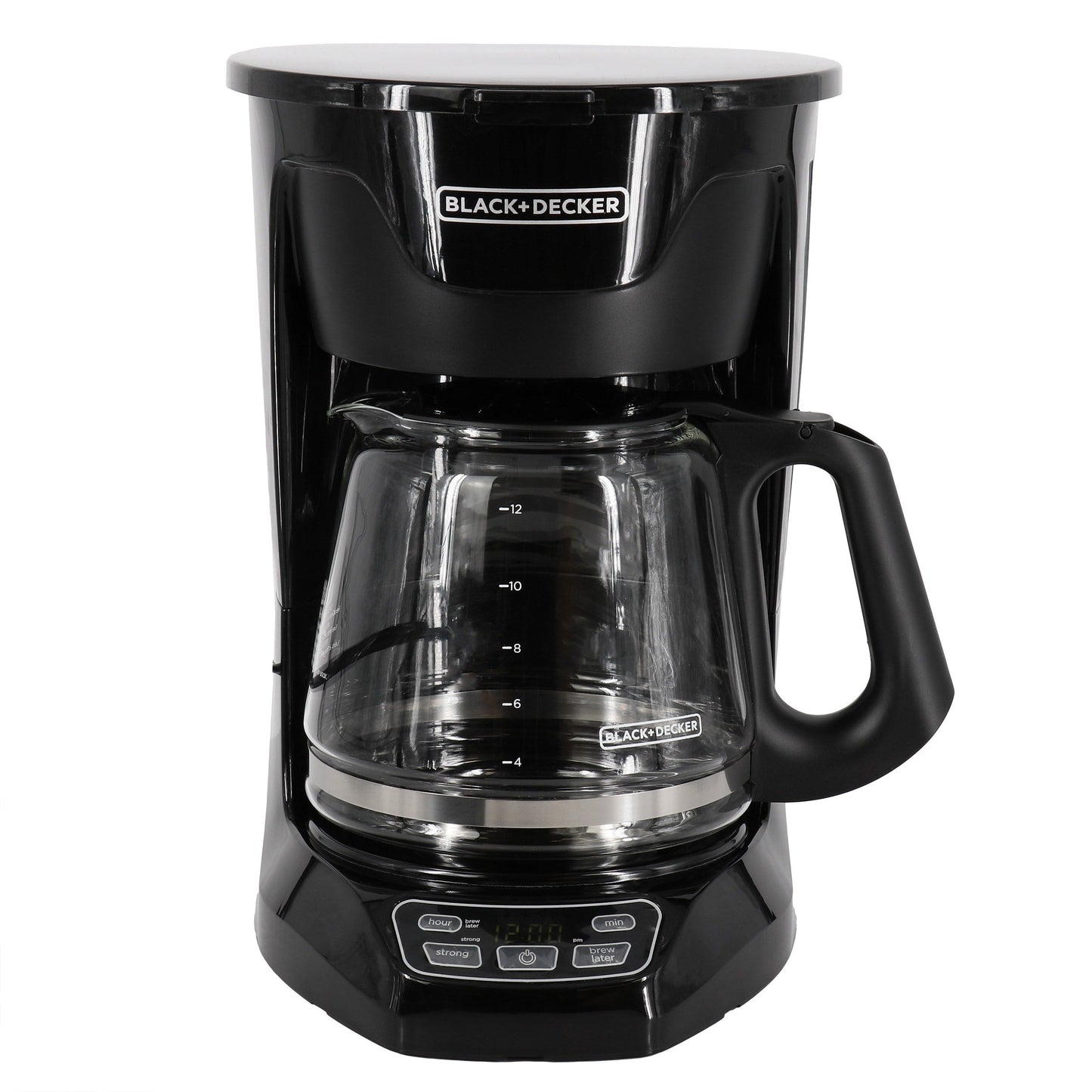 Enjoy delicious coffee with the BLACK+DECKER® 12-Cup* Programmable Coffeemaker. The Vortex Technology Water Flow evenly saturates coffee grounds using optimal water flow for maximum flavor. You can change the brew strength with the option for a slower brewing process and stronger cup of coffee. Sneak-A-Cup Technology lets you pour a cup of coffee before the rest of the pot has brewed - all without any drips or spills. The digital controls feature QuickTouch Programming so you can easily set the clock and program the auto brew system for coffee now or later at the touch of a button. Item Dimensions: 8.15' x 5.00' x 12.11' Item Weight: 3.40lbs