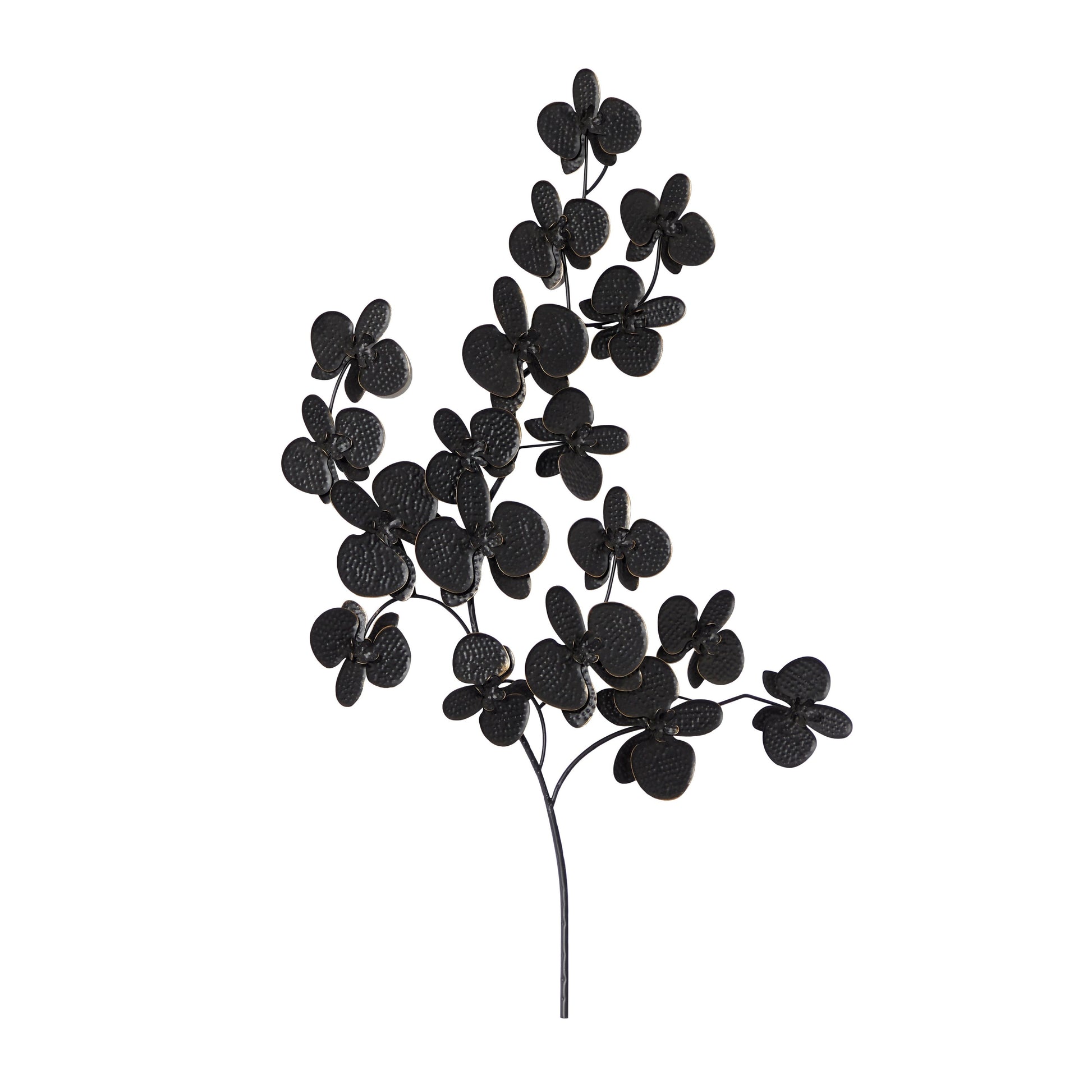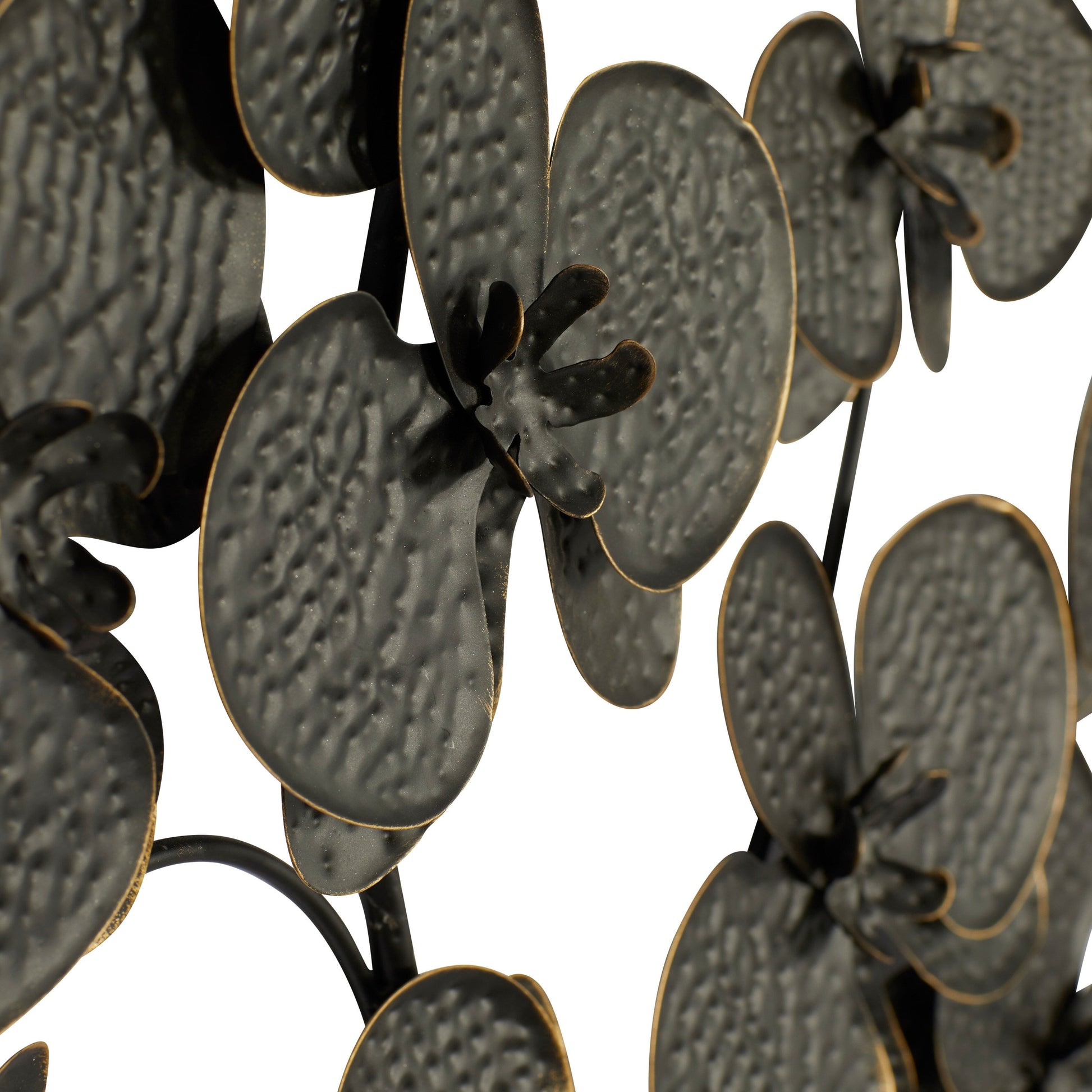 Create an excellent focal point on your walls paired with some cute accent tables, and level up your home with this amazing wall Decor. It makes a great centerpiece over your sofa or in your dining room. Give you neutral-painted walls a touch of nature with this enlarged orchid metalwork. Wipe clean with a dry cloth. Contemporary design. Easy to hang with nail or screw via ring hardware on the back. This item comes shipped in one carton.. Ideal decor that works best in contemporary themed homes. Get this hammered steel-inspired wall decor crafted with 100% metal into an orchid wall art. It features a charcoal black, gold-tipped finish. This wall decor is designed as a 3D orchid wall art. It measures 31'L x 3'W x 46'H and weighs 4 lbs