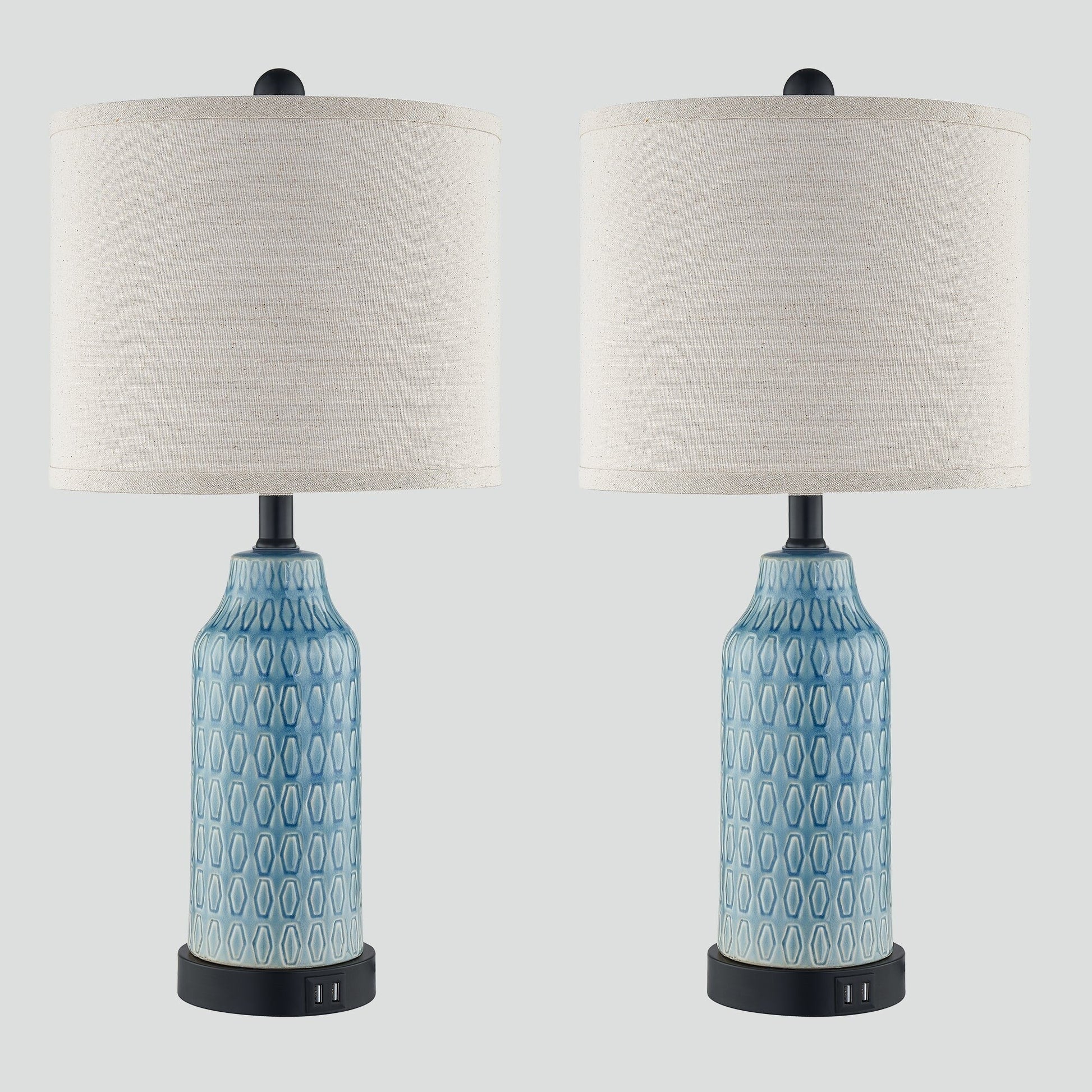 Set of two blue ceramic table lamps. This lamp set features drum-shaped linen lampshades that provide tridimensional illumination. The lamp bases are made of ceramic and intricately carved with hexagonal textures on the lamp body surface. The entire lamp body is finished in a light blue glaze, creating an interplay of sheen and color that adds to the interior aesthetics. The lamp base integrates a high-sensitivity 3-level adjustable touch dimmer switch, allowing you to adjust the light intensity according to the scene's needs. It also comes with two universal USB charging ports that can be used regardless of whether the table lamp is on, providing charging for two electronic devices such as phones, iPads, or smartwatches. This table lamp is sleek, convenient, space-saving, and helps to keep your interior clutter-free.