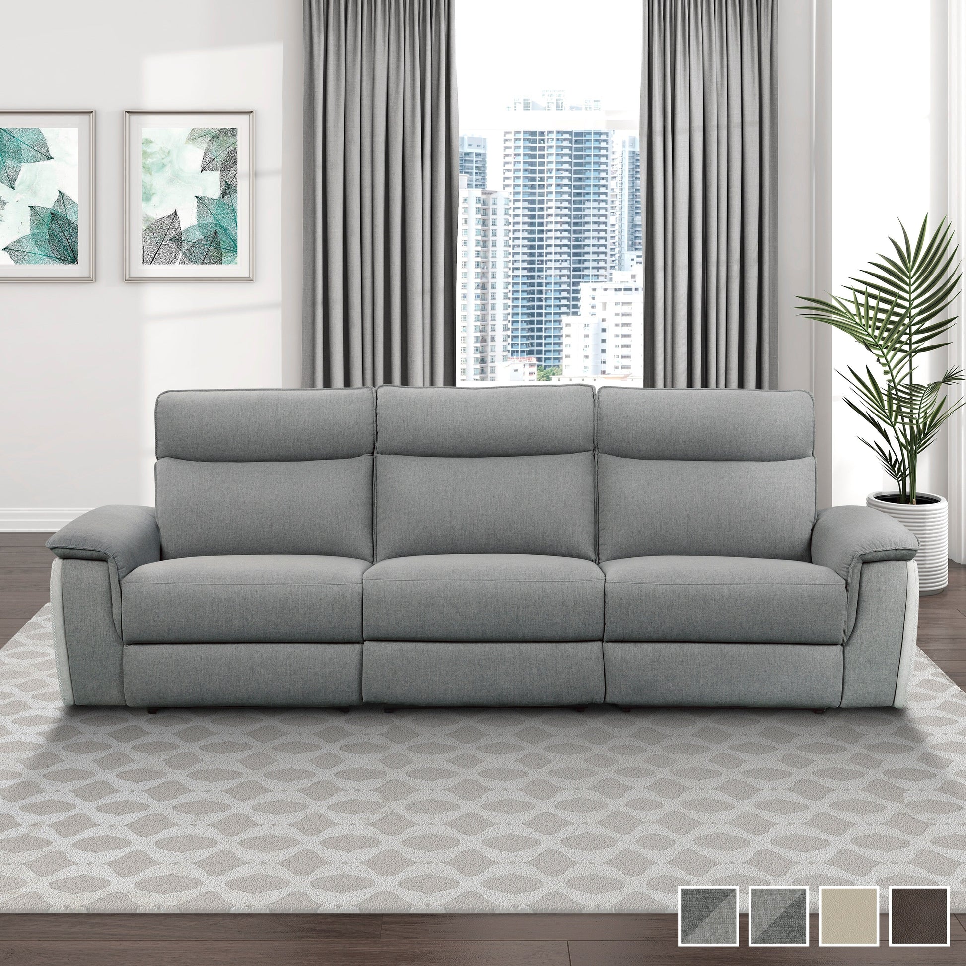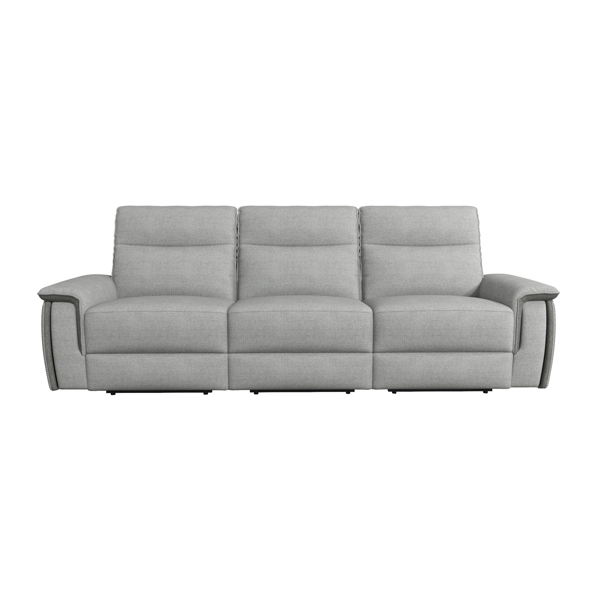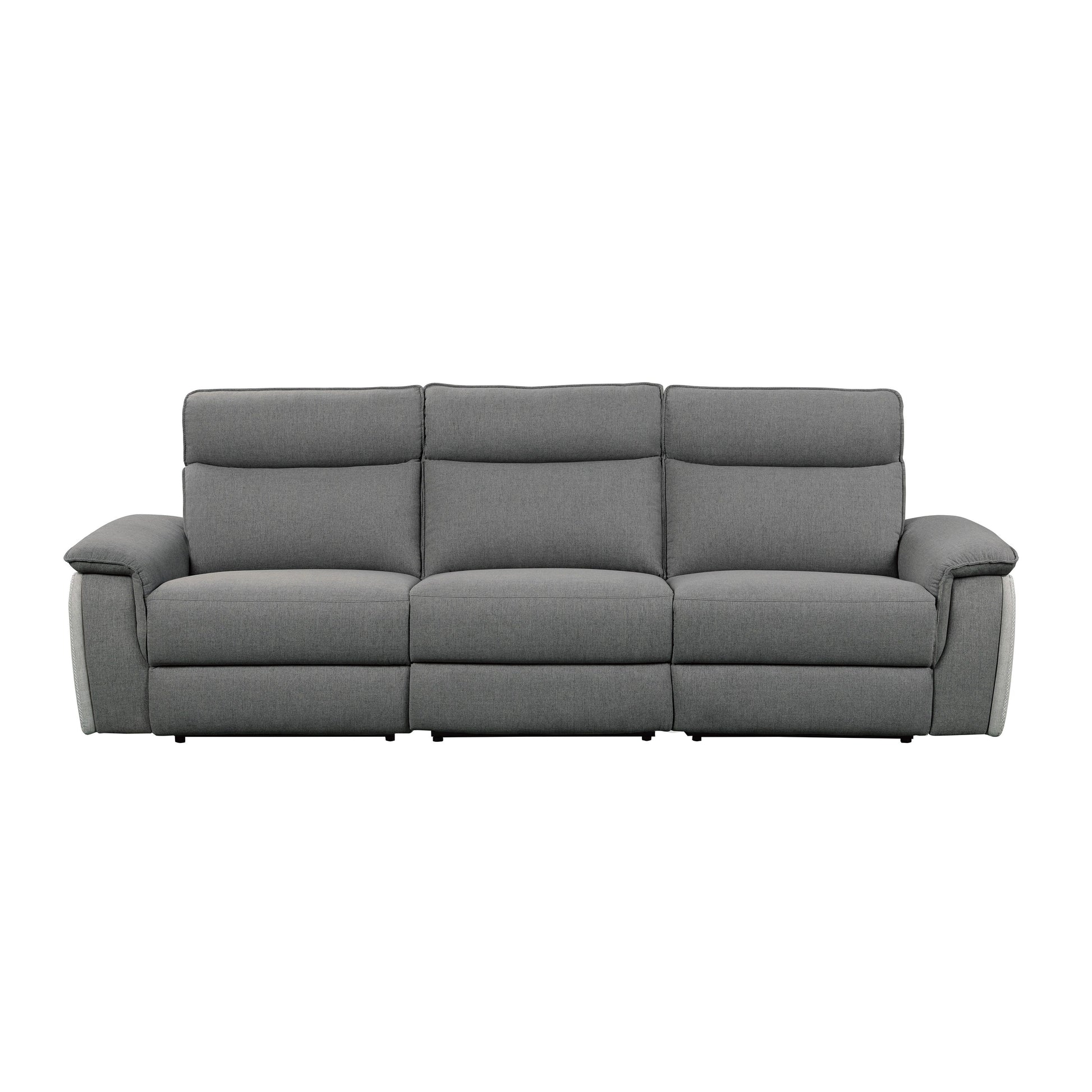 Providing ample seating for your friends and family is the Blythe Collection. The sofa features by USB port enhanced end power recliners. The power reclining mechanism brings you to your desired position with a touch of the button. Providing additional function to the sofa is the USB ports and power operated headrests that allow you to further customize your comfort experience. Offered in 4 upholstery covering: Two-Tone Light Grey fabric, Two-Tone Dark Grey fabric, Taupe leather match, and Dark Brown leather match.