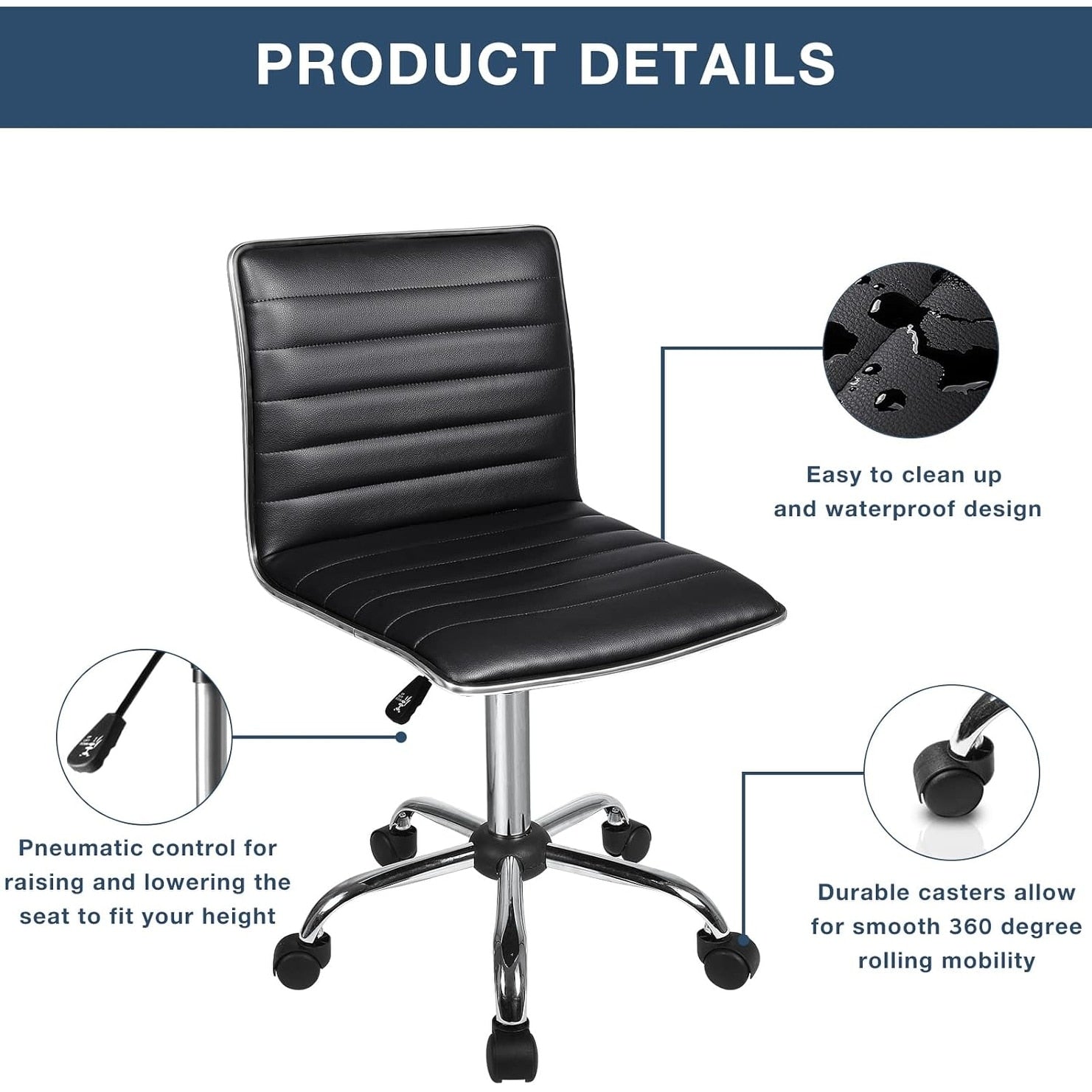 - ✅【Soft Material and Sturdy Construction】Our low back armless chair is constructed of deluxe PU leather, high elastic foam and a strong chrome finish base, you can easily wipe away any spills or dirt on the chair, leaving no watermarks, the leather material and the soft cushion are comfortable to sit on,smooth swiveling and can hold up to 120 kg/ 265 lb, strong and sturdy enough for your daily use. Excellent rust resistance and durability for your long-term use.