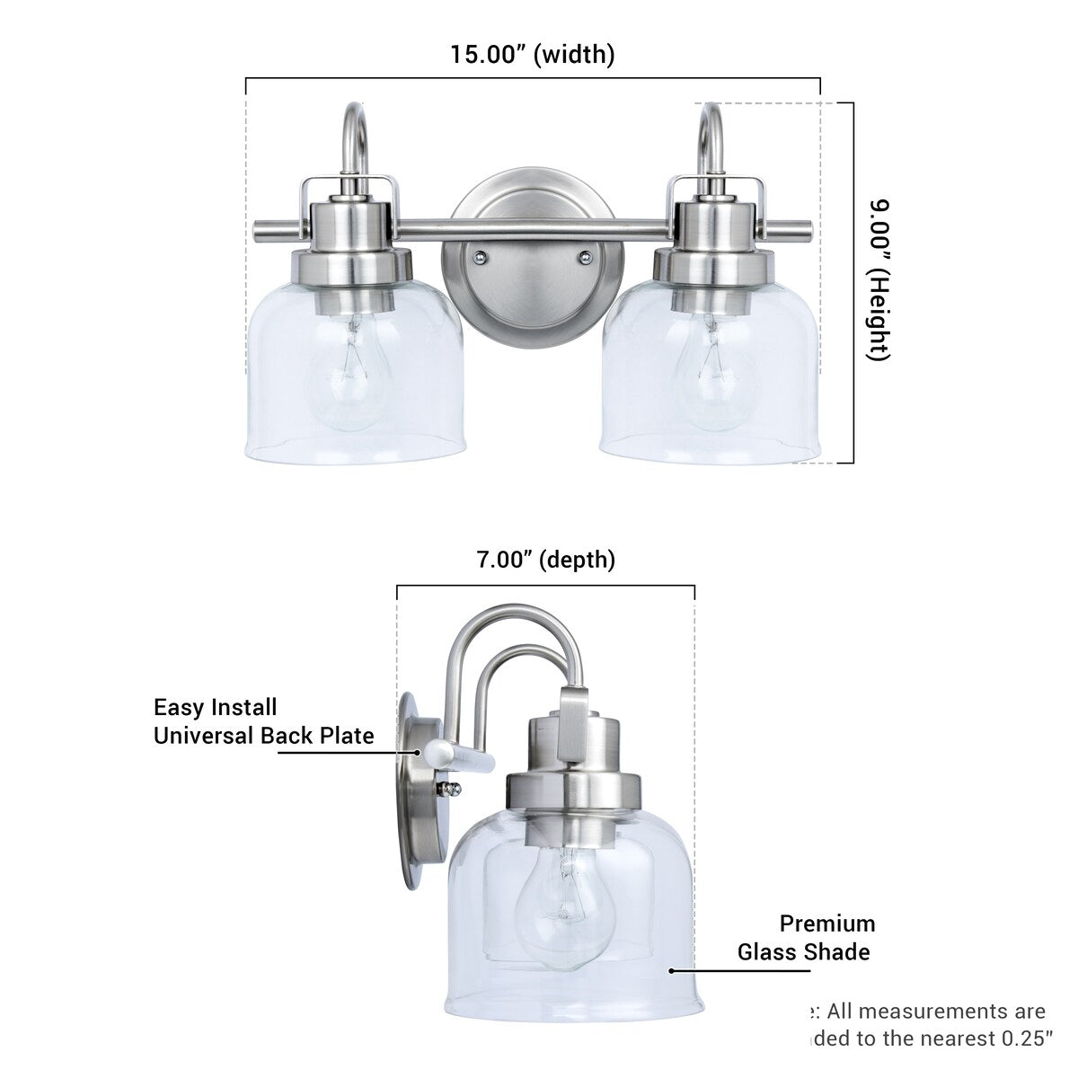 The 2-light vanity light displays a modern farm house look for the vanity. The backplate connects to one sleek arm that can easily be mounted up or down thanks to its reversible feature. Two clear glass cups enclose two medium-base bulbs up to 60W, which is not included. This vanity light is compatible with a dimmer switch (not included), so you can adjust the lighting to match what the room requires. This item sold in a Black or Nickel finish.