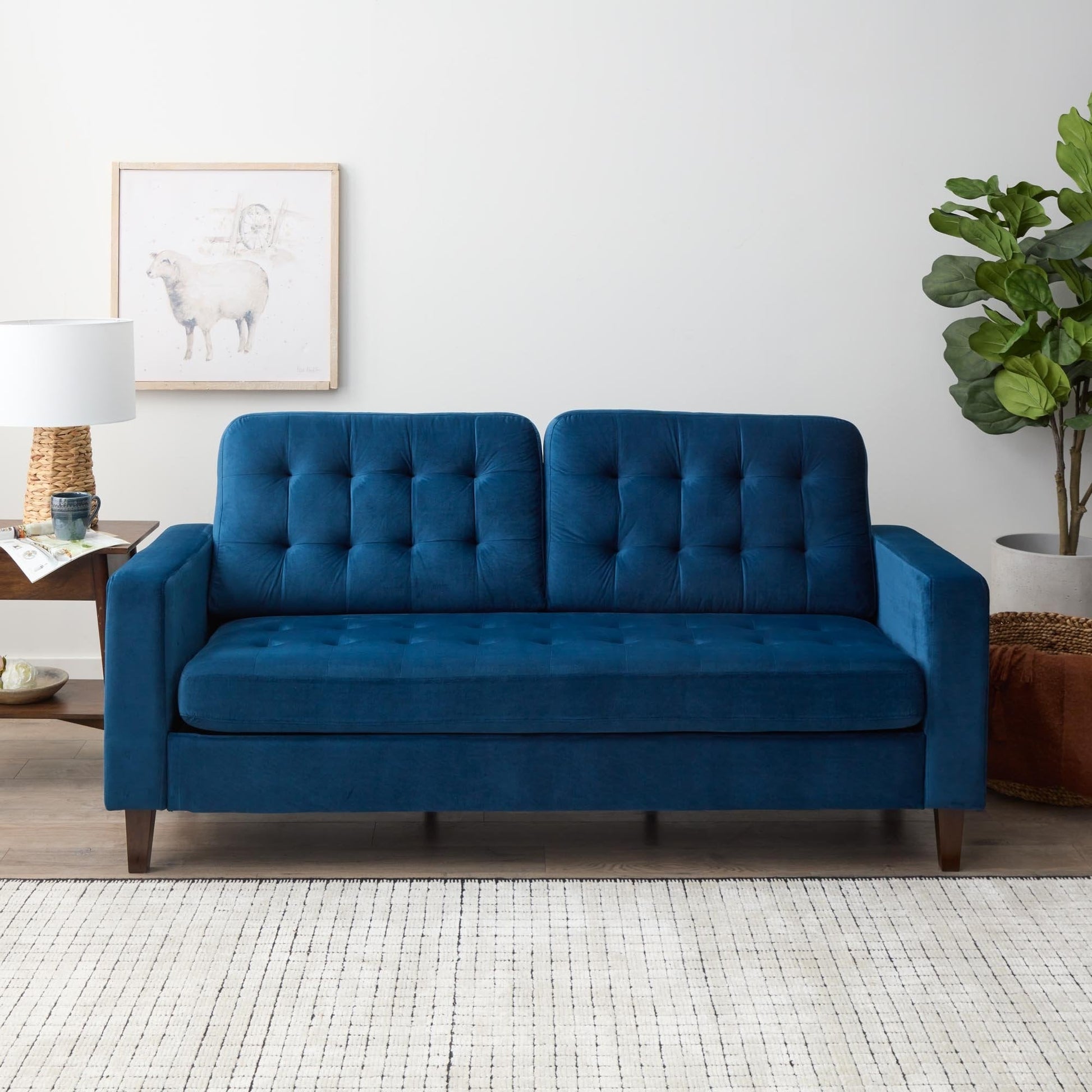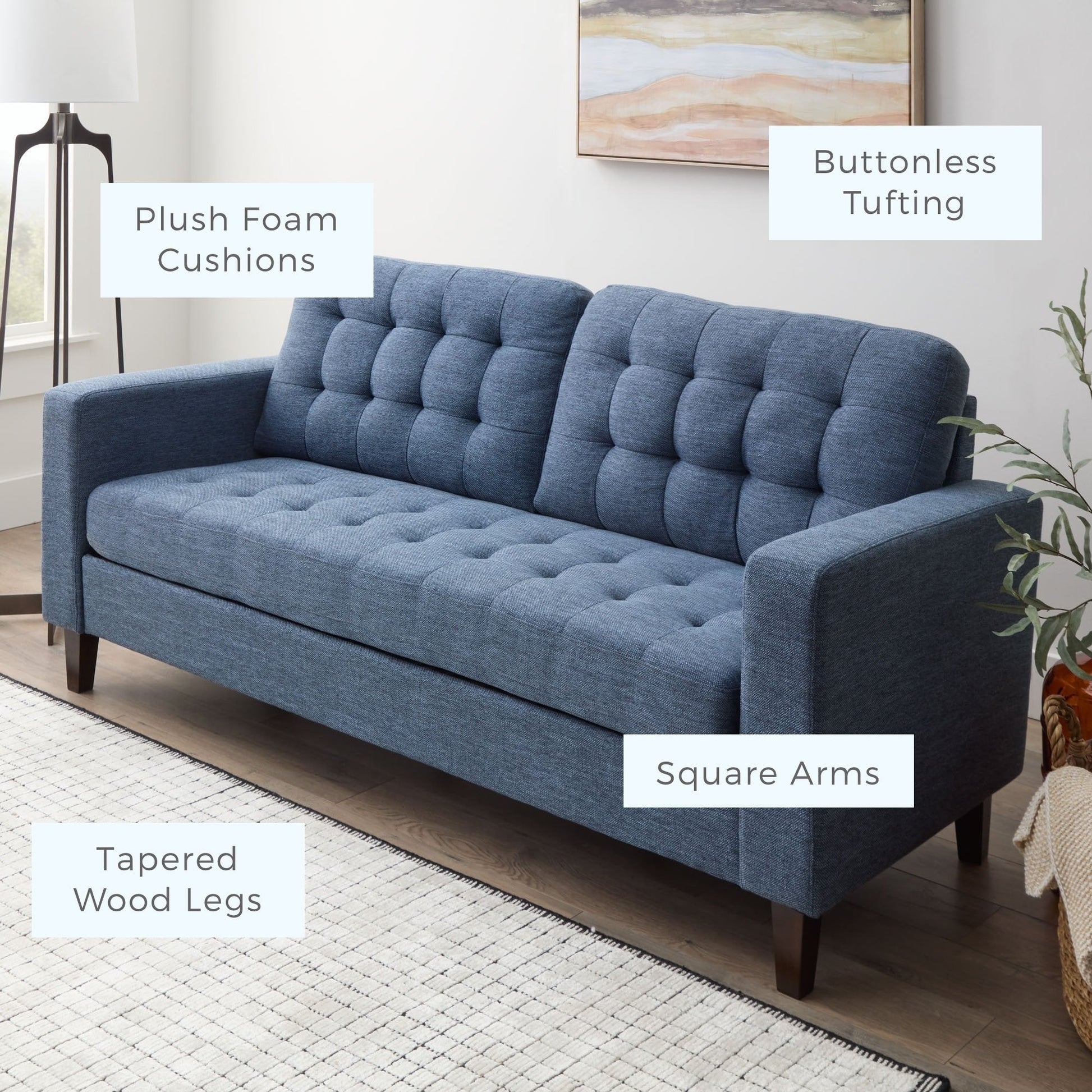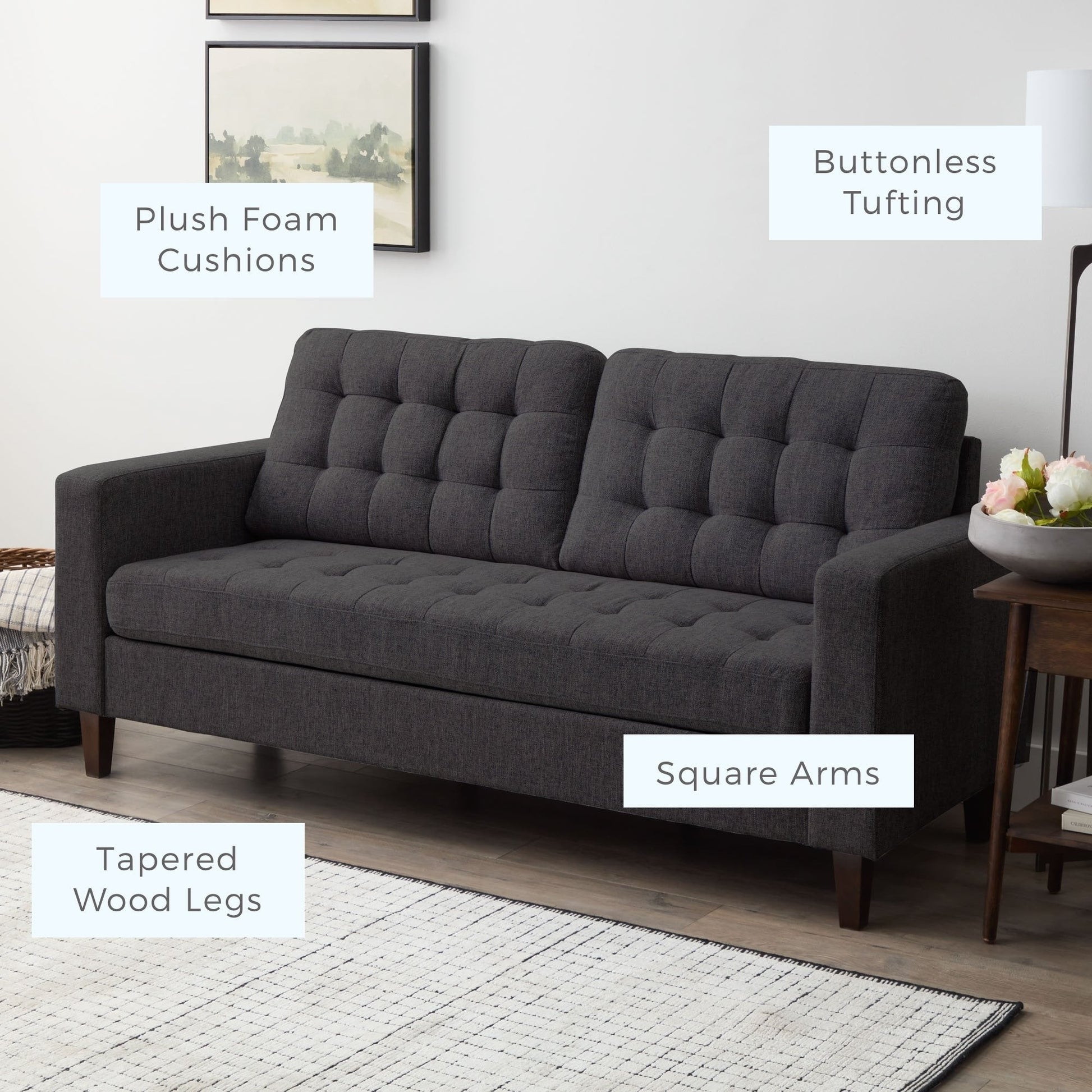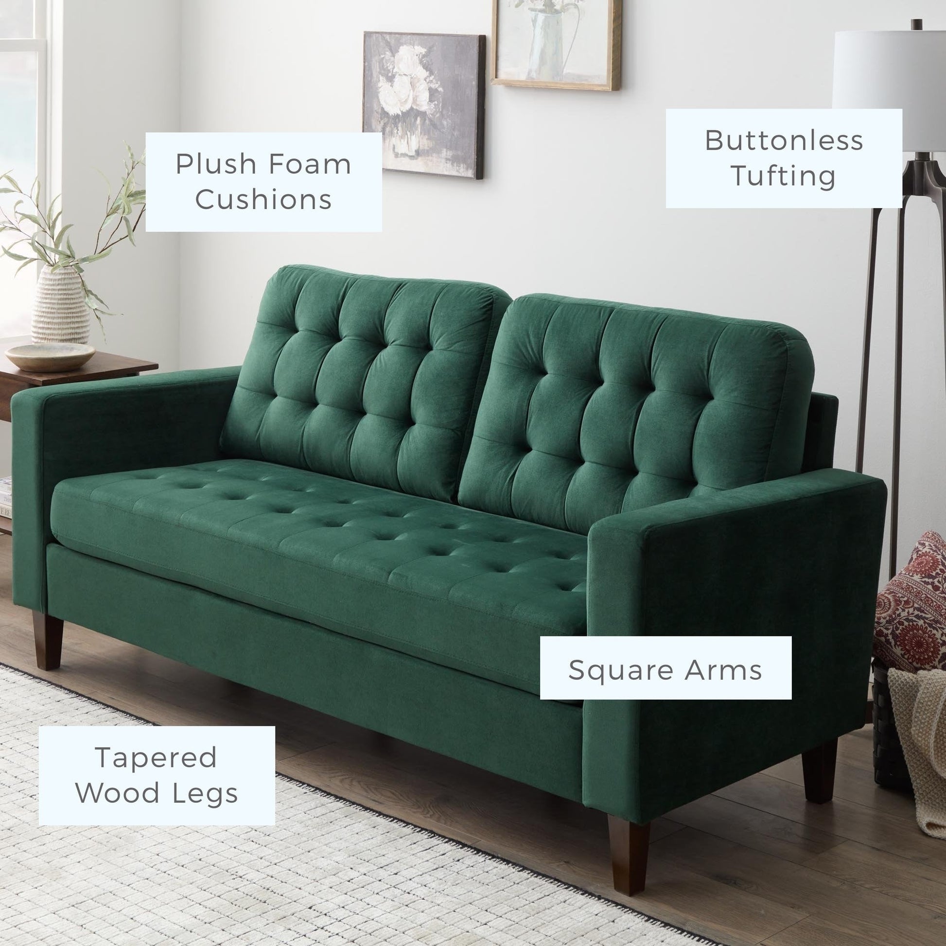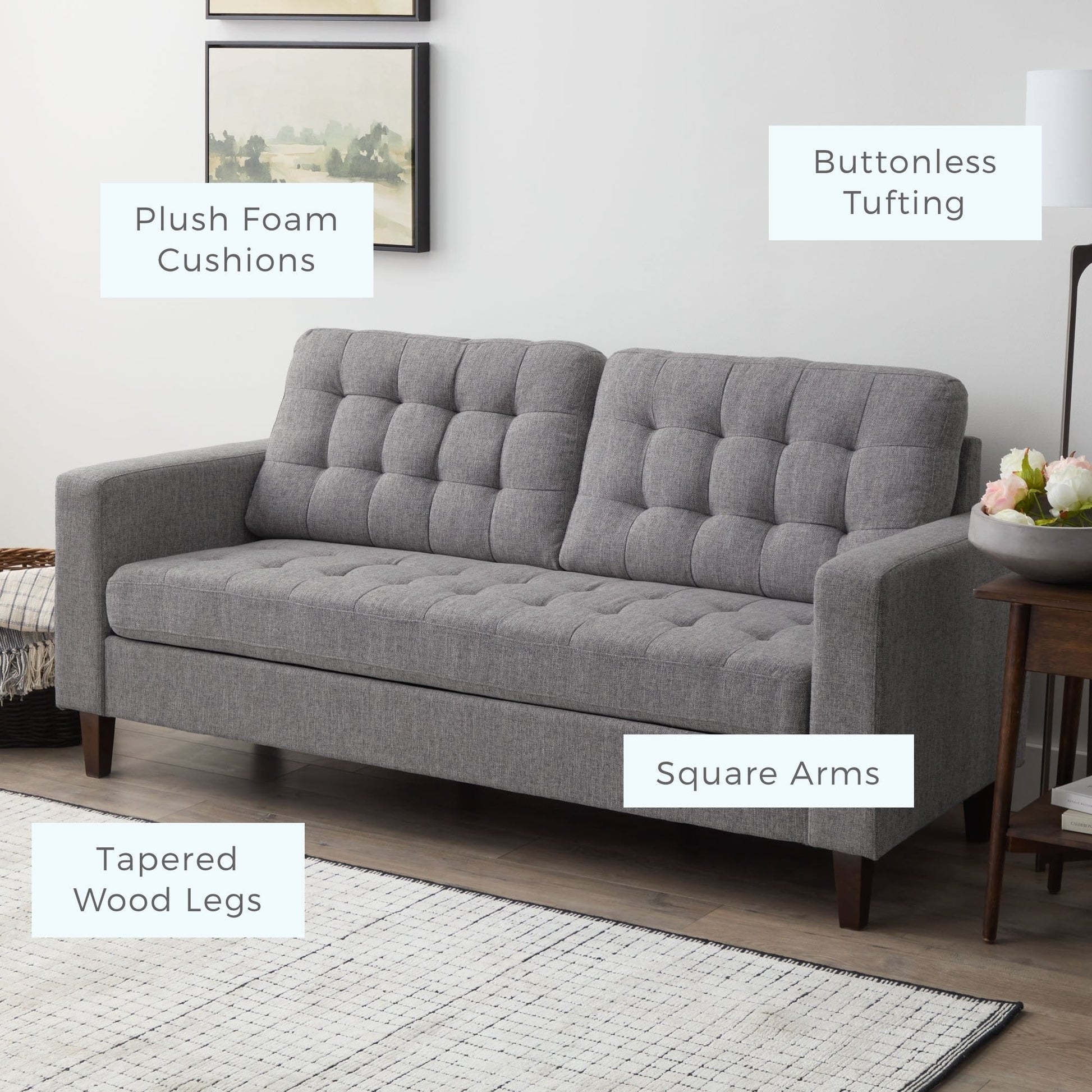 - Timeless style with classic square arms and buttonless tufting