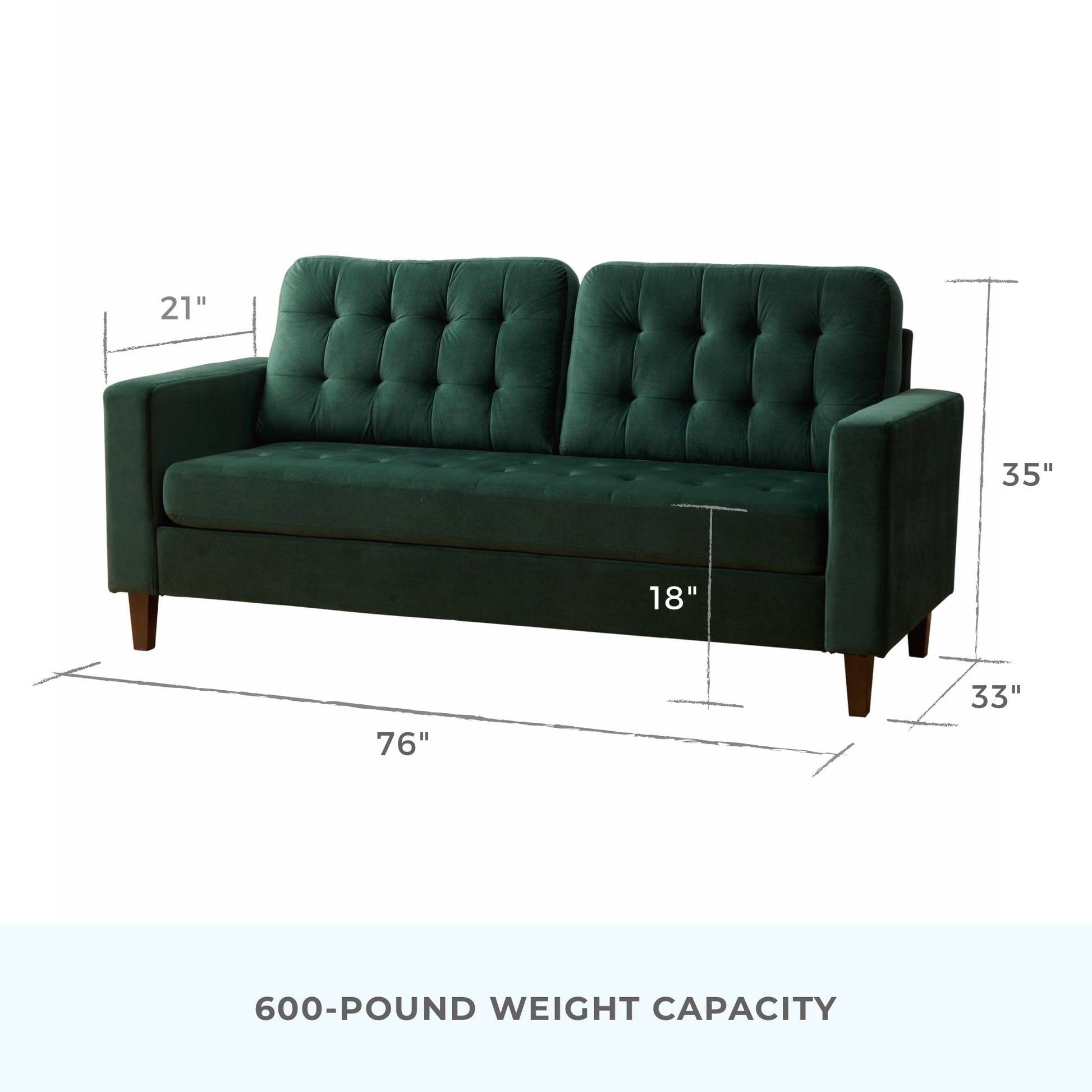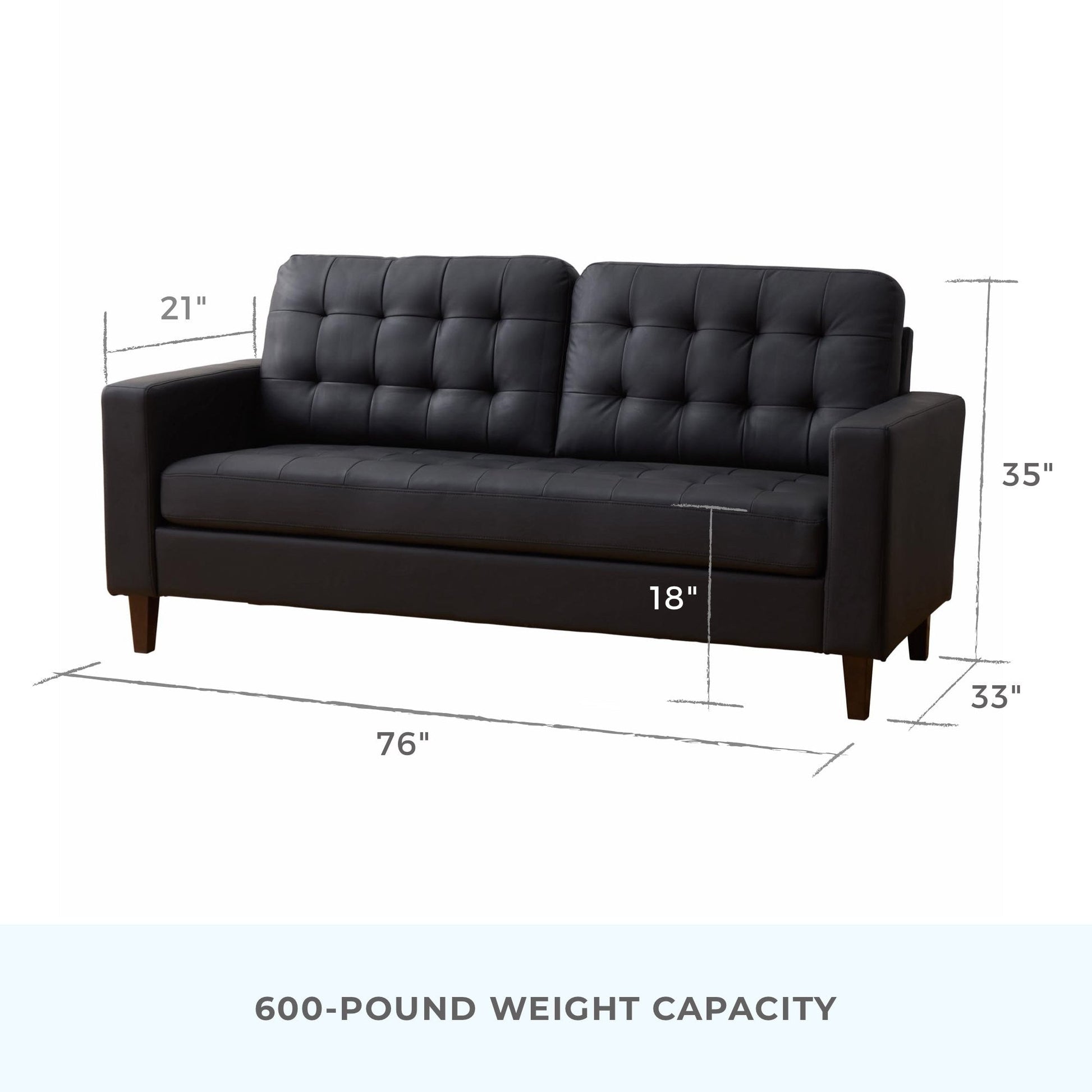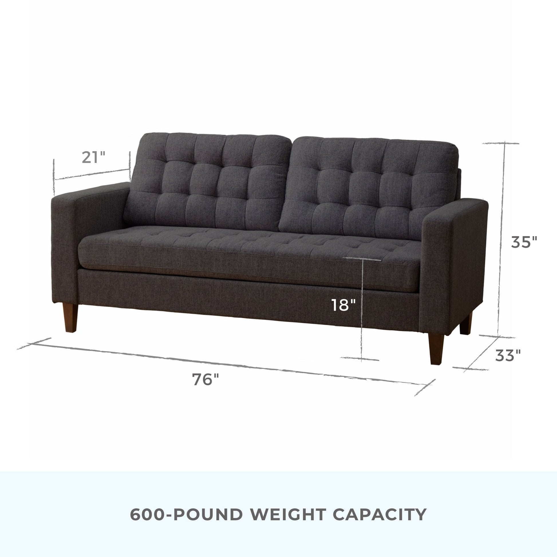 Elevate your space with the Brookside Brynn Square Arm Upholstered Sofa, which seamlessly blends contemporary style with timeless details. The elegant buttonless tufting and classic square arms add a touch of sophistication to your living room, bedroom or office. Available in seven different colors and three fabrics, this space-saving couch lets you create the custom look and feel you desire at an affordable price. The durable wood frame, sturdy wood legs, and thick foam cushions ensure long-lasting comfort and quality. With a weight capacity of 600 pounds, this small sofa is perfect for compact spaces, measuring 76' (W) x 33' (D) x 35' (H). Plus, assembly is a breeze with all hardware included and conveniently stored under the sofa. Complete your furniture set by pairing this stylish sofa with the matching loveseat, and enjoy a complimentary one-year limited warranty.