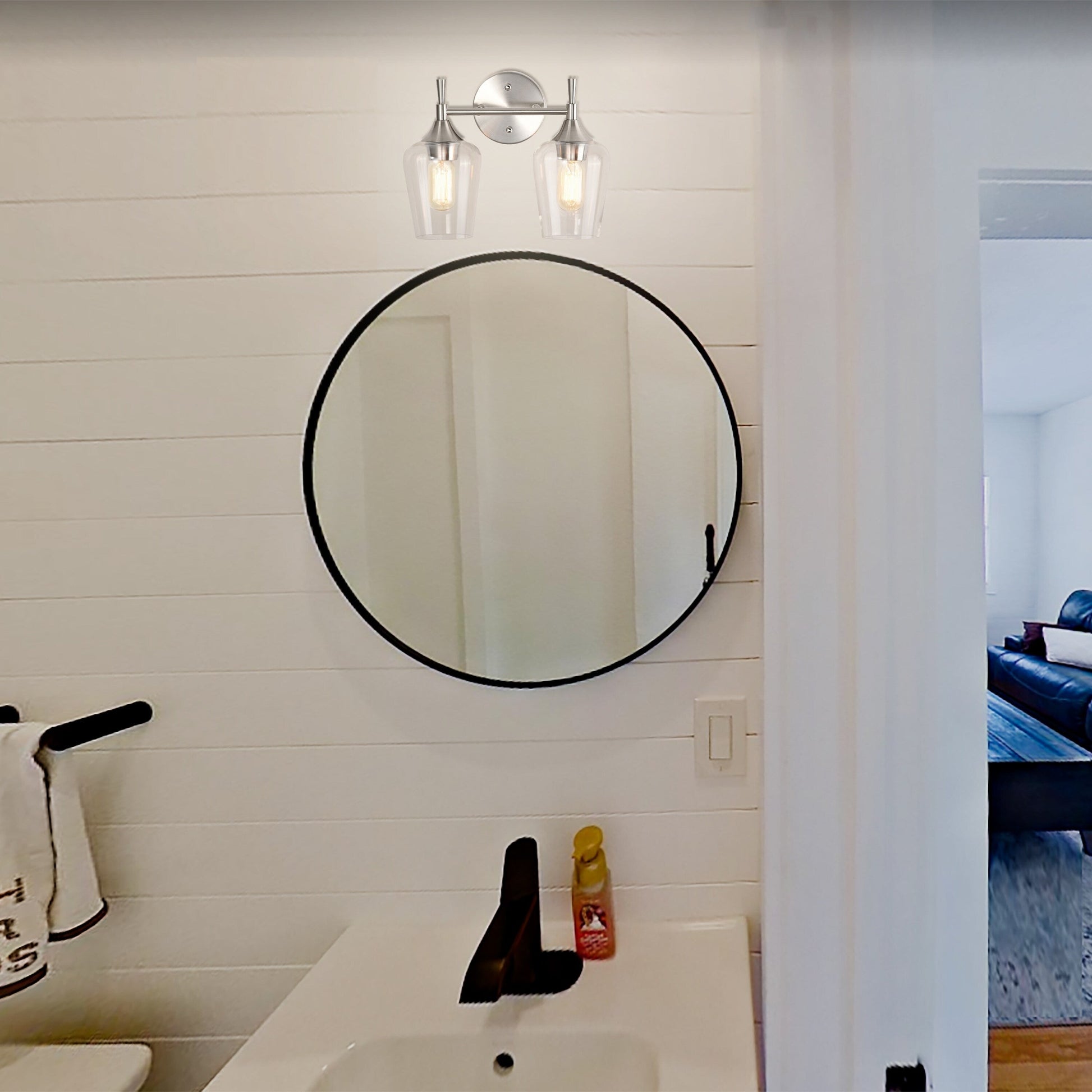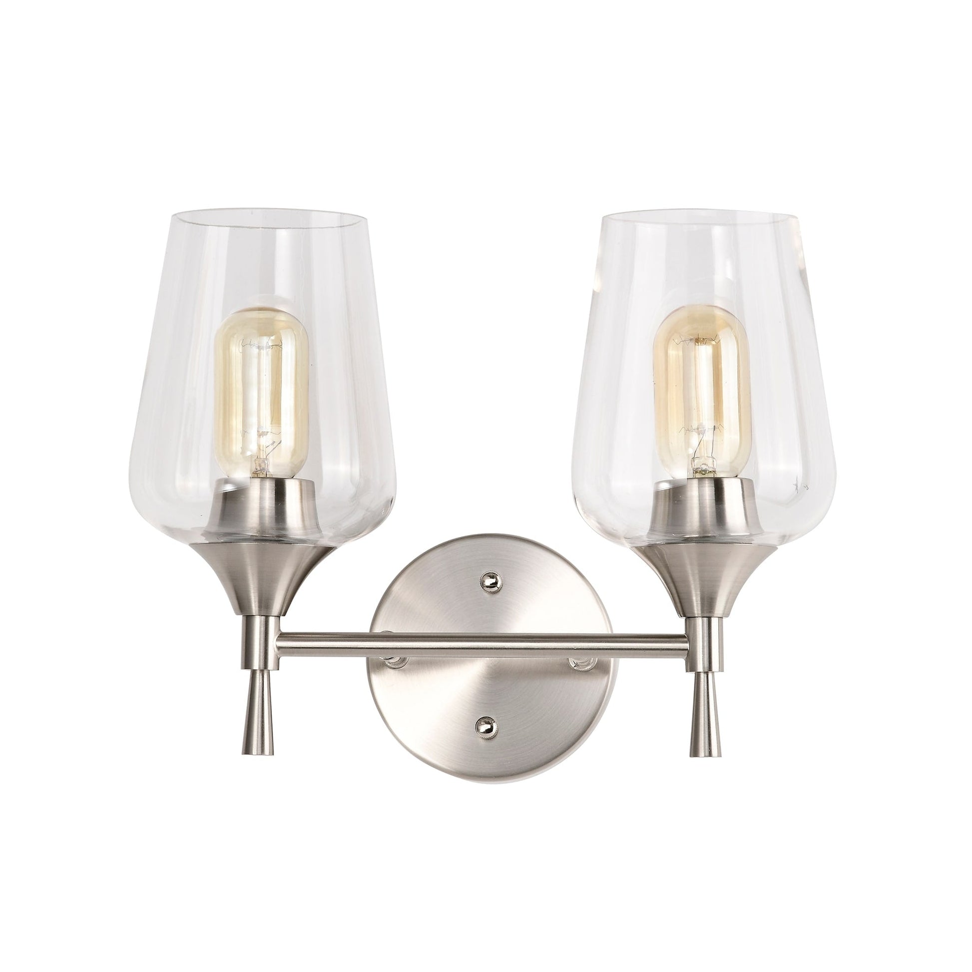 This contemporary 2 light vanity will instantly update the overall design of your bathroom with its modern finish and classic silhouette. The tapered stems complement the clear wine glass shades in a shiny brushed nickel finish. The two medium base bulbs (not included) shine through the clear glass shades, filling the room with light. Place this vanity light above the bathroom mirror to enhance the rest of your décor. We recommend adding a dimmer switch with dimmable bulbs to set the mood accordingly.