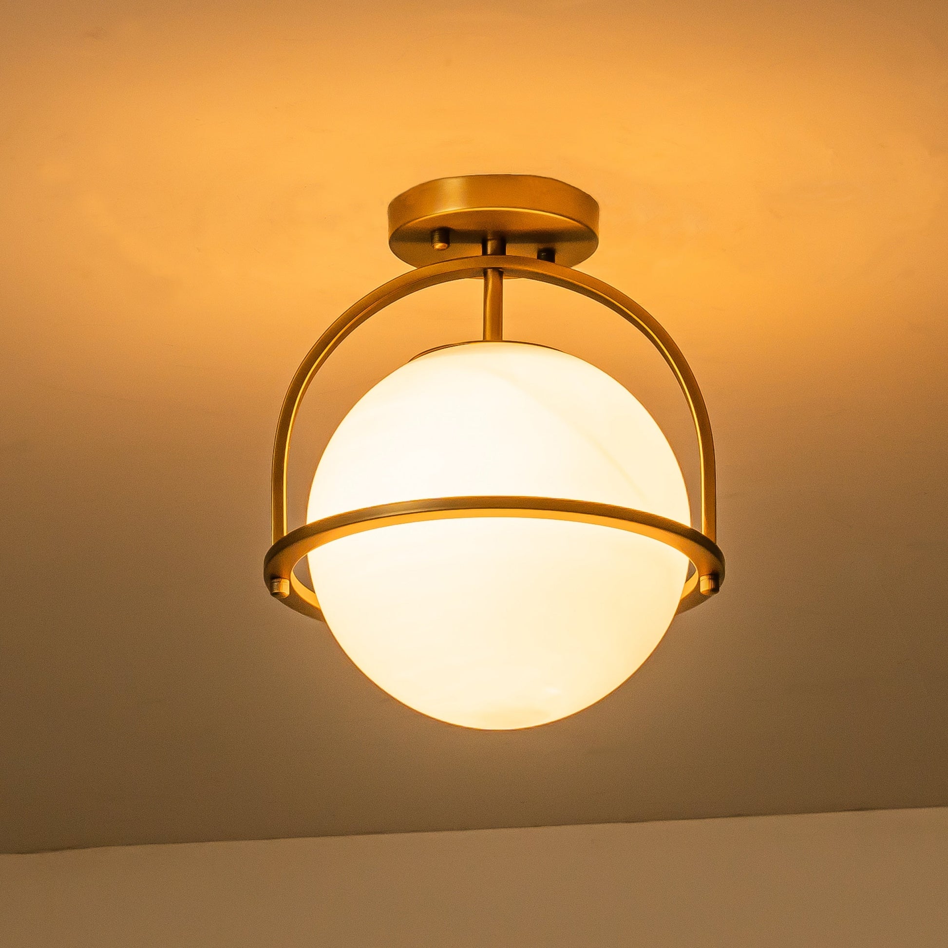 - Sphere semi-flush mount features a geometric frame in a vintage brass finish with a big opal glass shade, creating an elegant modern minimalist look for your hallways, entrances, kitchens, closets, dining rooms, bedrooms and living rooms.