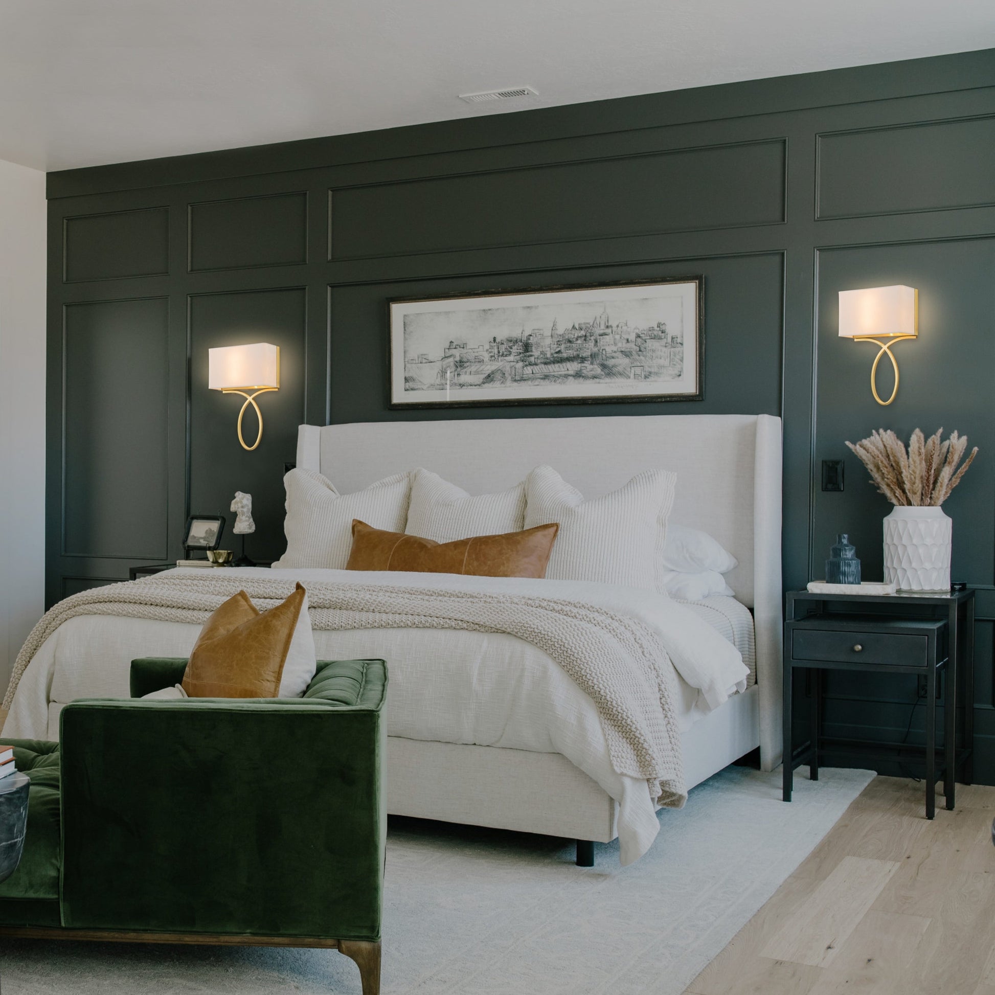 This wall sconce brings glam style and an eye-catching geometric accent to any space. The minimalist two-light wall sconce features an oval metal accent below the white silk rectangular shade. Its simple form can be used for a contemporary or transitional home while versatile enough to be incorporated into any design. This wall sconce includes a clear cord, creating a clean and streamlined look. It requires a simple installation, simply plug it in and watch your bedside space glow in beauty. Or have it hardwired for a more permanent lighting solution. Plus, this wall sconce is dimmer-switch compatible to set the scene.