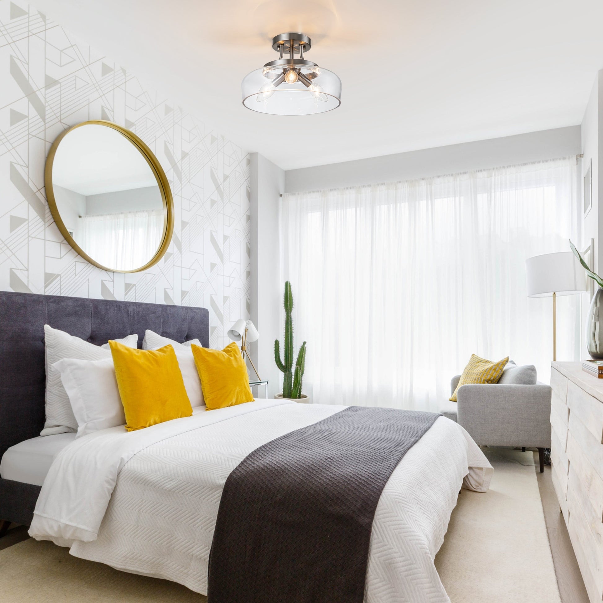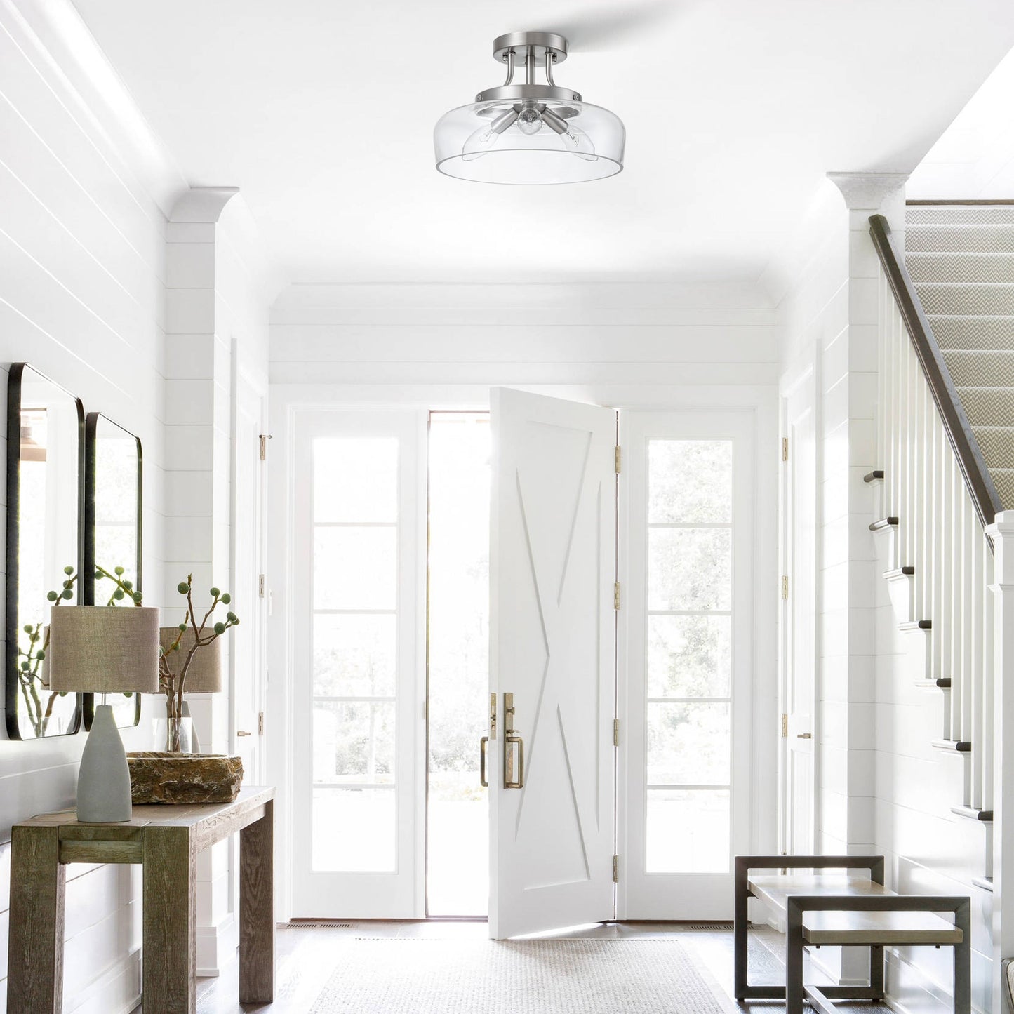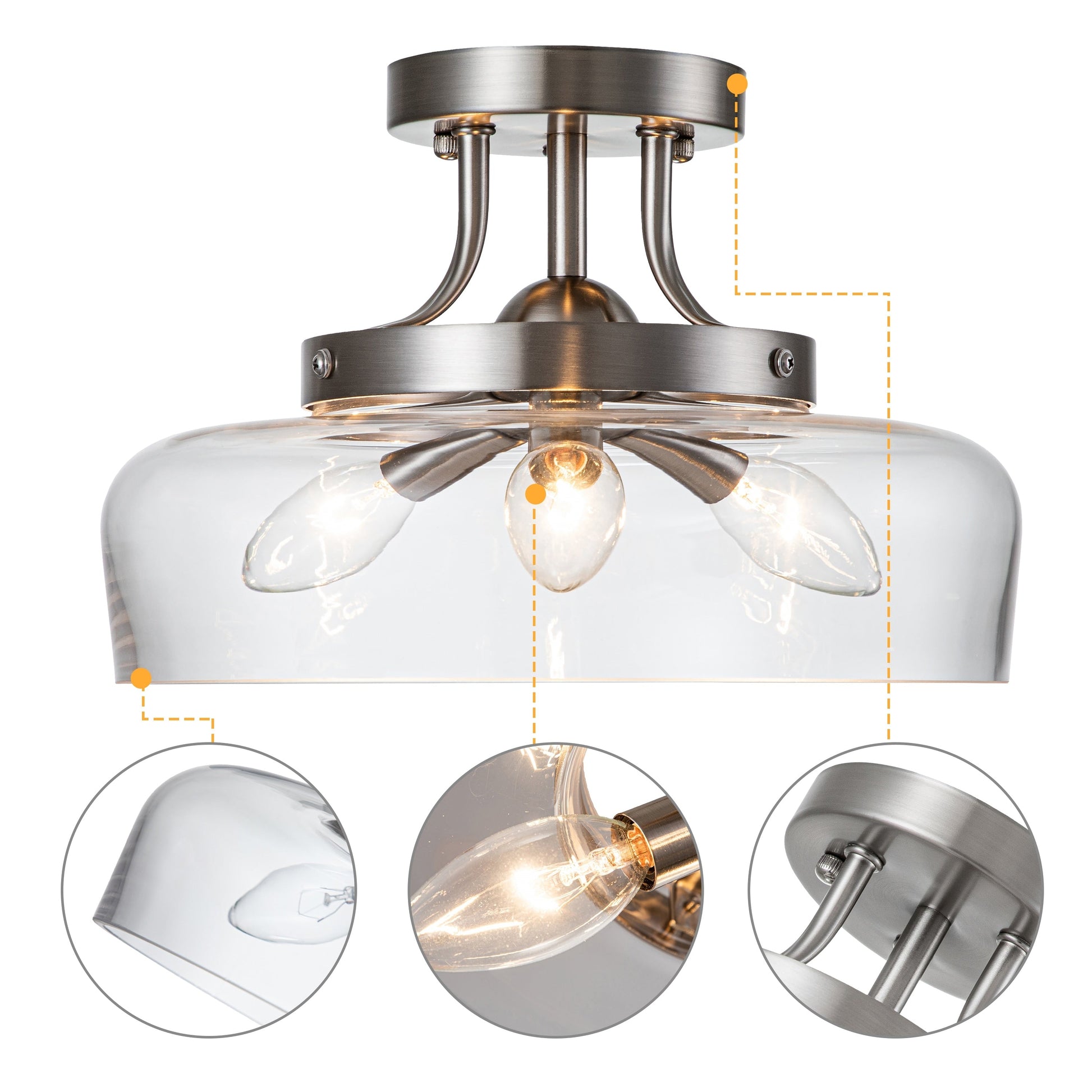 An easy choice with transitional appeal, this 3-light semi flush mount lamp adds polish to your aesthetic home decor with its irresistible functionality and elegance. The rounded glass shade creates a subtle accent that can fit any living room, entryway, or enclosed patio. The clear glass shade enhances the satin nickel finish and allows you to insert CFL, incandescent, or LED light bulbs that fit your style. Fully dimmable with a compatible dimmer switch and dimmable bulbs.