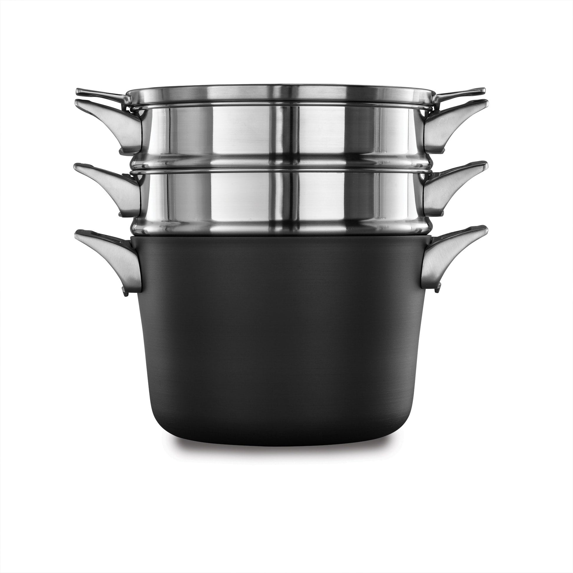 Featuring MineralShield nonstick technology, Calphalon Premier Space-Saving Hard-Anodized Nonstick Cookware is now 5x more durable than before when compared to the previous generation of Calphalon Classic. This nonstick multi-pot delivers long-lasting performance for effortless food release, so you can cook with confidence and serve even the most delicate food with ease. This space-saving line also securely stacks to save 30% more space than its non-stacking counterparts. Thanks to their unique design and flat glass covers, the pots and pans stack and nest in any order when stored on other items of the same diameter.A 3-layer nonstick interior is made with some of the Earth's hardest minerals to withstand metal utensils and everyday use and the hard-anodized exterior is dishwasher-safe for easy cleanup. They are oven-safe up to 450 degrees F, able to go from the stovetop into the oven for heating and cooking versatility. Elevate your cooking experience with Calphalon Premier, and enjoy exceptional performance with endless possibilities.・Stacks neatly and nests in any order, saving up to 30% more space・Built to last, with MineralShield nonstick technology that's 5x more durable than before (vs. previous generation of Calphalon Classic)・Metal-utensil-safe with a long-lasting, 3-layer nonstick interior・Dishwasher-safe for easy cleanup・Oven-safe up to 450 degrees F, so you can easily go from stovetop to oven・Tempered glass lid・Set includes: 8-quart pot with lid, plus pasta and steamer inserts・Compatible with most stovetops, including gas, electric, and glass・Lifetime warranty