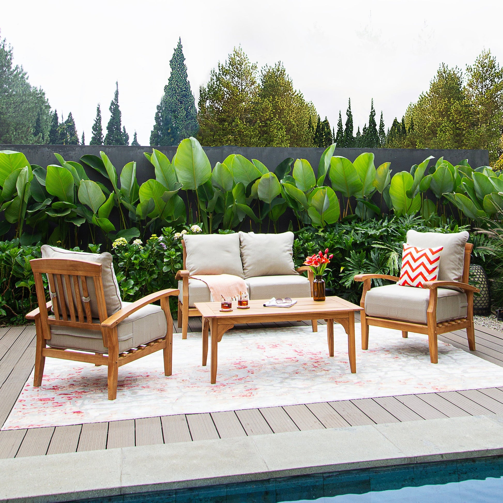 Turn your patio into a farmhouse-style retreat with the Cambridge Casual Caterina 4-Piece Teak Patio Conversation Setperfect for spring and summer hangouts! Made from solid teak wood, this teak patio conversation set is built to last while adding timeless charm to your space.