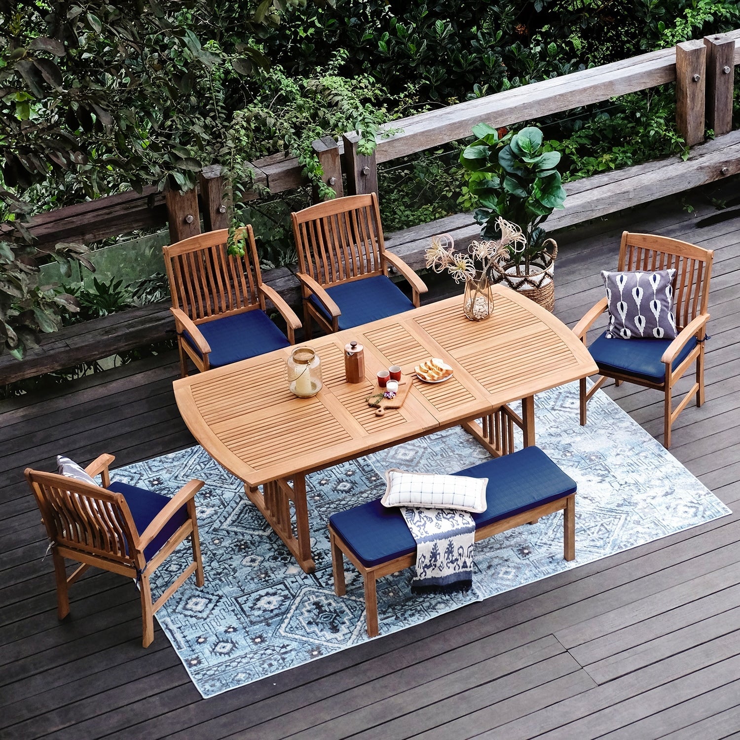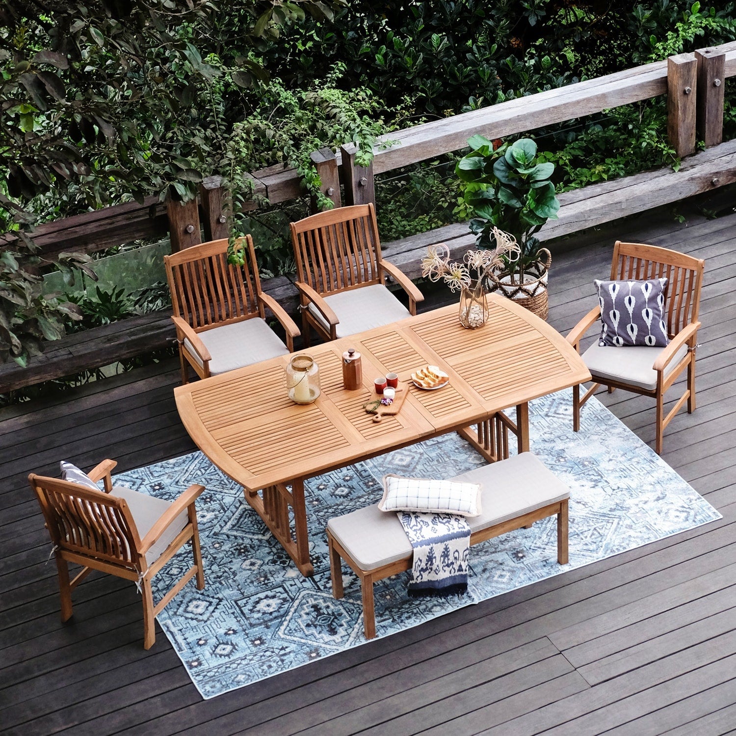 - This teak outdoor dining set includes 4 armchairs, 1 bench, and 1 extendable dining table?