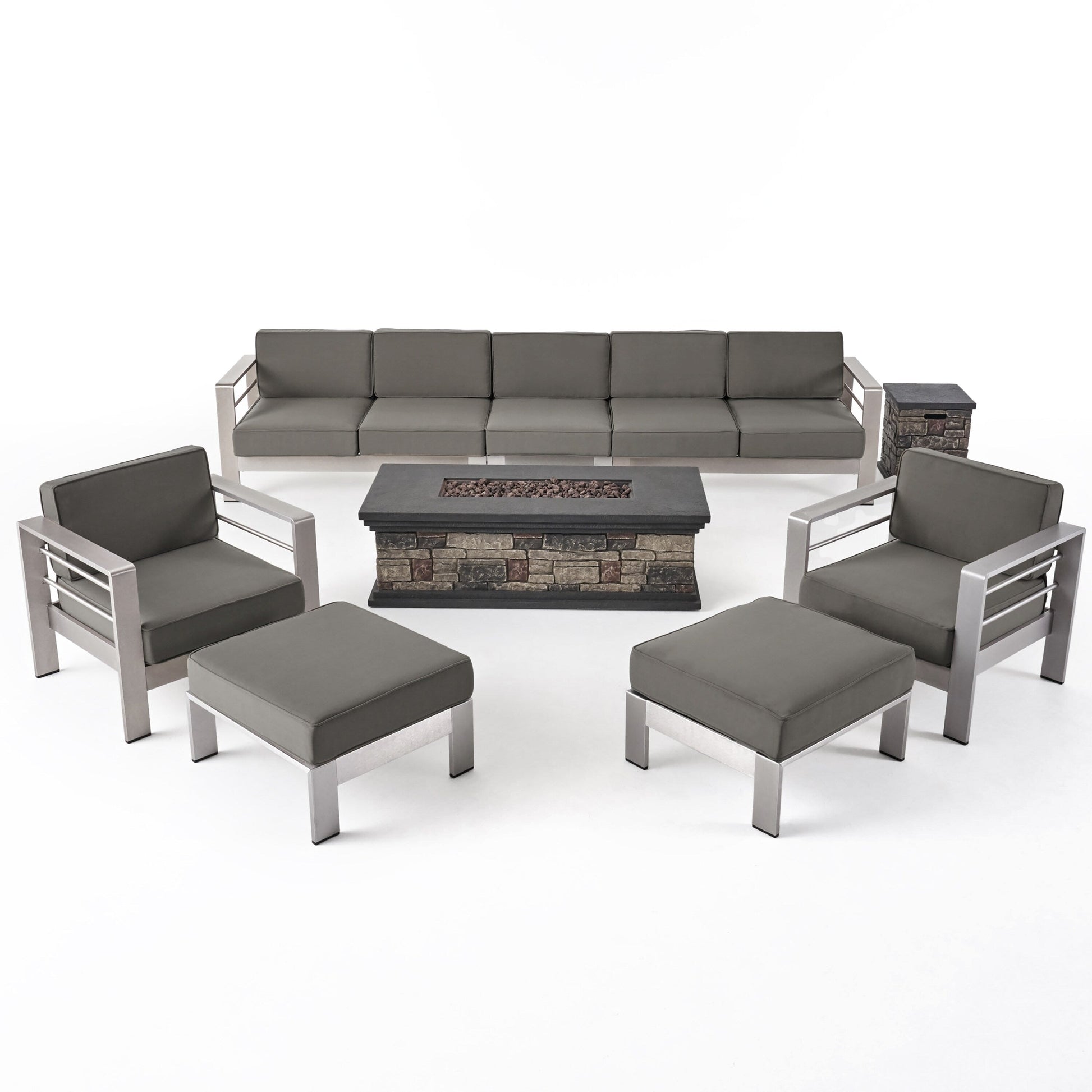 Host the perfect summer party that will last well into the evening with the help of its warm firepit centerpiece and ample seating. Featuring lightweight aluminum and plush water-resistant cushions, our seven-seater set is made for both assuring durability and impressive comfort that can be arranged and rearranged around a cozy firepit centerpiece. With its incredible hosting capabilities, this set is made to adapt to any outdoor space, offering an intimacy that will have you creating long-lasting memories under the starry sky for years to come.