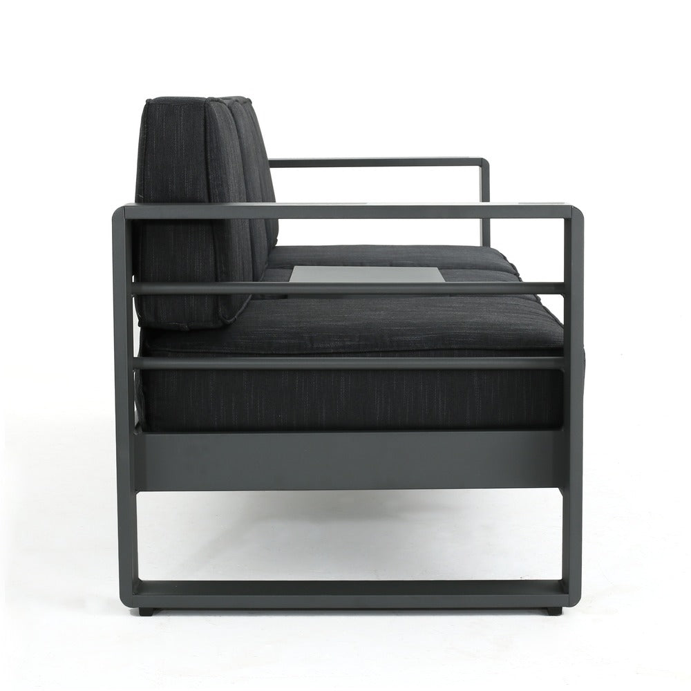 This set perfectly exudes a modern feel to any outdoor living space. With its unique and eye-catching design this set offers taste and functionality to your outdoor space. The combination of natural and industrial looking elements compliments any style of decor and the aluminum and water resistant cushions make this set an immediate statement. Featuring enough seating for 5.