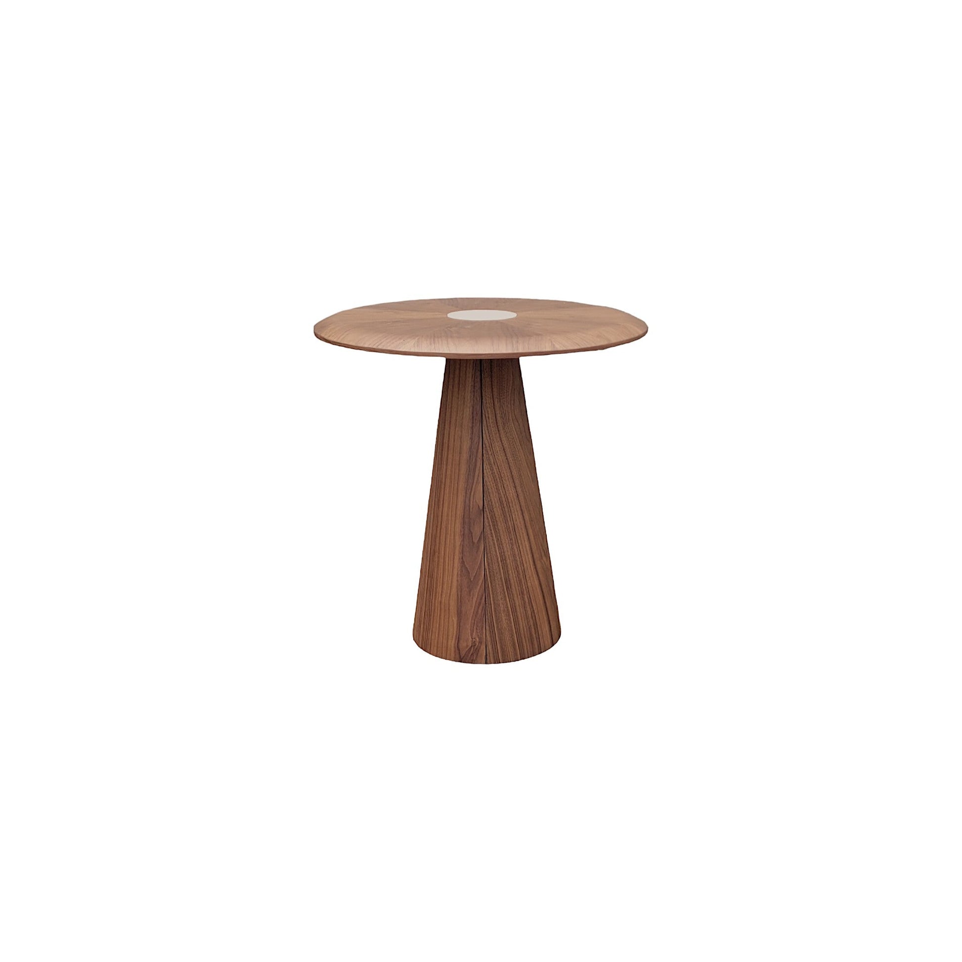 [description] La table d'appoint Cariri en noyer est un meuble d'appoint emblématique du design moderne. Cette table d'appoint ronde est idéale comme meuble d'appoint dans un salon contemporain. Elle est dotée d'un plateau rond en bois aux bords arrondis et d'un plateau rond en bronze Calacatta TS, soutenu par un piètement conique unique en noyer. Un design élégant et une finition soignée pour un salon.