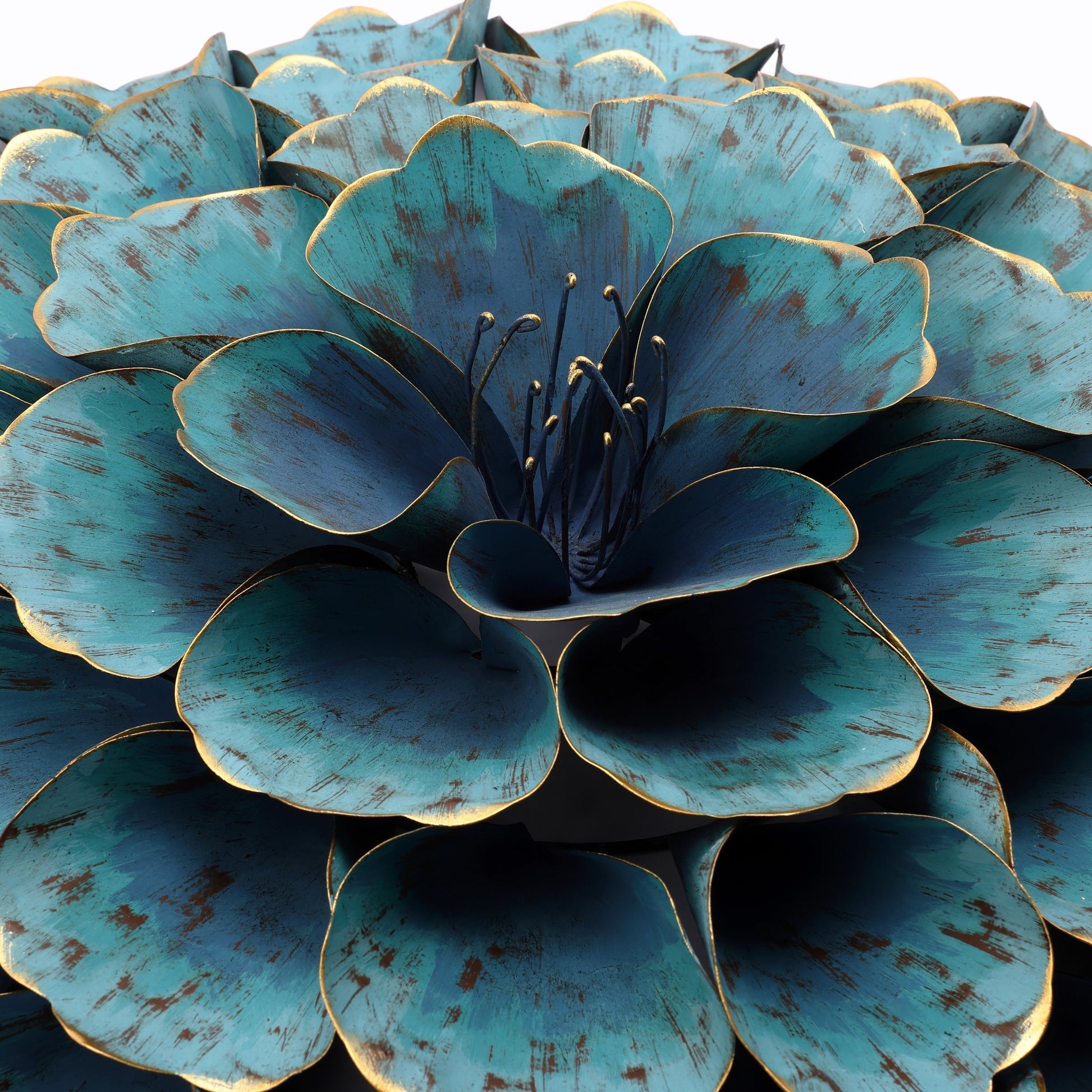 - Handcrafted iron floral wall art with distressed teal blue finish and gold tip accents