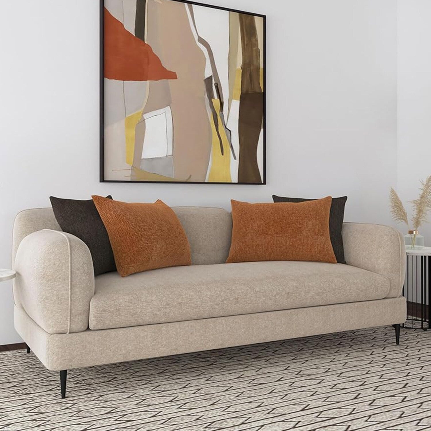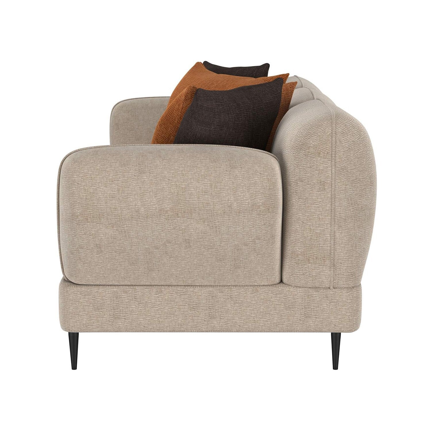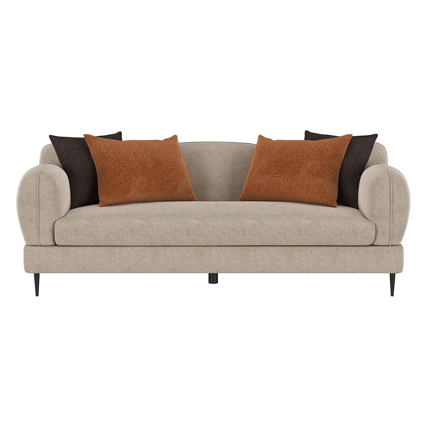 Experience a sophisticated blend of architectural design and plush comfort with this sofa. Its waterfall bench seat offers a seamless look, supported by a sinuous spring seat deck and full foam cushioning for superior comfort. The latte chenille upholstery provides a subtle textured appeal, complemented by sculpted round arms and a matching back that mirror each other's clean lines. Reversible rust and chocolate accent pillows add warmth, while sleek, tapered metal legs complete its contemporary charm.