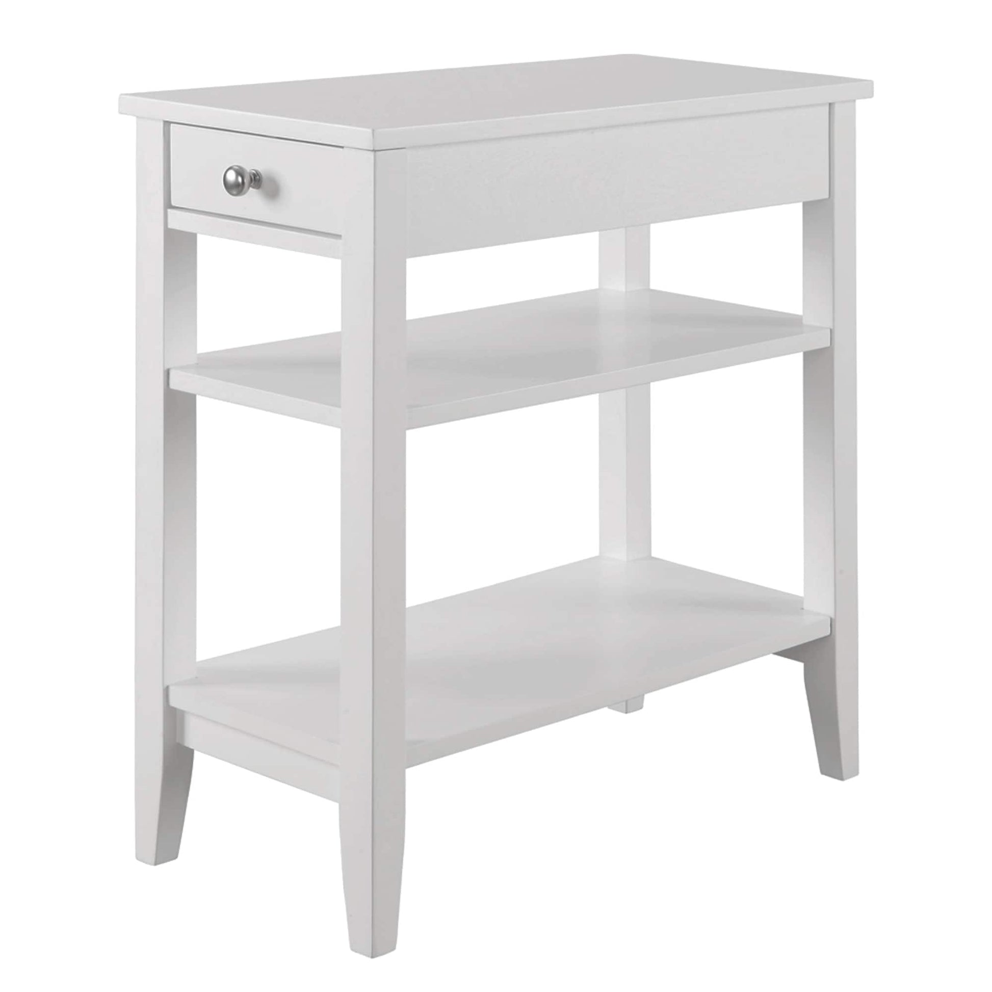 Classic yet simple in style; the American Heritage 1 Drawer Chairside End Table with Shelves by Convenience Concepts brings interior design to a new level. Available in multiple finishes; this transitional versatile chairside table is sure to upgrade any living space. The classic design of this beautiful piece also includes three spacious tiers of shelving for decor or family room necessities. A smooth nickel drawer knob on the pull-out drawer allows for easy access to concealed entertainment essentials. Built from manufactured wood and solid wood; this unit is sure to stand the test of time. This side table is complete with a smooth non-lead-based paint finish. Shop and style your favorite living space with beautiful coordinating pieces from the American Heritage Collection by Convenience Concepts; each sold separately.