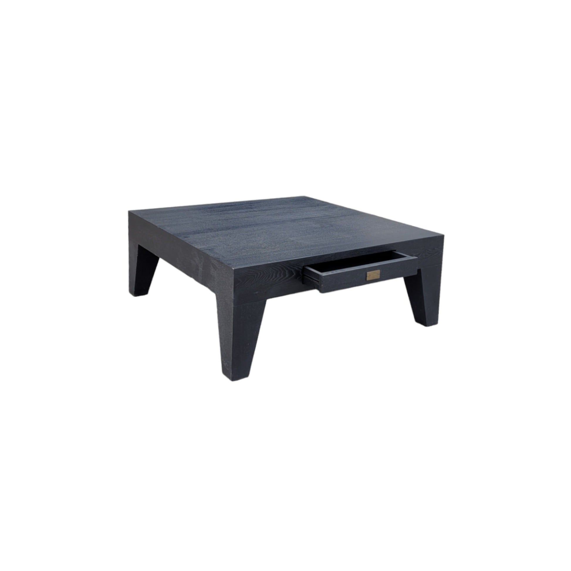 La table basse carrée Accento est réalisée en placage de chêne teinté noir mat. Elle est dotée d'un petit tiroir orné d'une poignée en bronze. Elle est de grande taille.