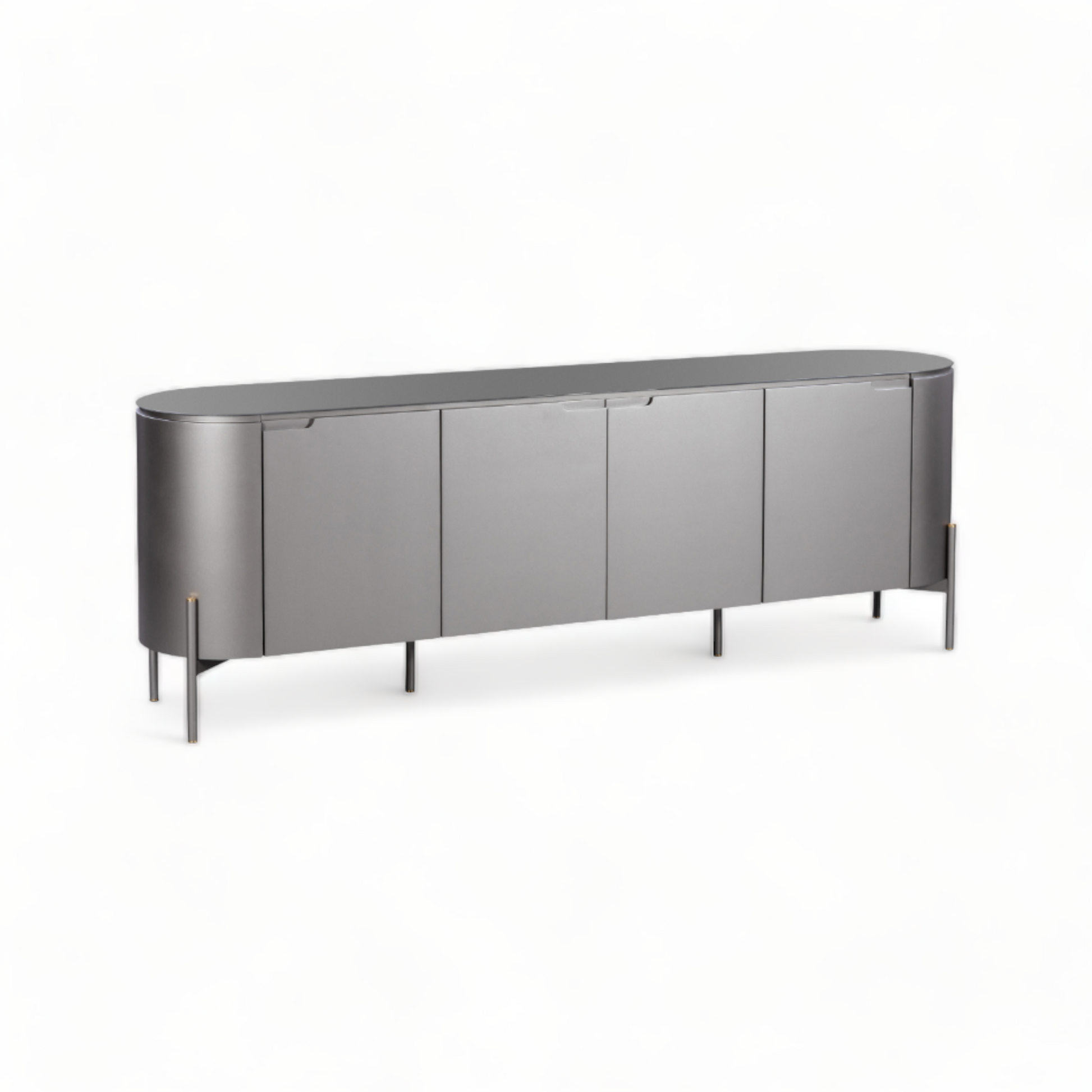 contemporain et sophistiqué fonctionnel pour la salle à manger forme courbée Cadre laqué métallisé mat graphite avec quatre portes Étagères intérieures Plateau en verre couleur graphite pieds ronds en métal idéal pour les salles à manger modernes fabriqué au Brésil |