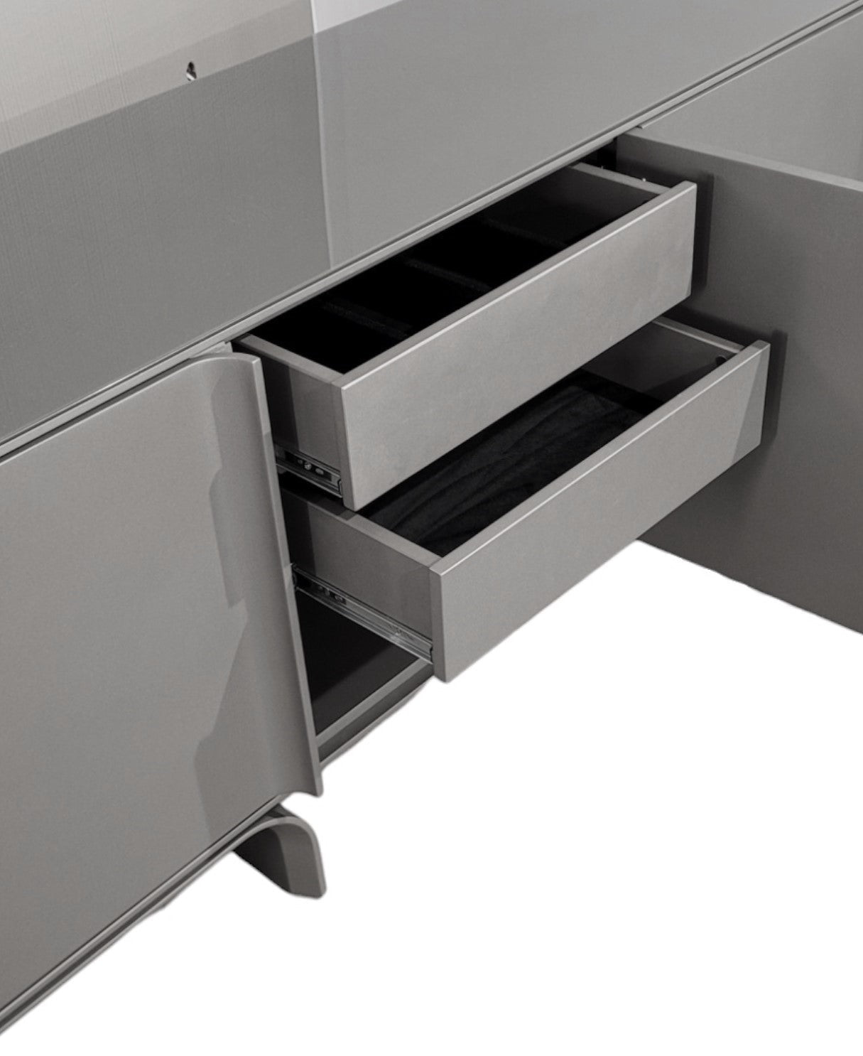 contemporain et sophistiqué fonctionnel pour la salle à manger forme rectangulaire Cadre laqué métallisé mat graphite avec quatre portes Étagères intérieures 2 tiroirs intérieurs rembourrés de velours Plateau en verre couleur graphite pieds en bois de forme courbée en laque graphite idéal pour les salles à manger modernes fabriqué au Brésil |