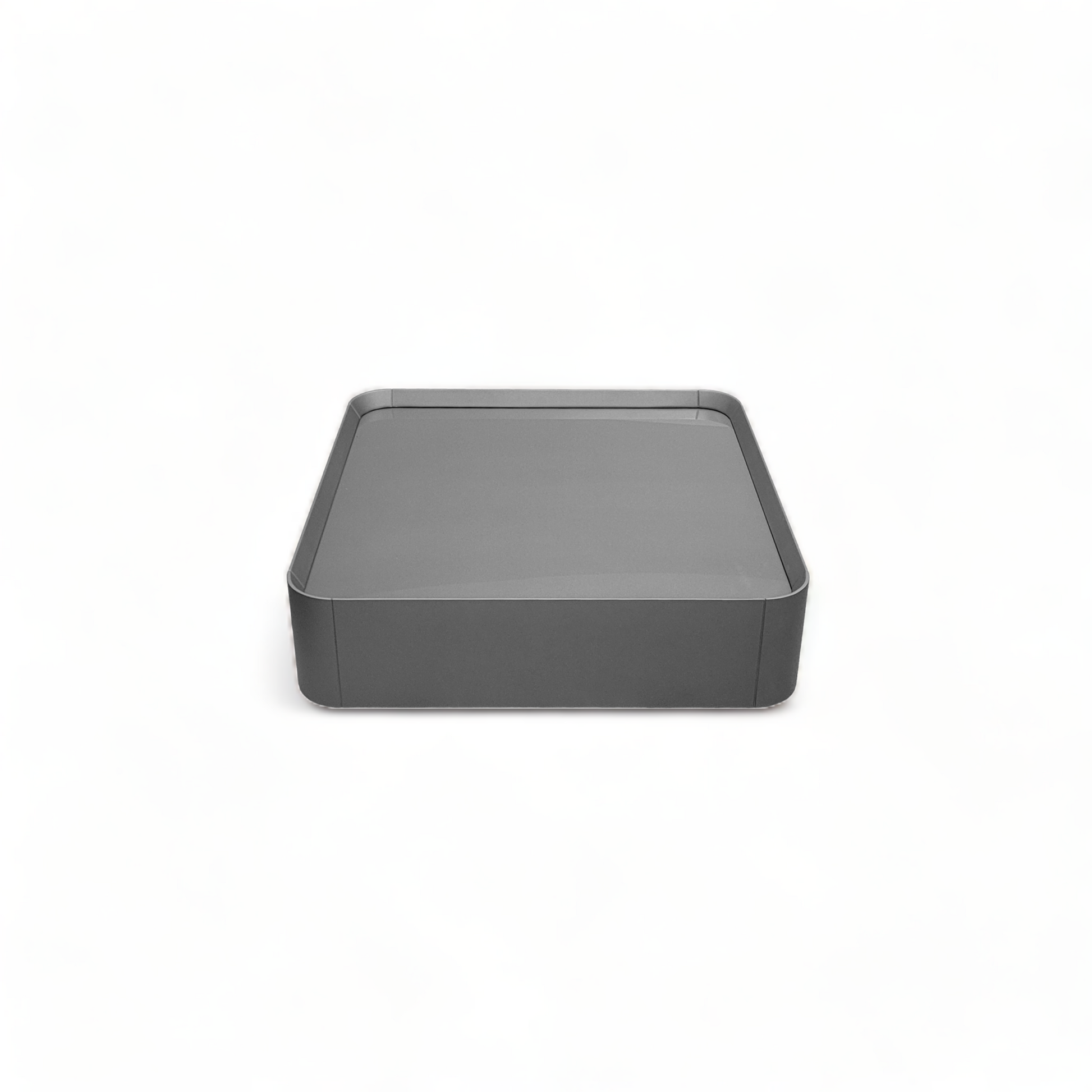 contemporain et sophistiqué fonctionnel et polyvalent forme carrée avec des bords courbes laqué en finition métallique mate graphite plateau en verre couleur graphite parfait pour les salons de luxe plateau en verre fumé |