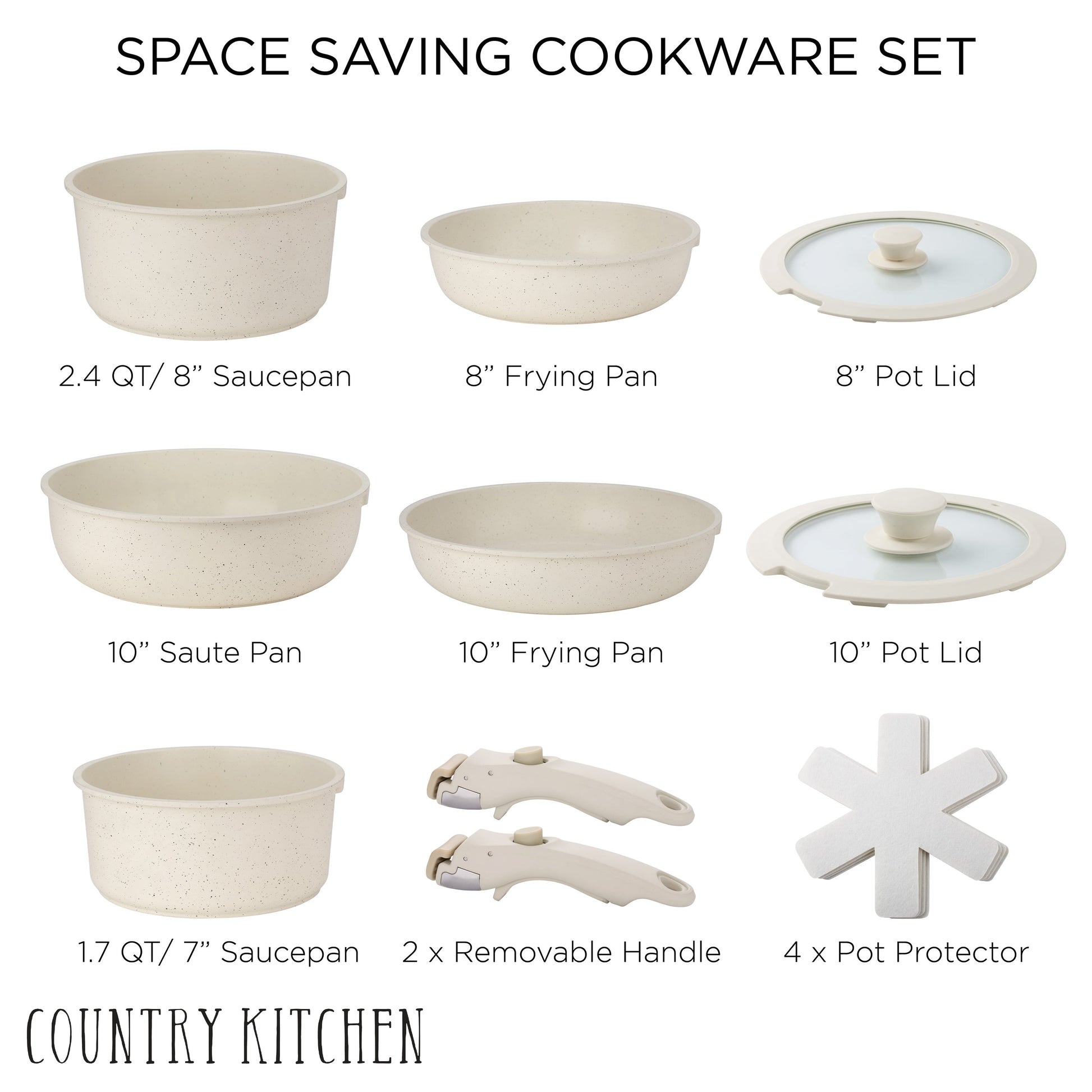 Country Kitchen RV Cookware- 13 Piece Aluminum Pots and Pans with Removable Handle Oven Safe