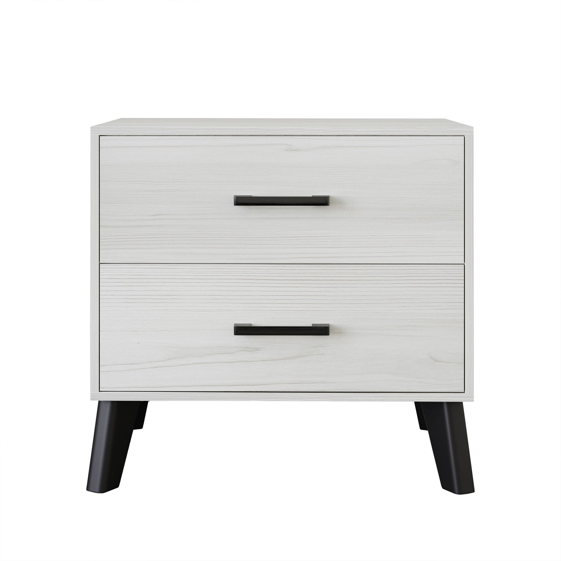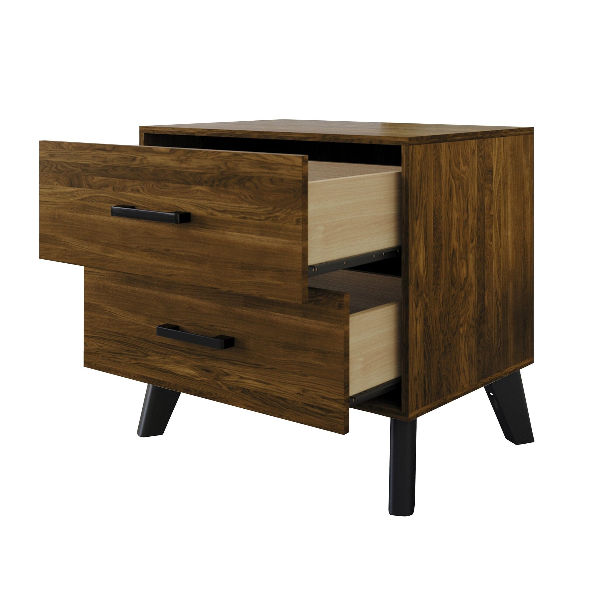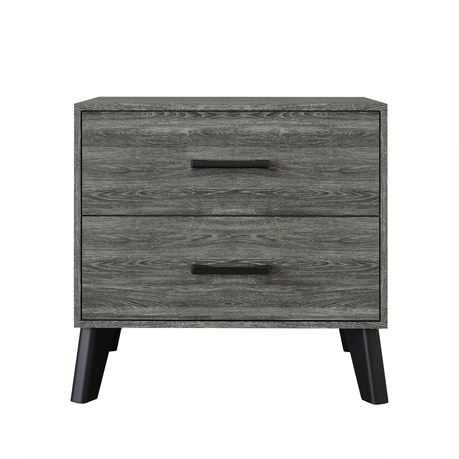 Enhance your bedroom's ambiance with this contemporary rustic nightstand. Crafted with both style and functionality in mind, our nightstands are the epitome of sophistication and convenience. It seamlessly blends with your existing furniture for a stylish, cohesive look. Featuring two spacious drawers and spacious top, keep your essentials within arm's reach. Say goodbye to clutter as you organize books, chargers, and more in these carefully designed compartments. Each nightstand is expertly crafted using durable solid and engineered wood, ensuring long-lasting durability and timeless appeal. Invest in furniture that not only looks stunning but also stands the test of time. Supported by black-finished wooden legs, it exudes charm and provide unwavering stability, ensuring your belongings are safe and secure. Arrives in a single package with clear instructions for easy assembly. Available in Brown, Dark Grey, and Light Grey to match your style. Enhance both elegance and practicality in your bedroom with this versatile addition. Your dream nightstand in your favorite hue awaits - start exploring now!