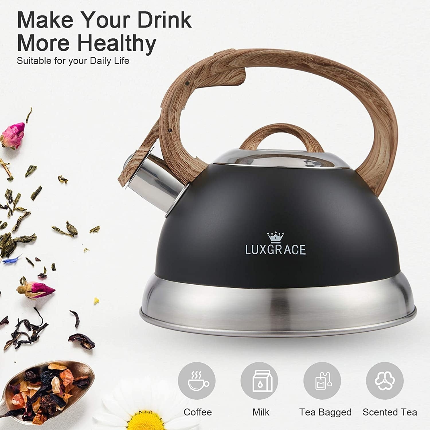 Creative Home 2.3 Qt. Stainless Steel Whistling Tea Kettle Teapot with Ergonomic Wood Rubber Touching Handle, Opaque Black