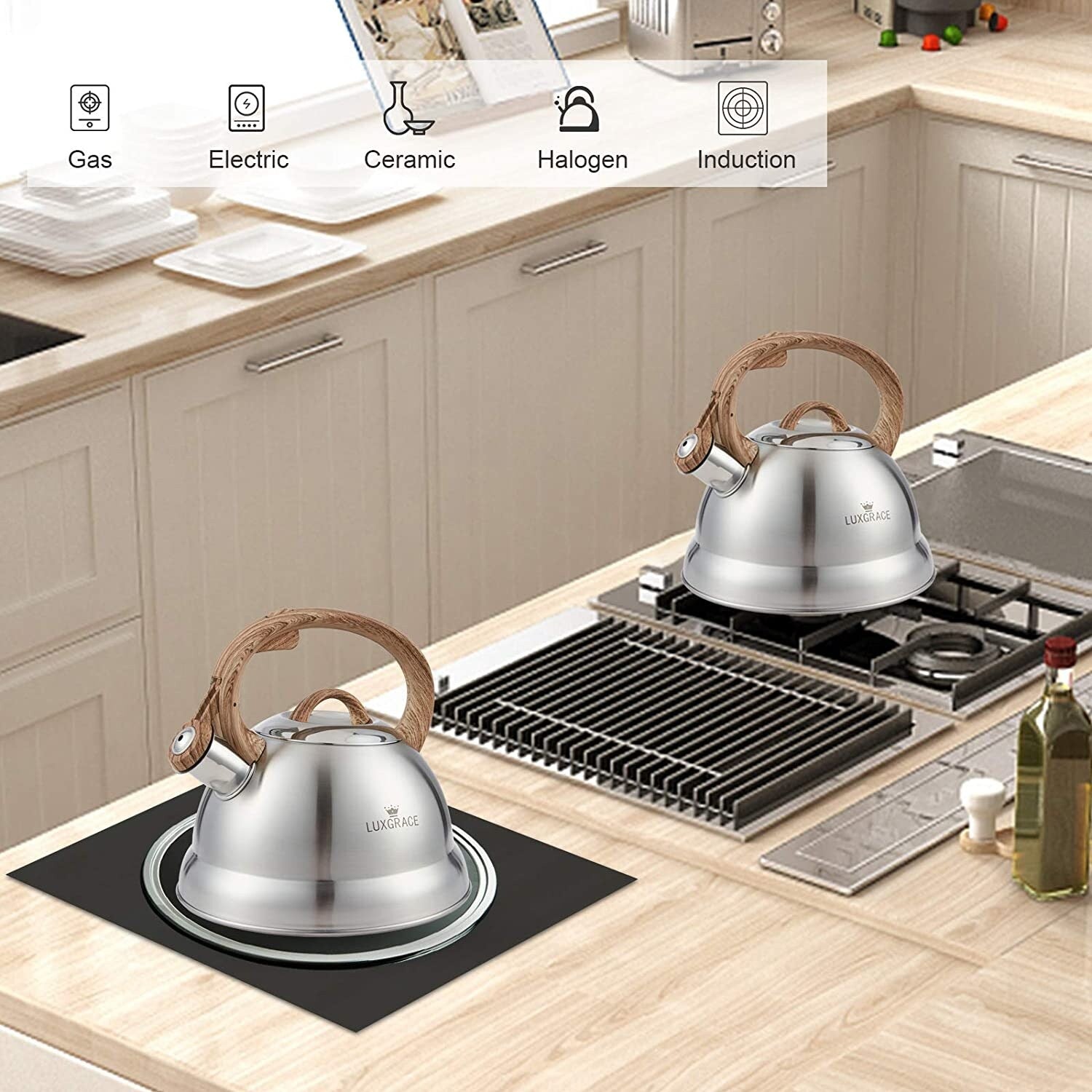 This 2.3 Quarts stainless steel whistling stovetop tea kettle is crafted of high quality stainless steel. Whistles when boiling, can be used on gas, electric, induction, halogen, and radiant stovetops. The tea kettle heats up quickly and retains heat well. Convenient trigger mechanism on the handle allows for the safe and easy pour. Removable lid for easy filling and convenient one finger flip spout for easy and safe pouring.The satin finish on the kettle body, this sophisticated design tea kettle is also perfect embellishment for your kitchen.