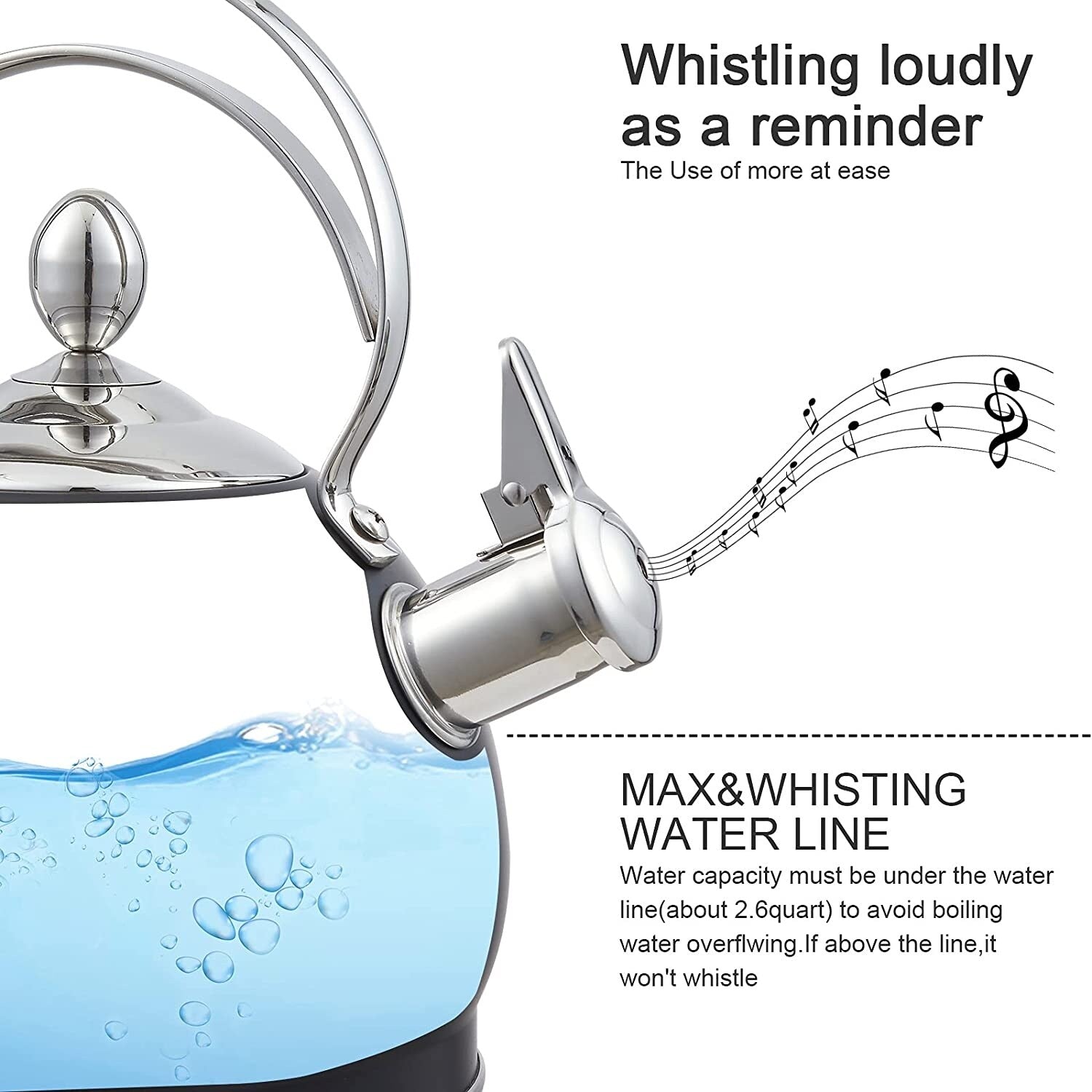 - Proper Capacity: 2.5 QT stainless steel tea kettle is saves your time and energy, suitable for family use. The teapot larger opening makes it easy to fill and clean the stove top tea pot. The unique design of the opening angle of the spout can not only open the lid and fill with water, but also quickly fill with water through the spout.
