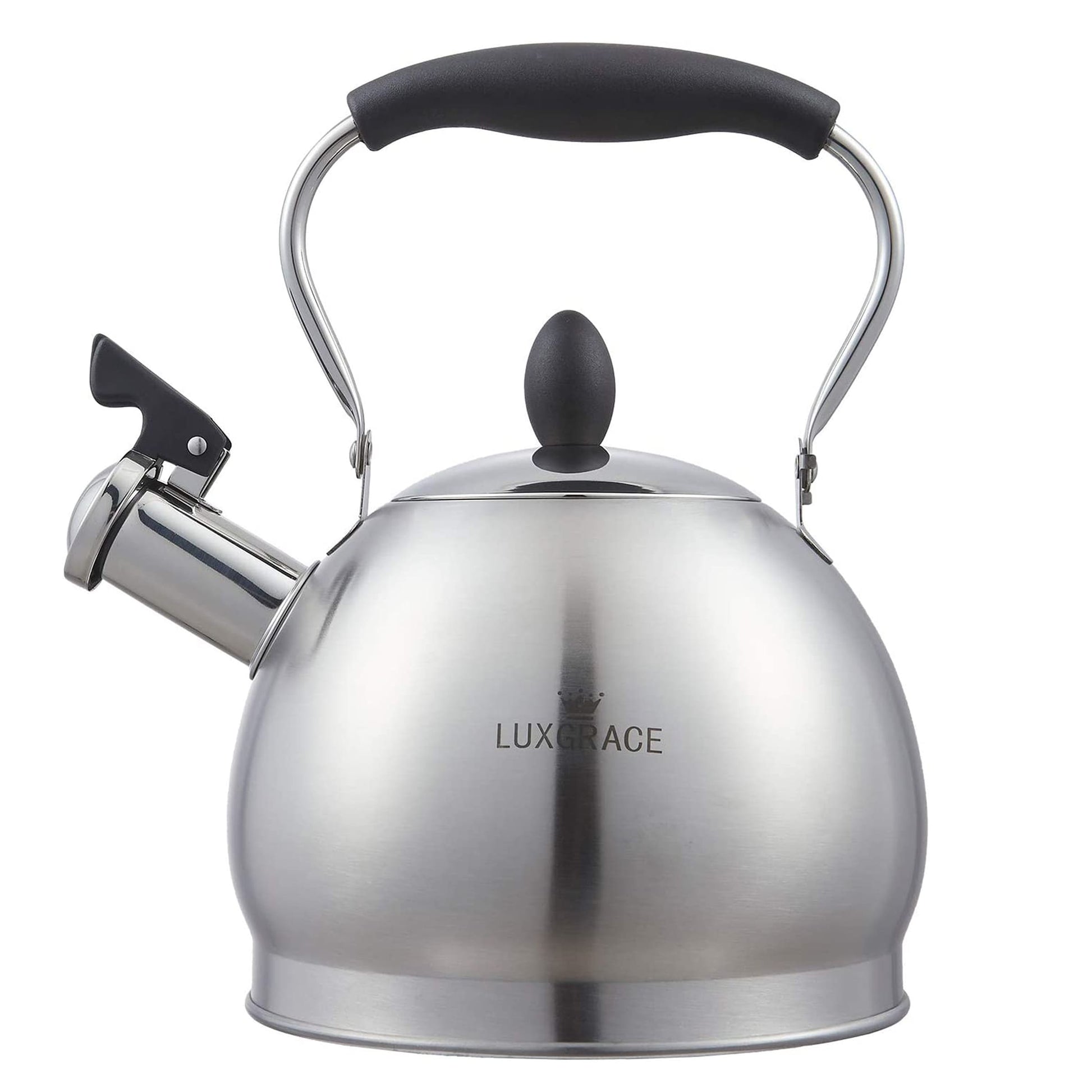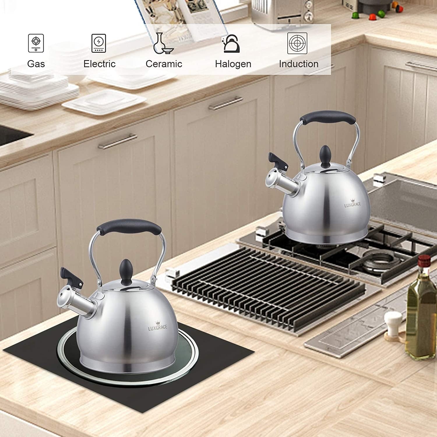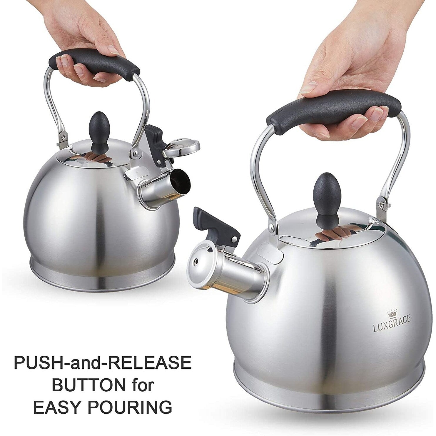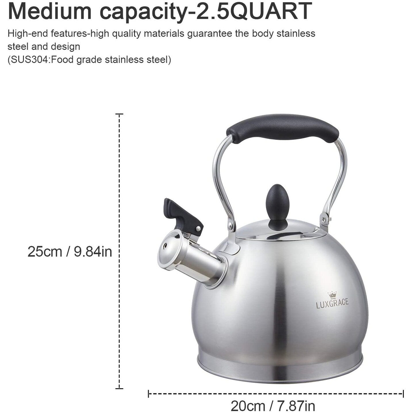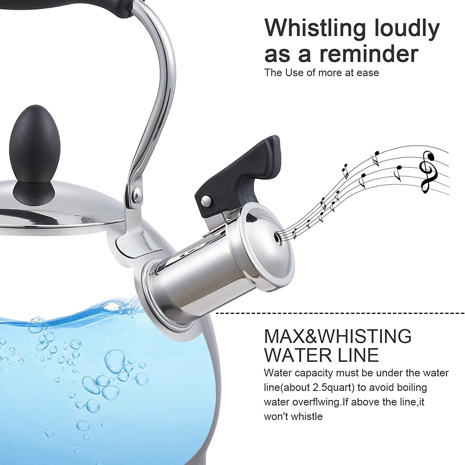This 2.6 Quarts whistling stainless steel stovetop tea kettle is crafted of high quality stainless steel. Whistles when boiling, can be used on gas, electric, induction, halogen, and radiant stovetops. The tea pot heats up quickly and retains heat well. Encapsulated bottom provides even heat distribution. Convenient trigger mechanism allows for the safe and easy pour. Removable lid for easy filling and convenient one finger flip spout for easy and safe pouring.The satin finish on the kettle body, this sophisticated design tea pot is also perfect embellishment for your kitchen.