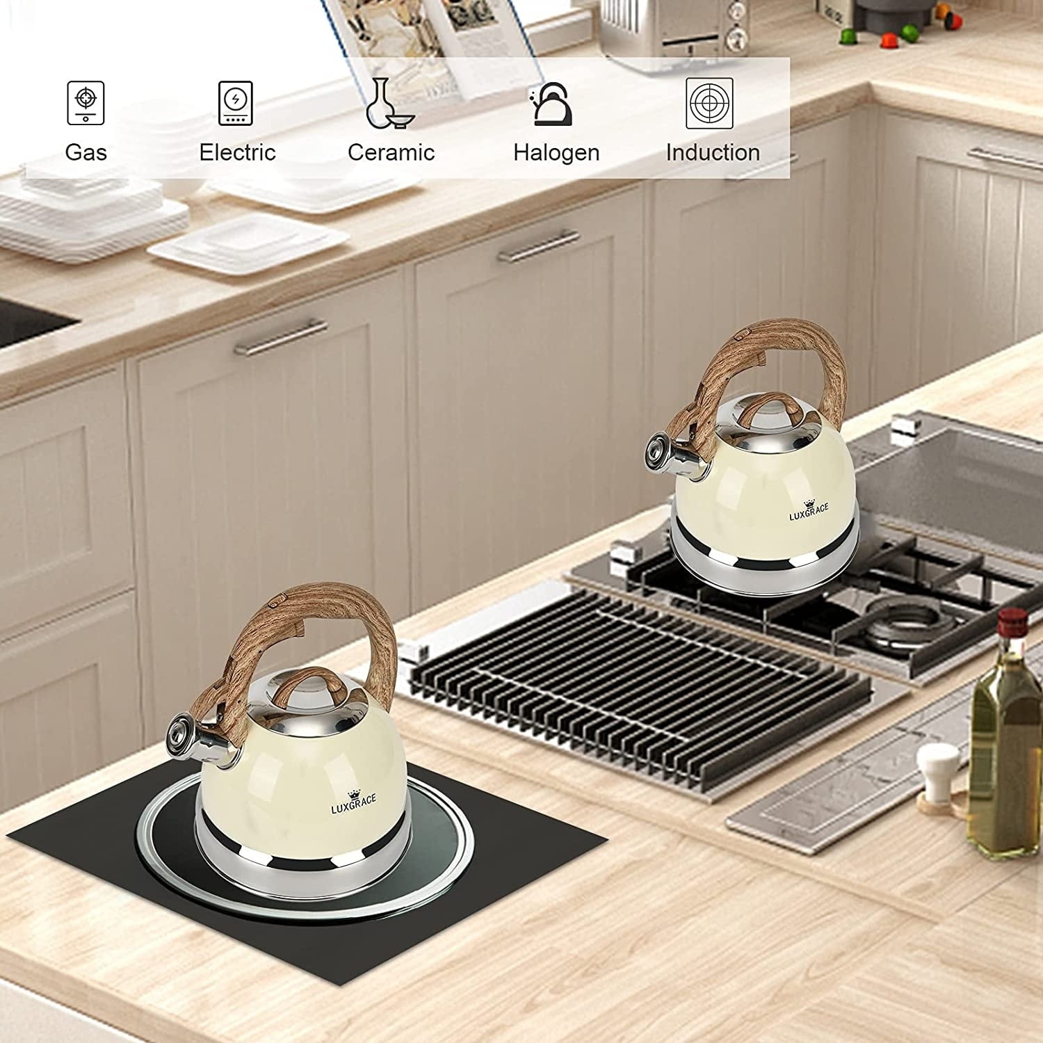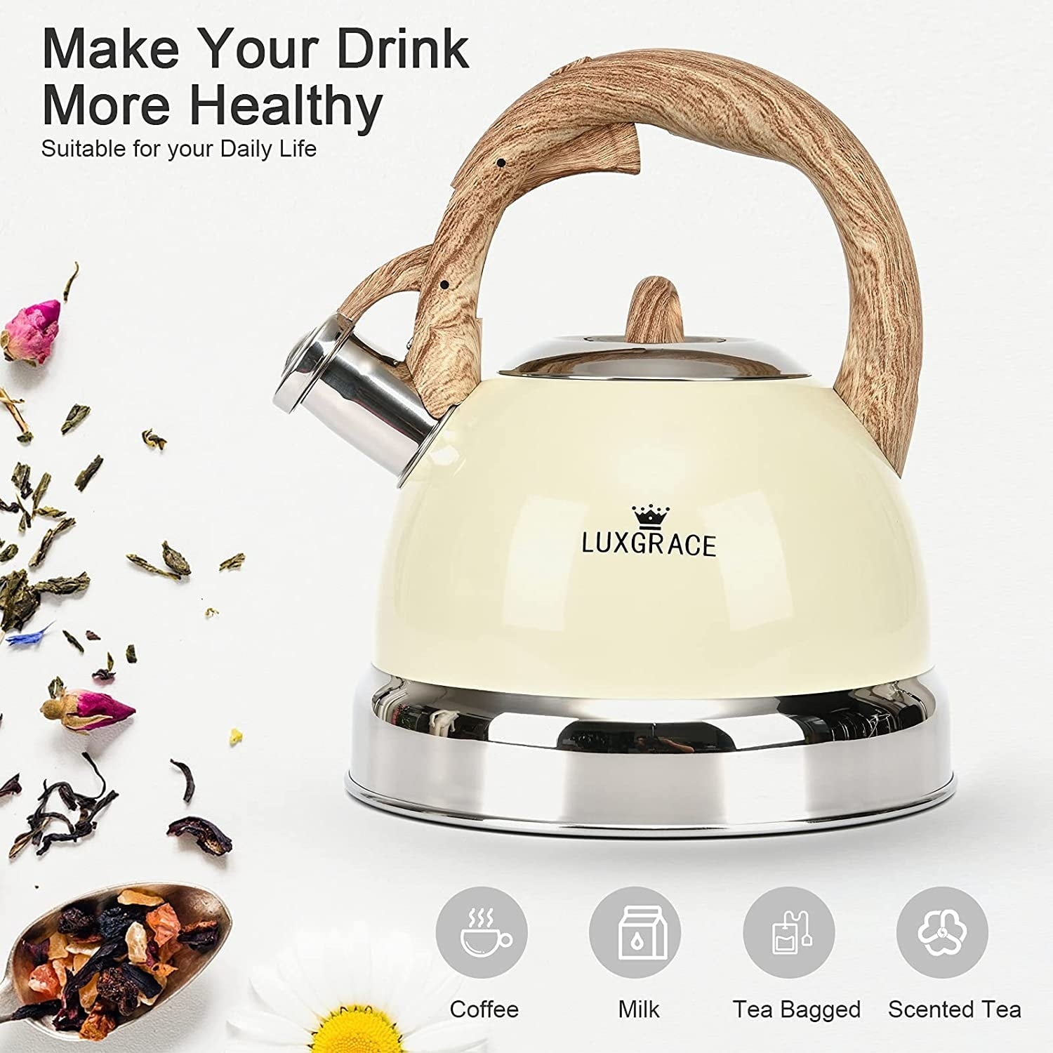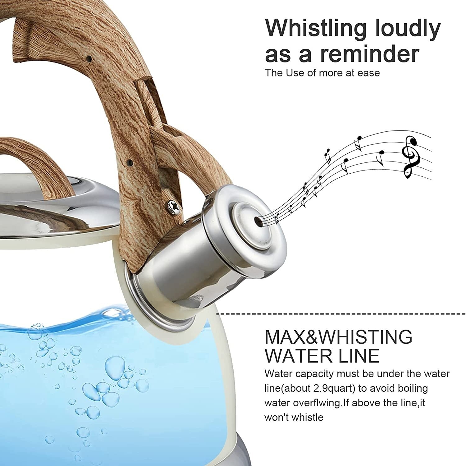This 3.0 Quarts whistling stainless steel stovetop tea kettle is crafted of high quality stainless steel. Whistles when boiling, can be used on gas, electric, induction, halogen, and radiant stovetops. The tea kettle heats up quickly and retains heat well. Convenient trigger mechanism on the handle allows for the safe and easy pour. Removable lid for easy filling and convenient one finger flip spout for easy and safe pouring.The powder coating finish on the kettle body, this sophisticated design tea kettle is also perfect embellishment for your kitchen.
