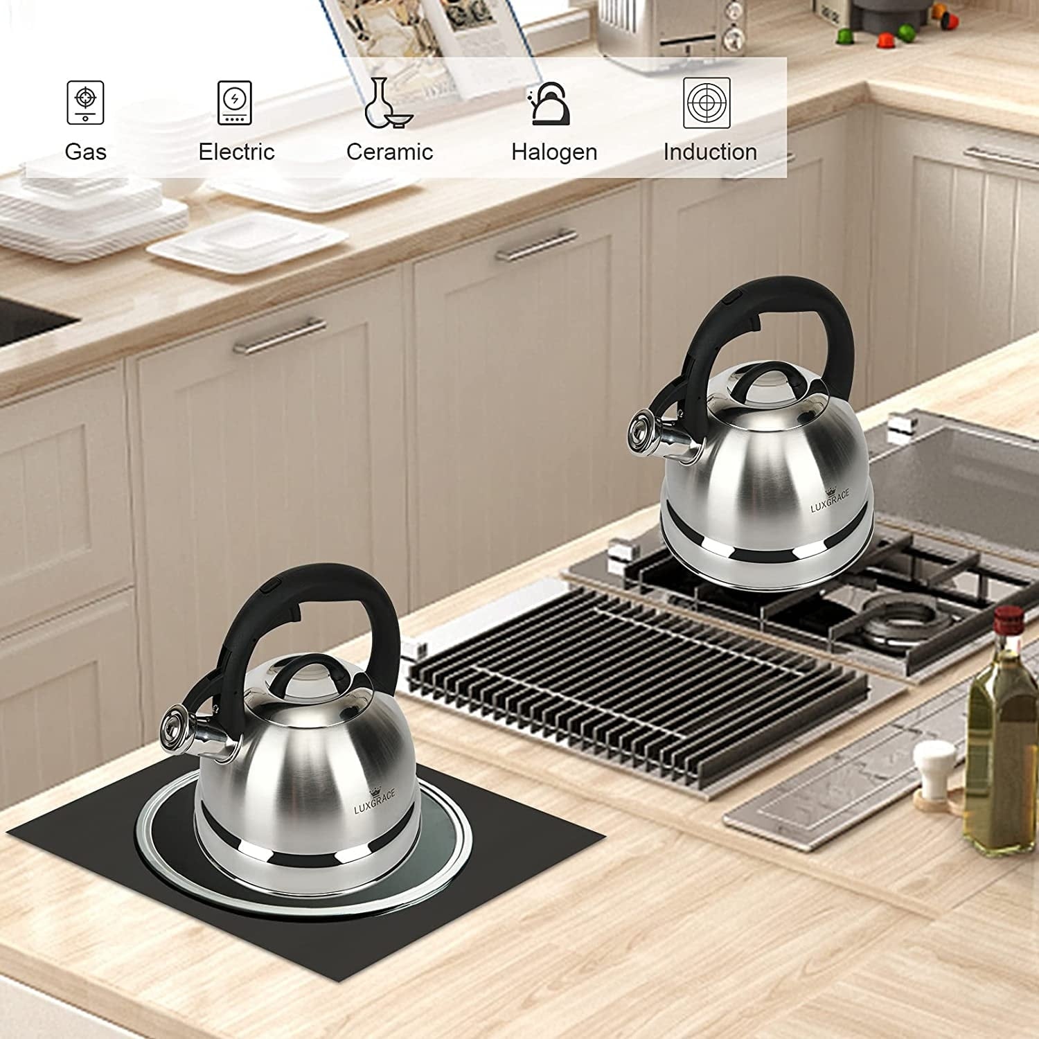 This 3.0 Quarts whistling stainless steel stovetop tea kettle is crafted of high quality stainless steel. Whistles when boiling, can be used on gas, electric, induction, halogen, and radiant stovetops. The tea pot heats up quickly and retains heat well. Convenient trigger mechanism on the handle allows for the safe and easy pour. Removable lid for easy filling and convenient one finger flip spout for easy and safe pouring.The satin finish on the kettle body, this sophisticated design tea kettle is also perfect embellishment for your kitchen.