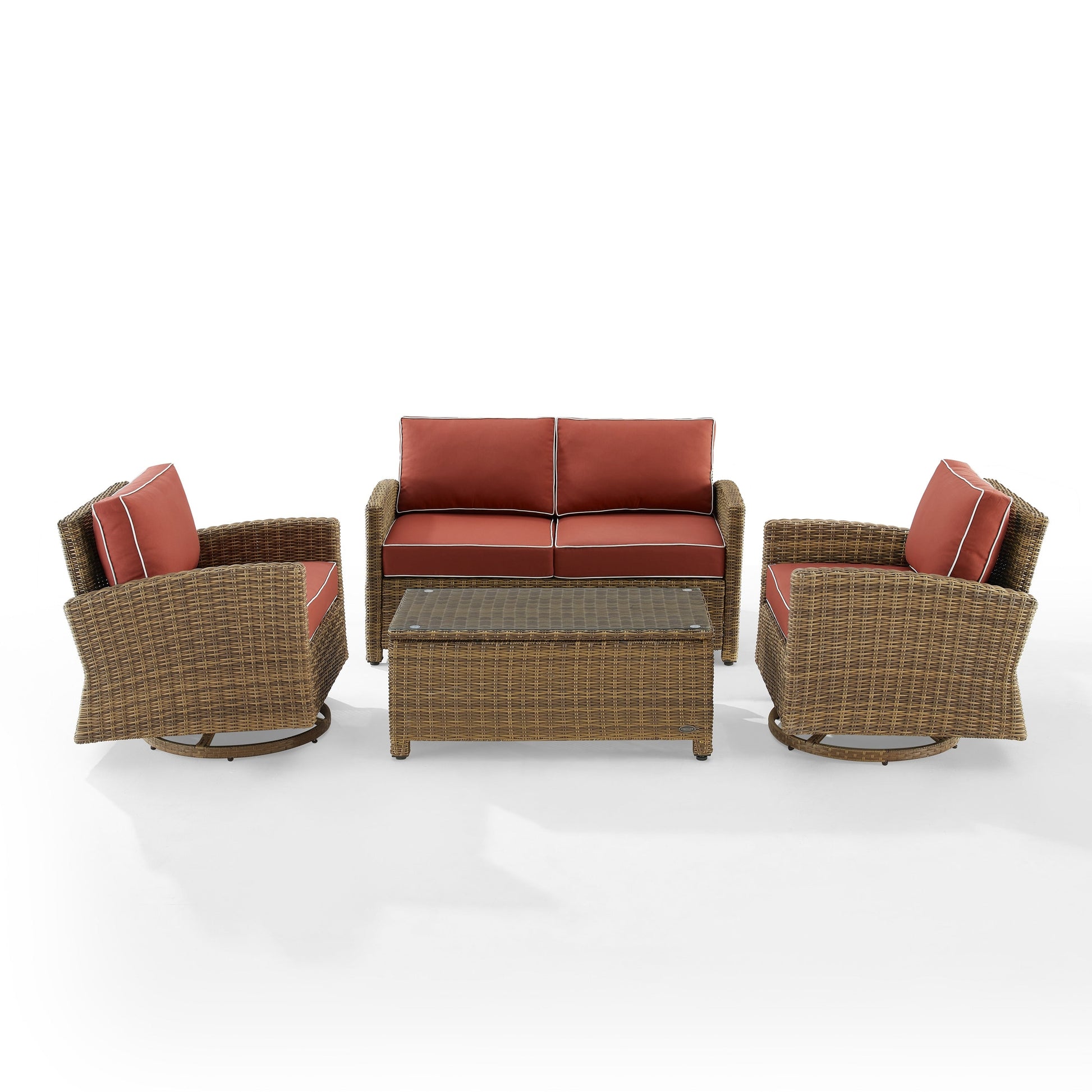 Unwind in style with the Bradenton 4Pc Swivel Rocker Conversation Set. Enjoy the smooth and easy motion of the swivel rockers and loveseat, each featuring a sturdy steel frame wrapped in all-weather wicker. The thick moisture-resistant cushions provide comfort while the glass-top coffee table ties the set together. Choose from a variety of cushion covers including neutral sand, navy with white piping, deep sangria with white piping, gray, and white. Entertain outdoors with ease and style with the Bradenton conversation set.