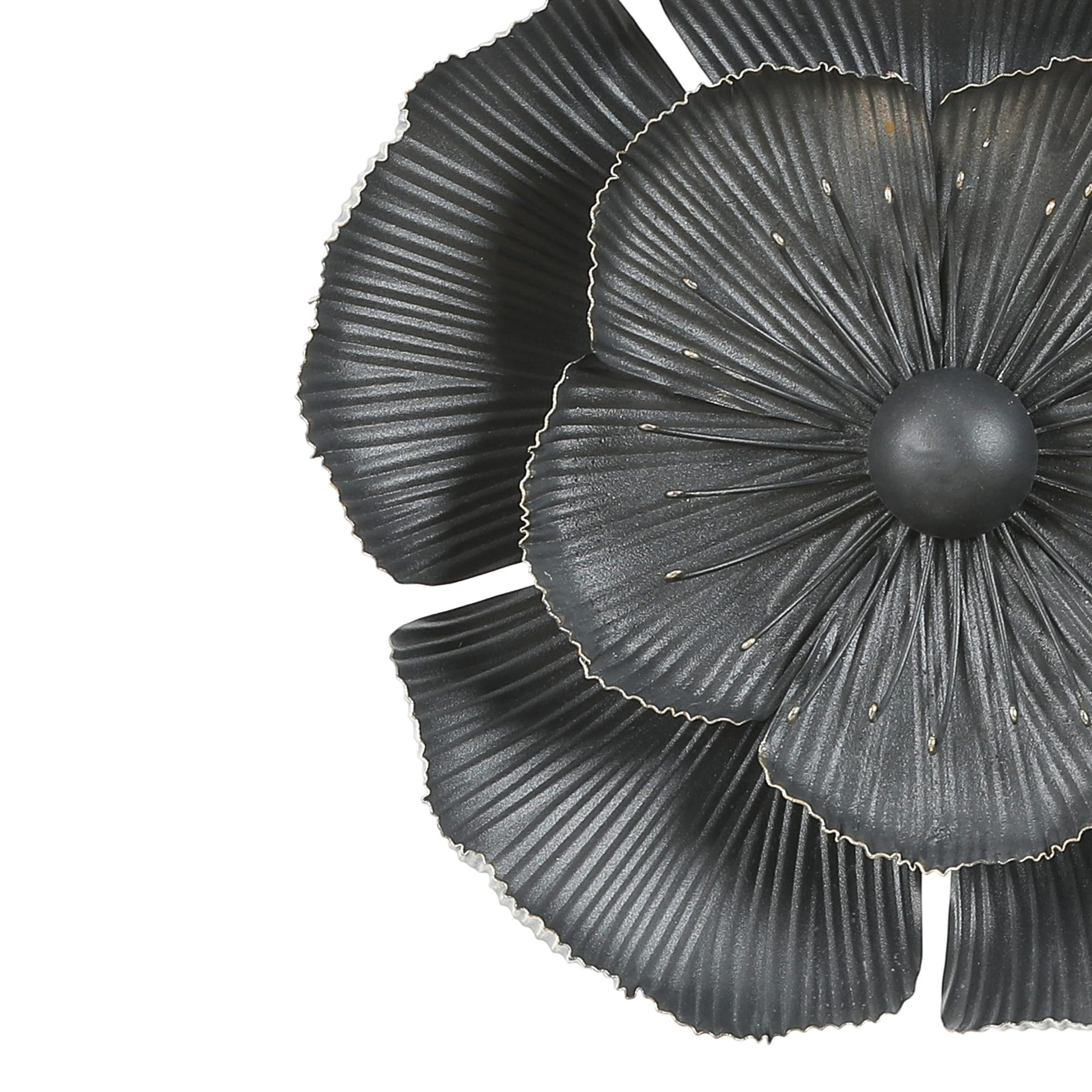 Transform your home with this elegant dark gray and gold metal flower wall decor set. The gold accents at the tips of the petals beautifully contrast with the dark finish, making it a versatile addition that complements a variety of color palettes, especially when placed against a light-colored wall. Each piece is meticulously handcrafted from high-quality metal, bringing both visual interest and a touch of sophistication to any room. Hang each piece individually to enhance a larger space or arrange them as a cohesive series for a more sophisticated look. The largest piece measures 16.9 inches in diameter, the medium piece is 13.98 inches, and the smallest is 11.6 inches in diameter. These wall sculptures are ideal for those who have an eye for the unique and a taste for modern design.