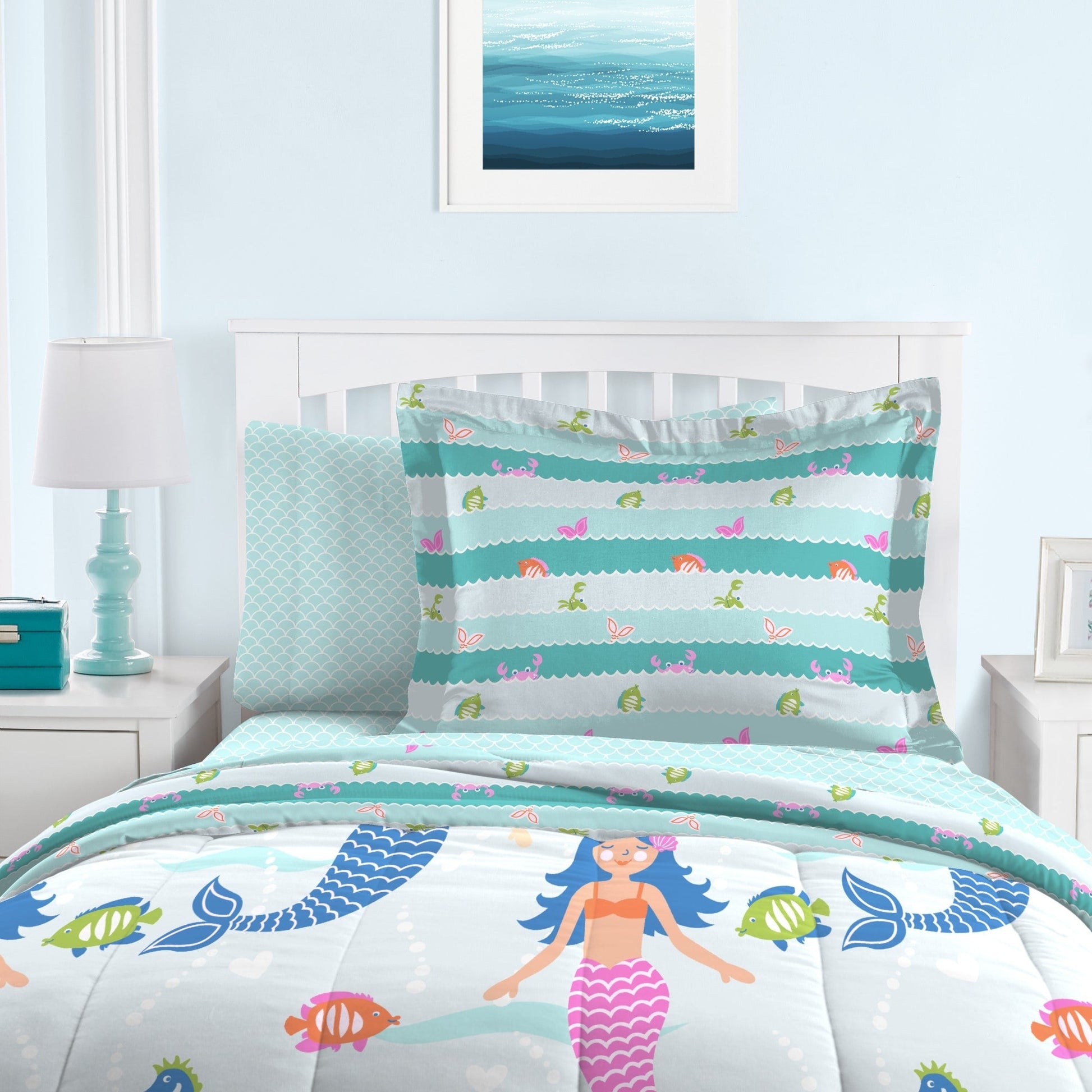 Bring a sense of whimsy to your child's bedroom with the Mermaid Dreams seven-piece bed-in-a-bag set. Featuring shams and a complete sheet set, this comforter set provides a polished look out of the bag. Made from ultra soft microfiber, the set is durable and long lasting, and machine washable for convenience.