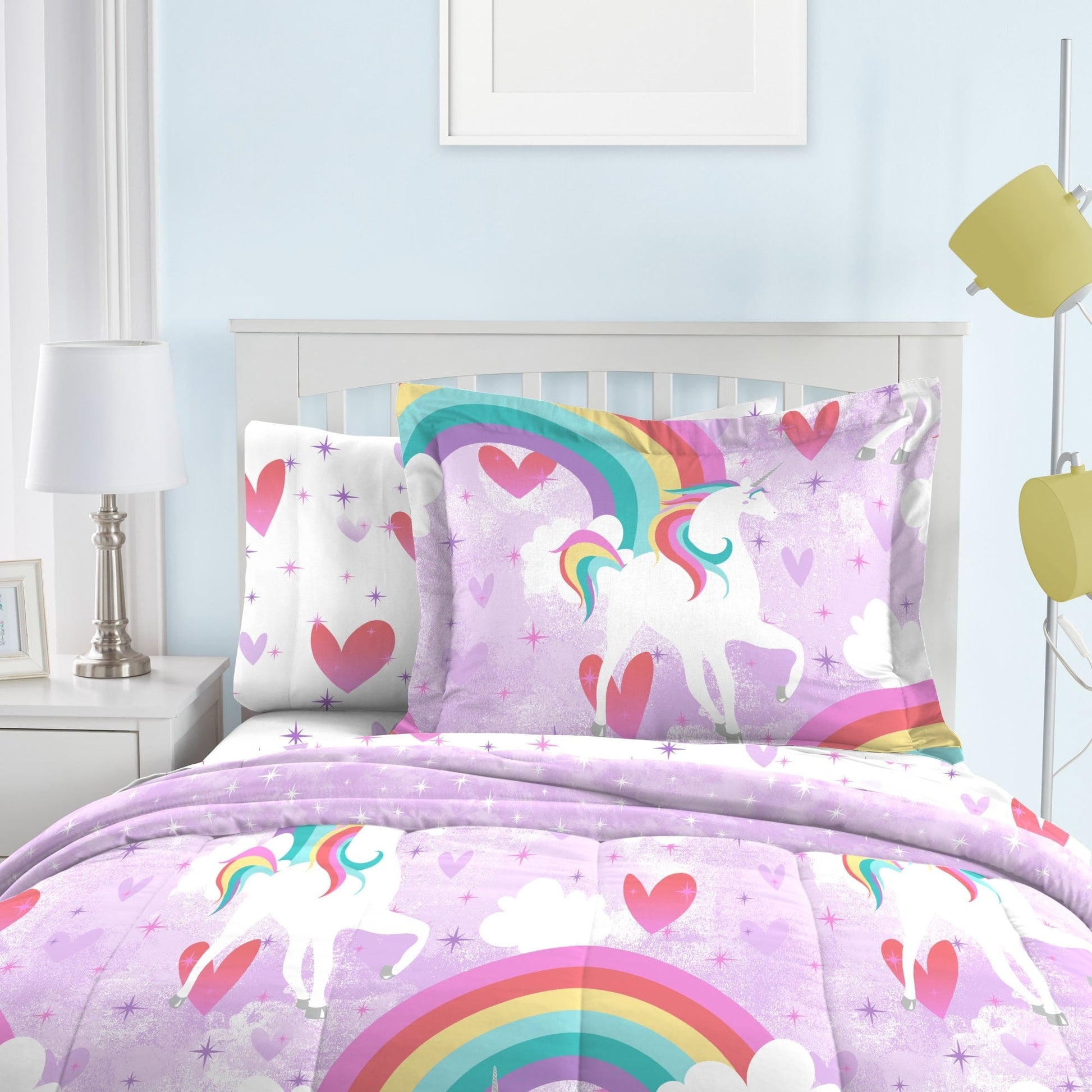 Create a magical and colorful bedroom for your little princess with Dream Factory's Unicorn Rainbow Bed in a Bag set. This complete bedding set features a whimsical design of rainbow unicorns, hearts, and clouds on a pink background, perfect for sparking your child's imagination. The microfiber comforter, sham, and sheet set are incredibly soft to the touch and easy to care for with machine washable materials. The comforter is stuffed with 100% polyester fill for year-round warmth and comfort. With coordinating curtains, throw pillows, and wall art, you can easily transform your child's room into a unicorn-themed wonderland.
