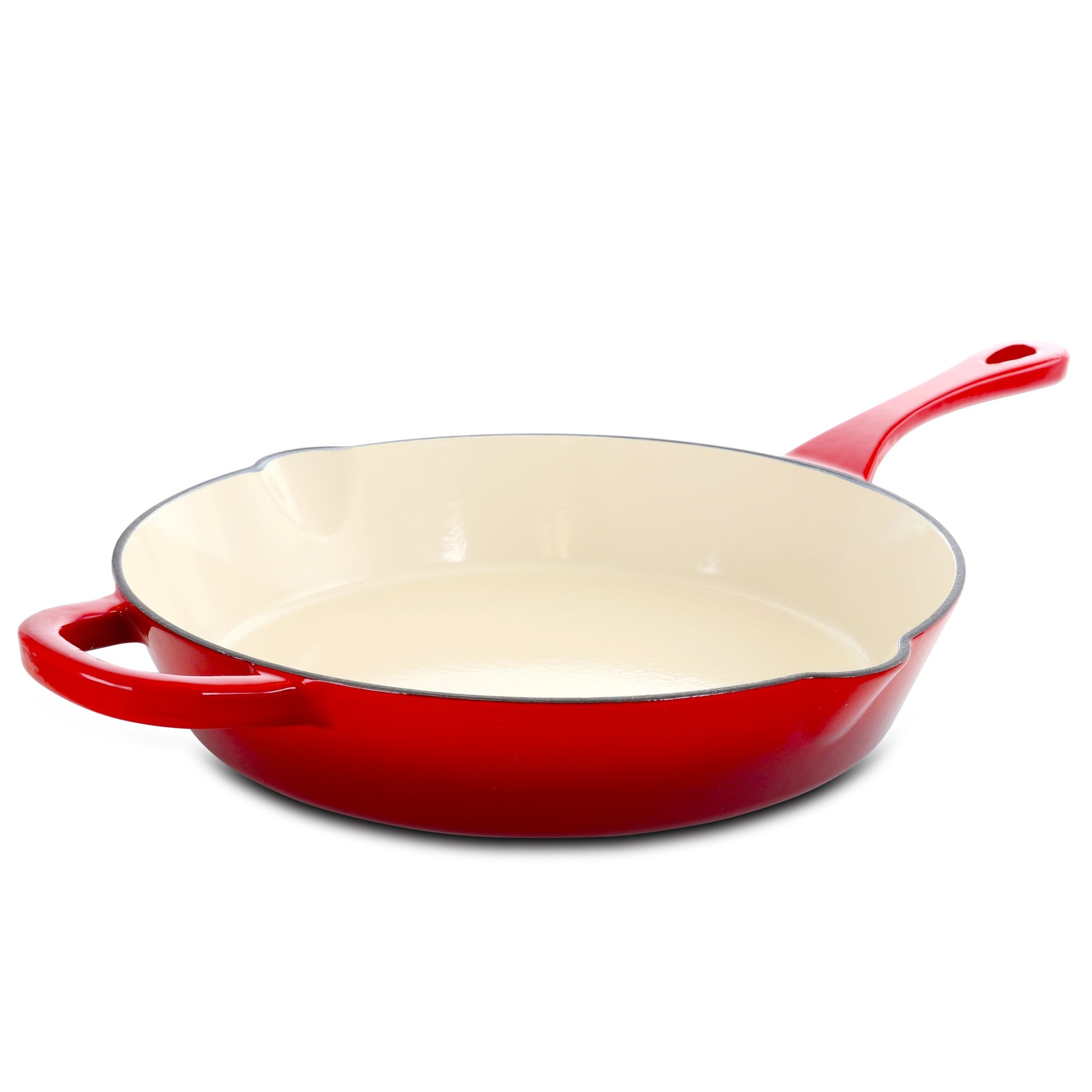 Bump up the heat to 11 and dish out your best meals with the 12 inch enameled cast iron skillet in scarlet red. The cookware's generous size allows for family sized meals and the 2 handles makes it easier to transfer the pan from stove top to oven. Made of an enameled cast iron construction, this heavy duty skillet will last many years. Saute some chicken and toss in some butter and mushrooms to make a stunning aju sauce from it all. The pour spouts makes it to transfer sauce out onto the plate. Bake peach cobbler and other desserts with this oven safe skillet. For long lasting care, its recommend to hand wash the pan.Set: One SkilletMaterial: Enameled Cast IronHandles: Enameled Cast IronFinish: EnamelColor: Scarlet RedOven Safe up to 500 DegreesPouring SpoutsHand Wash RecommendedSet Includes:One 12' Skillet with 6.25' and 1.75' HandlesPer Item Measurement:Skillet: 20.25' length, 13.25' width, 2.5' height, 8.5lbs weight