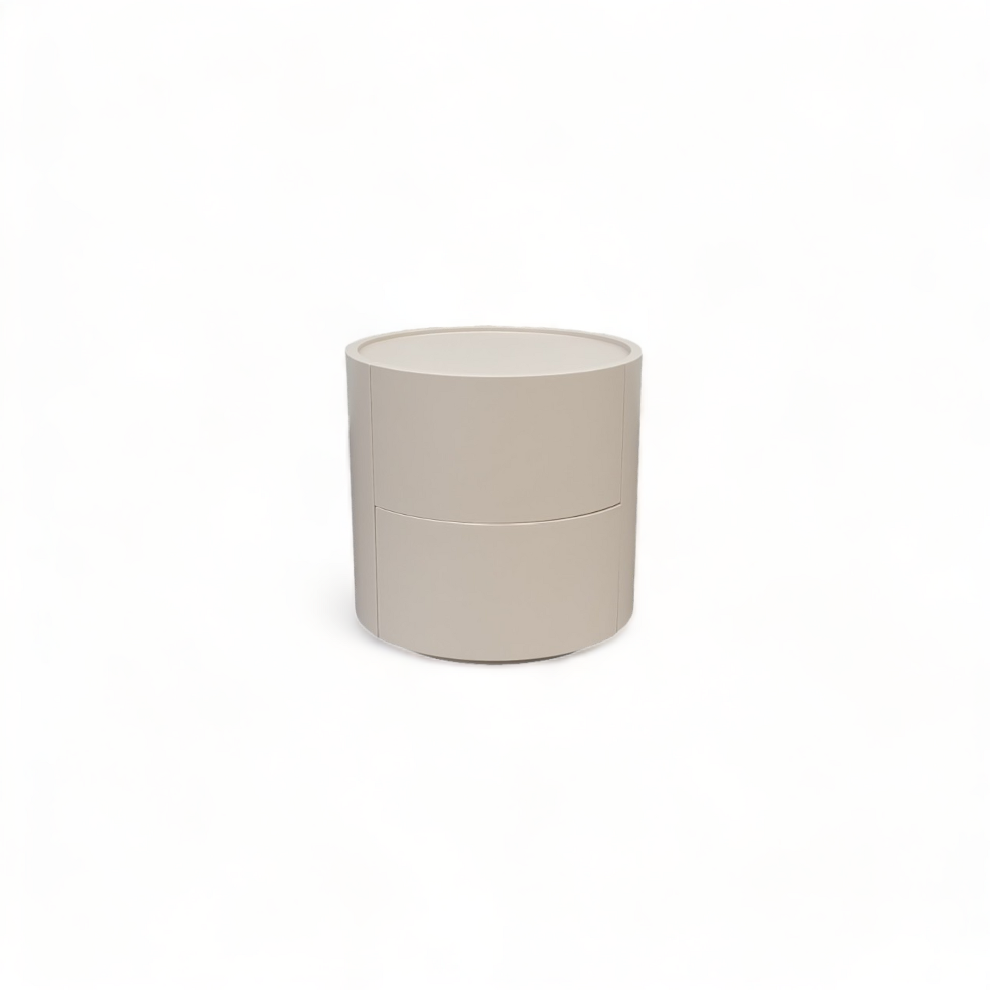 [description] La table de chevet Duke gris-beige se distingue par son design et sa fonctionnalité dans toute chambre moderne . Compacte et dotée d'une forme ronde unique, elle est dotée de deux tiroirs de rangement. Laquée gris-beige mat, elle est idéale pour les petits espaces, que ce soit dans une chambre, une chambre d'amis ou un salon.