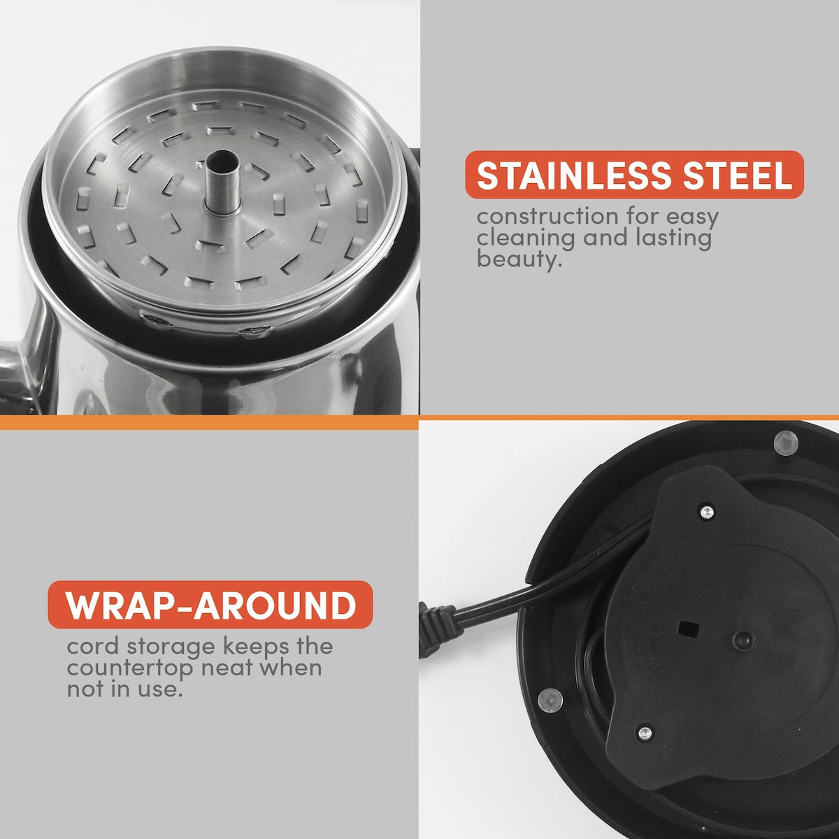 - WRAP AROUND CORD STORAGE and non-slip feet as well as 360° swivel base for Easy Tabletop Cord-Free Serving. This makes the Percolator completely portable and you can serve coffee away from the kitchen if you wish