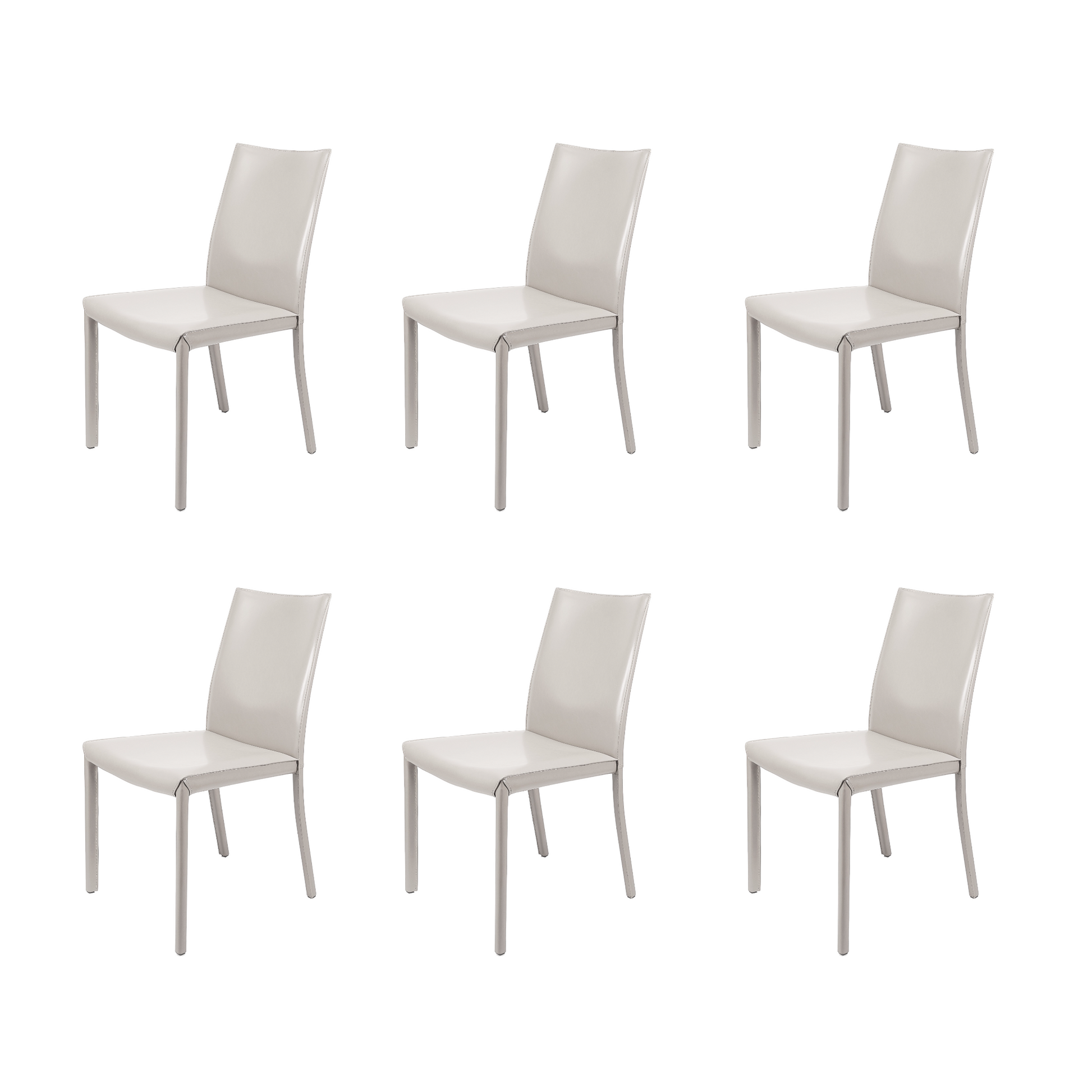 La chaise de salle à manger Emma, dossier bas, gris clair, au design élégant et moderne, s'intègre parfaitement à toute salle à manger. Elle est dotée d'une structure en métal entièrement recouverte de cuir régénéré. Prix unitaire.