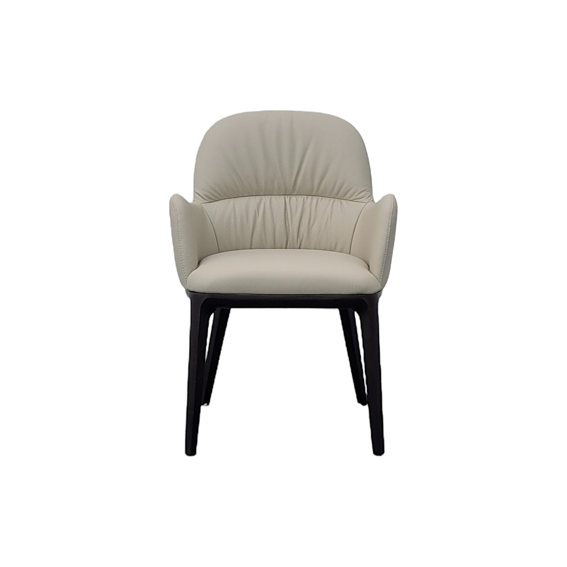 [description] Le fauteuil de salle à manger Enea affiche un style moderne et chaleureux qui se démarque dans toute salle à manger contemporaine. Son dossier, ses accoudoirs et son assise incurvés, entièrement recouverts de cuir gris amande blé, offrent une assise confortable. Son piètement, en wengé expresso, présente des angles arrondis en bois, gage d'un excellent savoir-faire. À la fois moderne et chaleureuse, cette chaise s'harmonise parfaitement avec toutes les tailles de table.