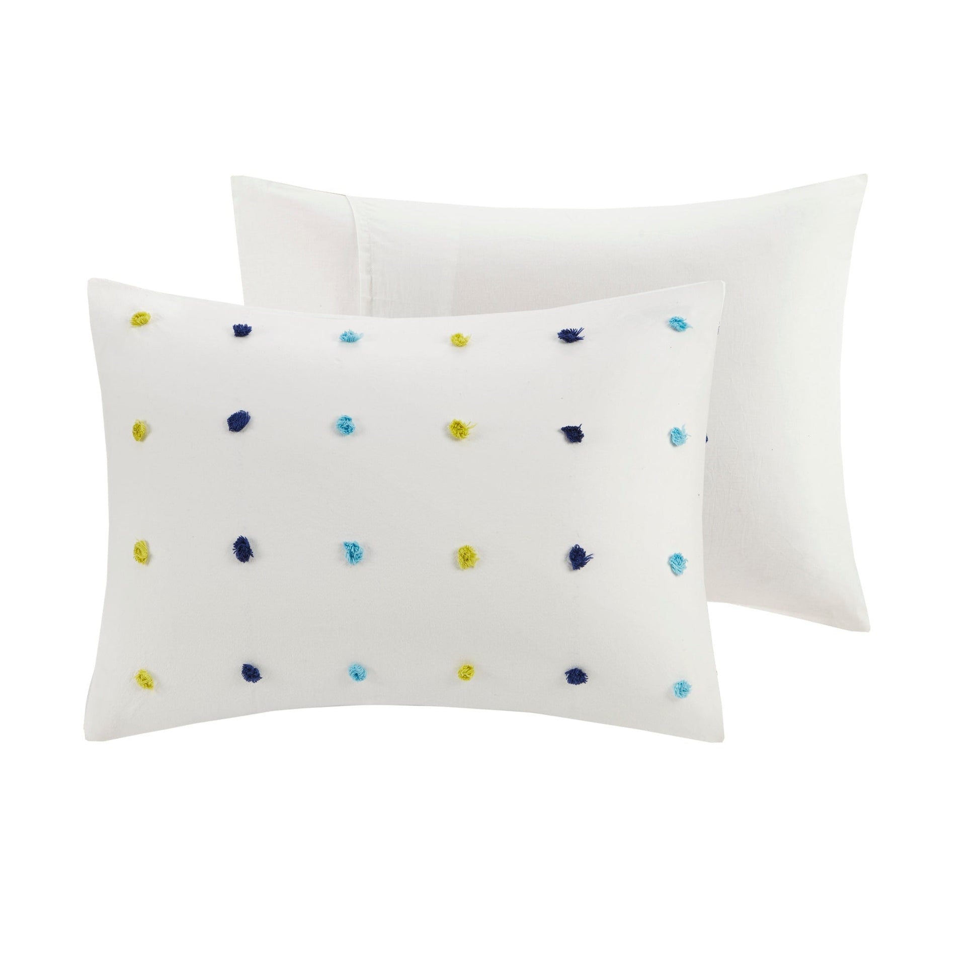 Create a cute and cozy look in your child's bedroom with the Intelligent Design Kids Ensley Cotton Jacquard Pom Pom Comforter Set. This cotton comforter features an all-over jacquard pom pom design that adds texture, for a shabby chic look. Matching shams (1 for Twin Sizes) pair perfectly with the comforter, while a square and an oblong decorative pillow complete this adorable kid's comforter set. Machine washable, this bedding set is also OEKO-TEX certified, meaning it does not contain any harmful substances or chemicals, and uses an antimicrobial treatment that provides built-in freshness protection, reducing the growth of odor causing bacteria to keep fabric lasting longer.