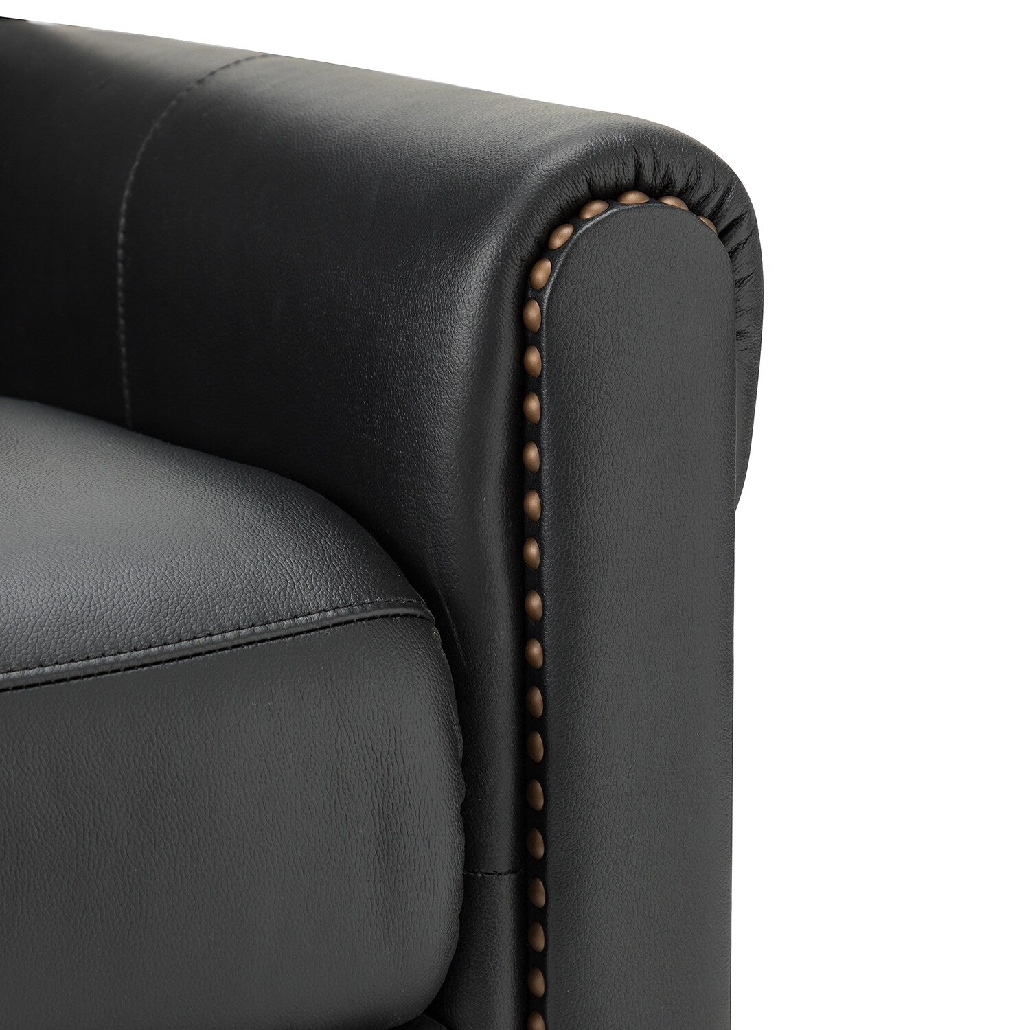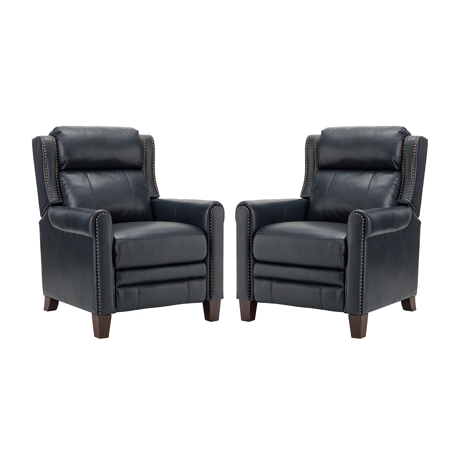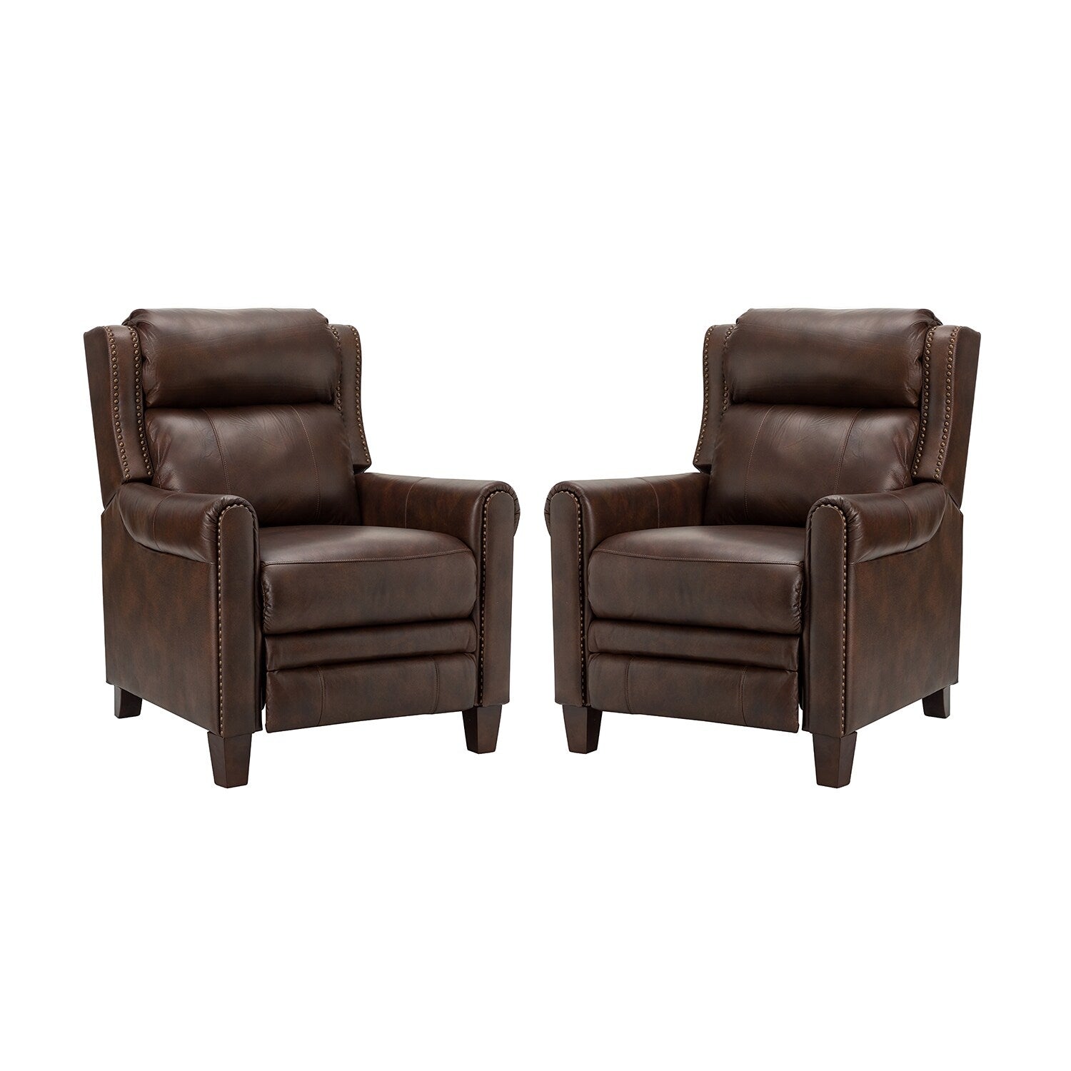 This recliner set is upholstered in luxurious premium leather for a smooth and comfortable touch. This recliner set can be manually selected to park in any position you find most comfortable, sitting, half, or fully reclining. Their sturdy wood frame is designed to support up to 250 pounds. Their nailhead trim and soft seat cushion create the ultimate relaxation and soothing treatment for your mind and body. Our exquisite craftsmanship and elegant design bring more sophistication to this recliner set. You can place them in your living room, study or office.