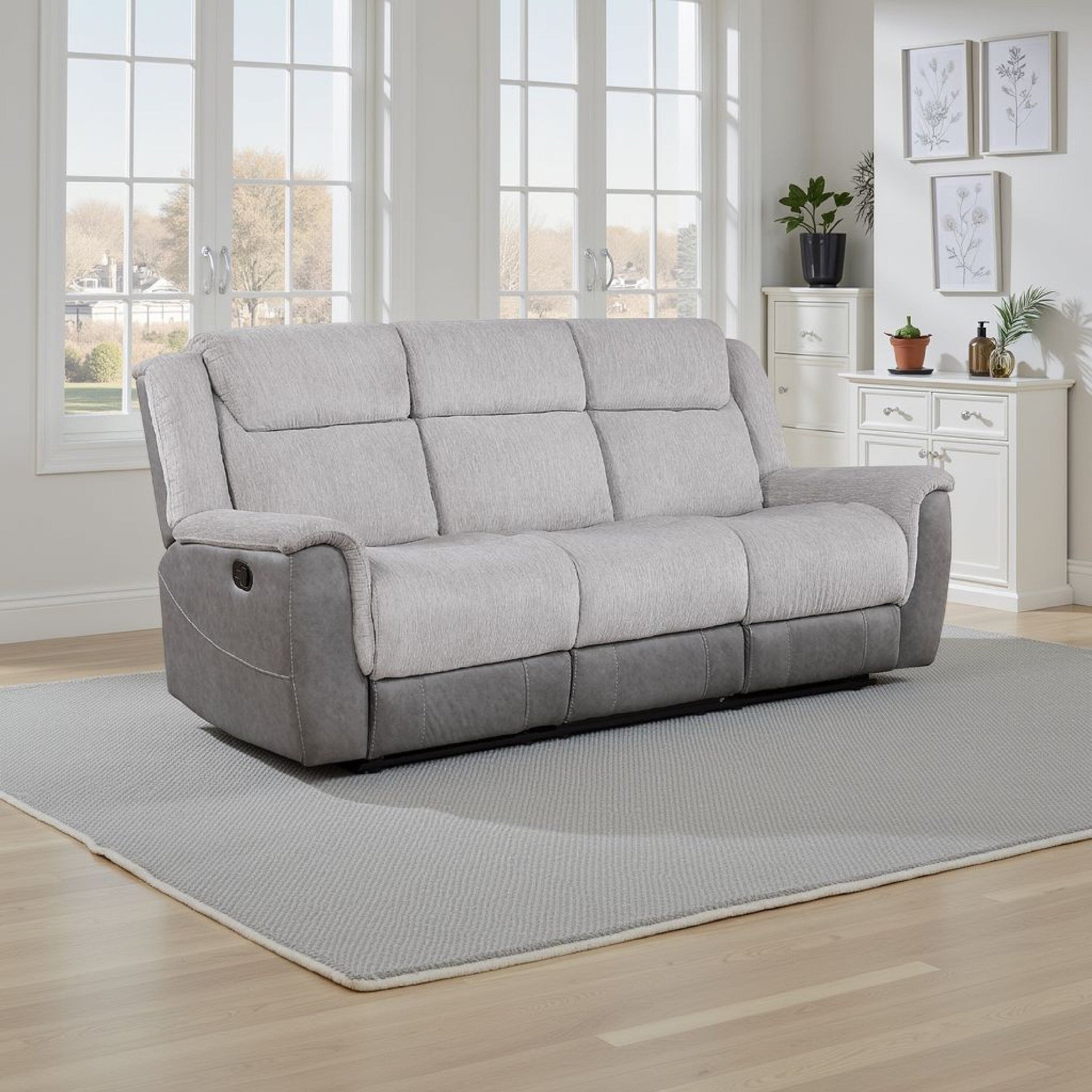 Experience the comfort and style with this dual reclining sofa, upholstered in soft gray and white chenille with microfiber accents. Its solid wood and metal reinforced frame ensures durability, while plush foam over pocket coils provides exceptional support. The smooth pull tab manual recliner is perfect for living rooms, home theaters, or reading nooks. Explore our Feo collection.