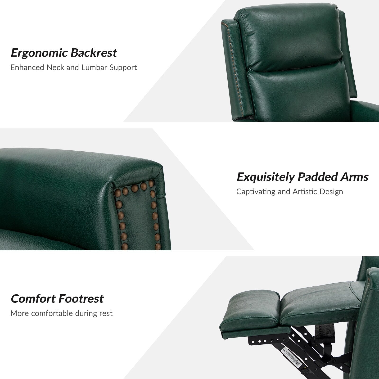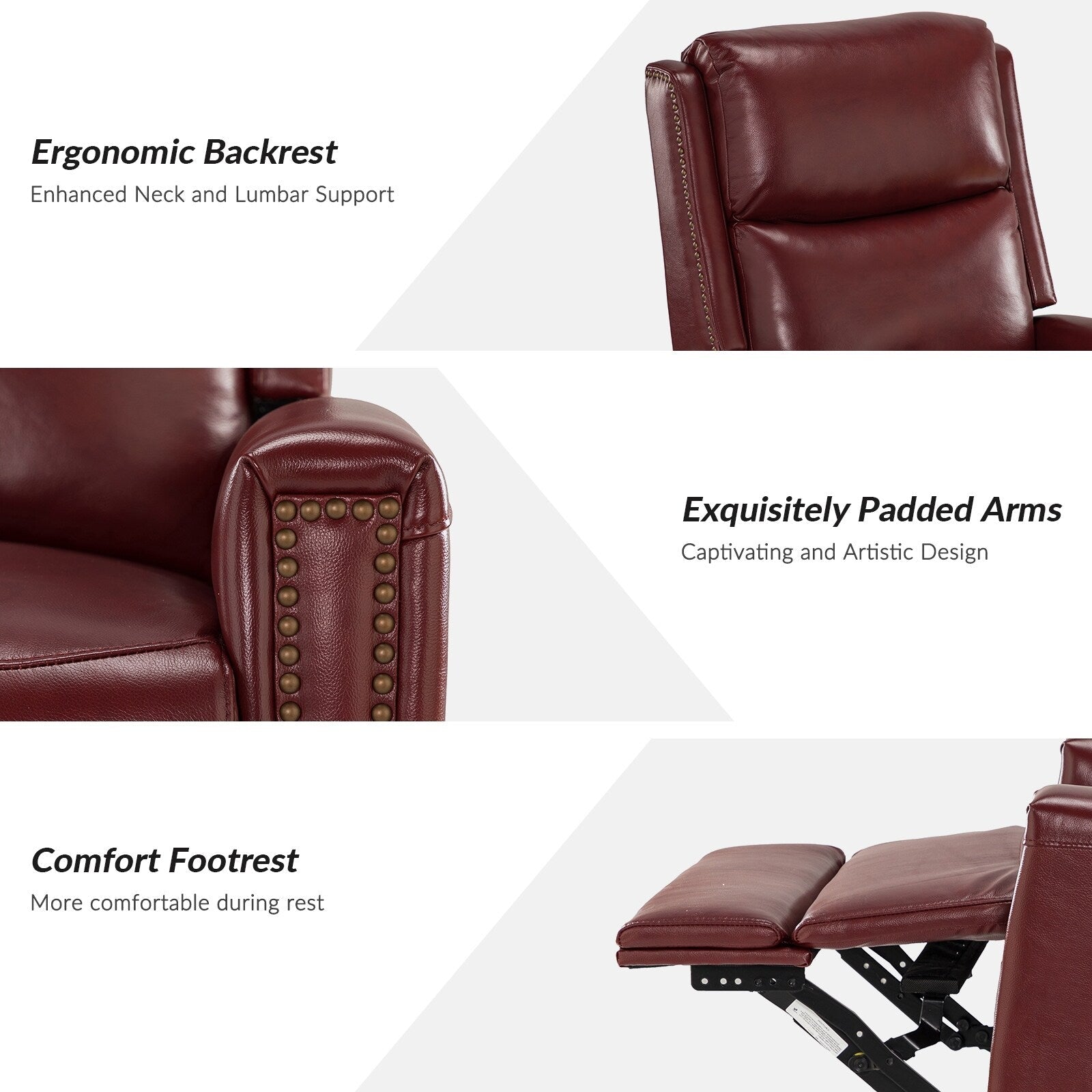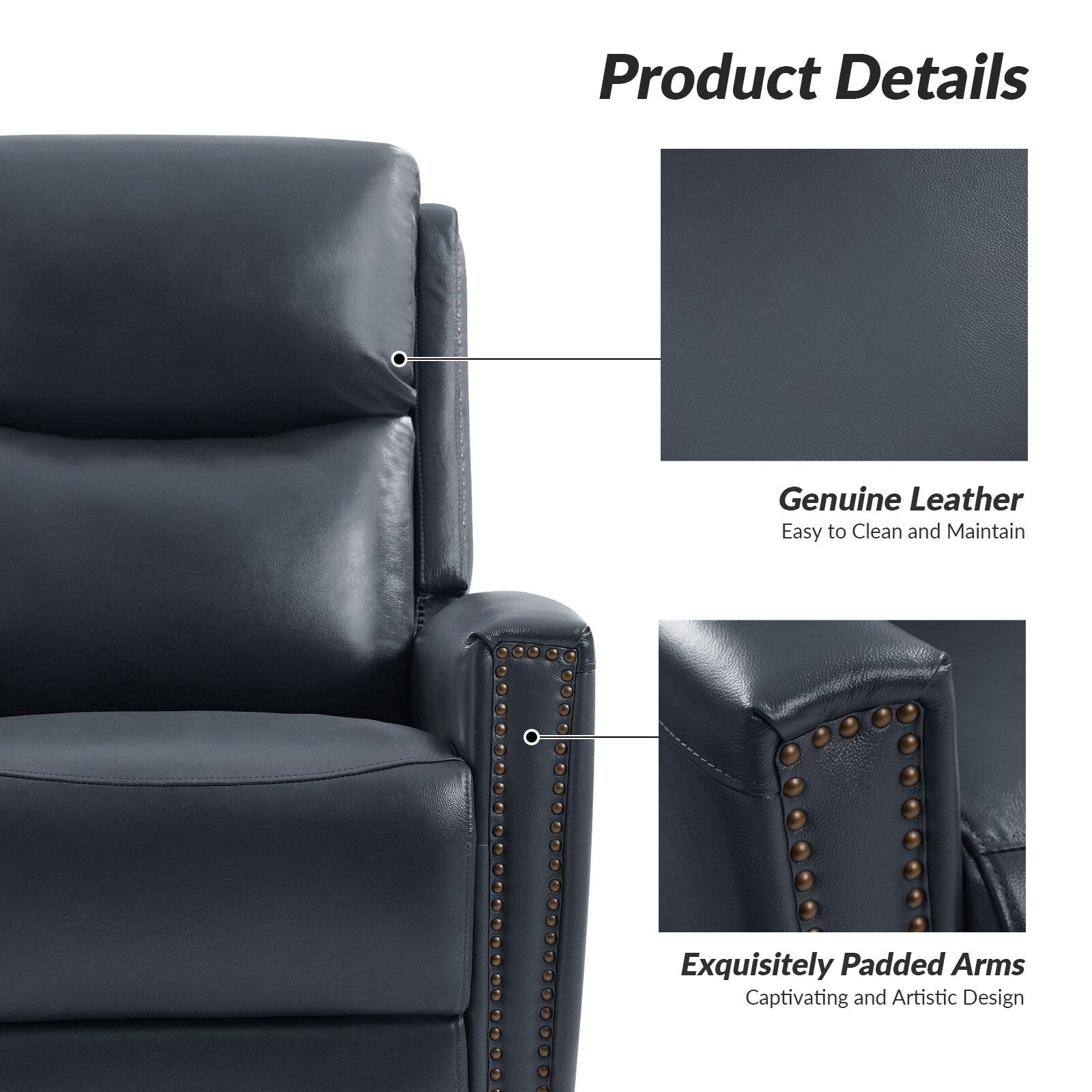 This genuine leather recliner lets you sit back and relax with ease during movie night in your living room or den. This recliner offers three positions for you to relax in and reclines at the pull of a handle, and it exudes luxury and comfort when both upright and in the reclining position while the smooth genuine leather adds sophistication, giving you style with no cost to relaxation potential. This recliner is crafted from manufactured wood with a mid-century modern appearance for simple yet fashionable charm in any living room. Glam nailhead trim outlines the shape of the arms, lending a rich and whimsical accent to your space. Plus, this is the perfect chair for grabbing some freshly buttered popcorn, kicking back, and watching a movie with the whole family on a Friday night.
