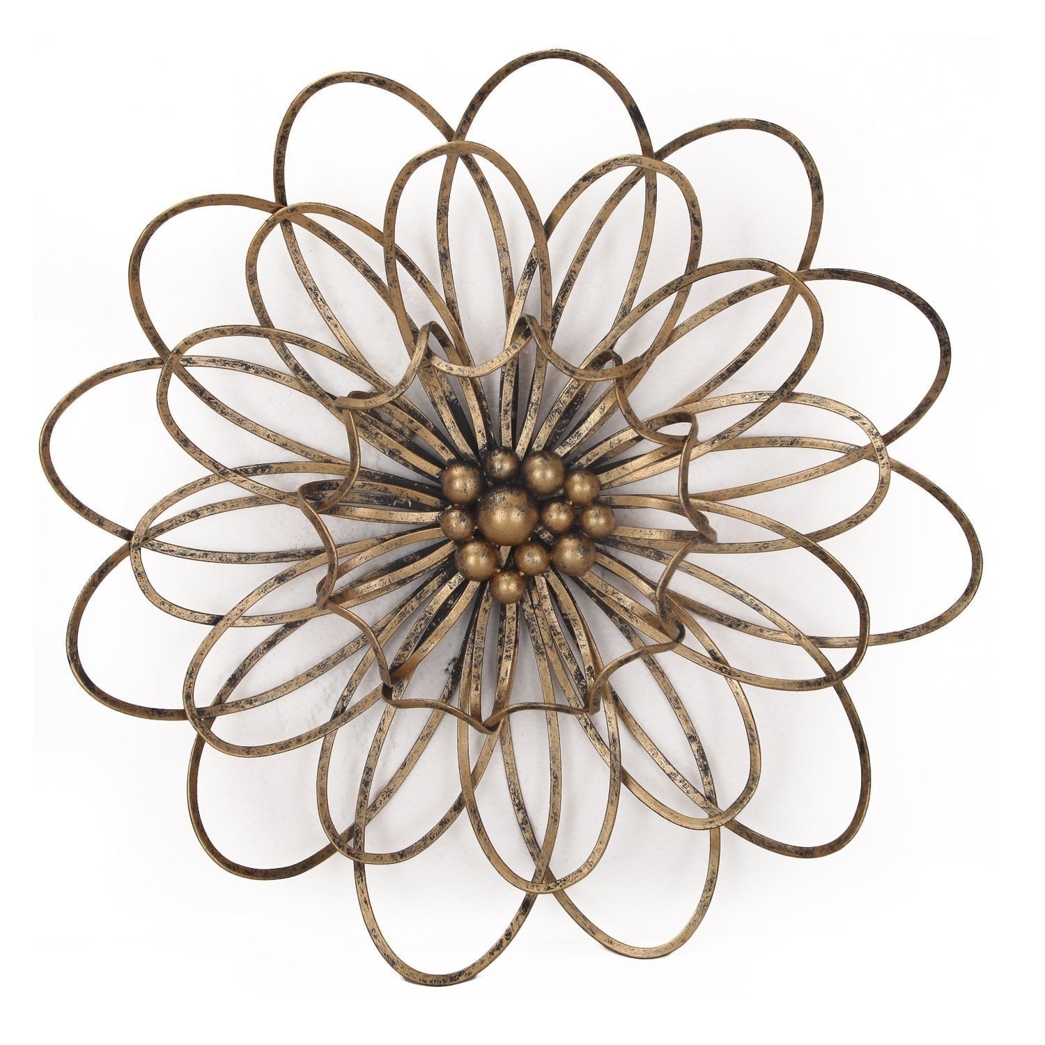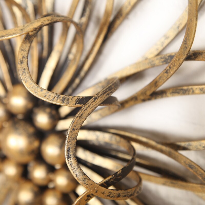 Add a touch of elegance and personality to your home decor with this Flower Urban Design Metal Wall Decor. This charming 3-dimensional wall art is handcrafted from iron with a blossoming flower design that features three layers of curving, gold-brushed petals. Each petal is delicately antiqued for a unique look and texture, while the center of the flower displays a cluster of glossy golden balls that form the stylized stamen of the dramatic centerpiece. Easy to install with key hooks on the back, this vintage gold flower wall art makes a perfect gift for any occasion and is ideal for your living room, bedroom, loft, entryway, and more.