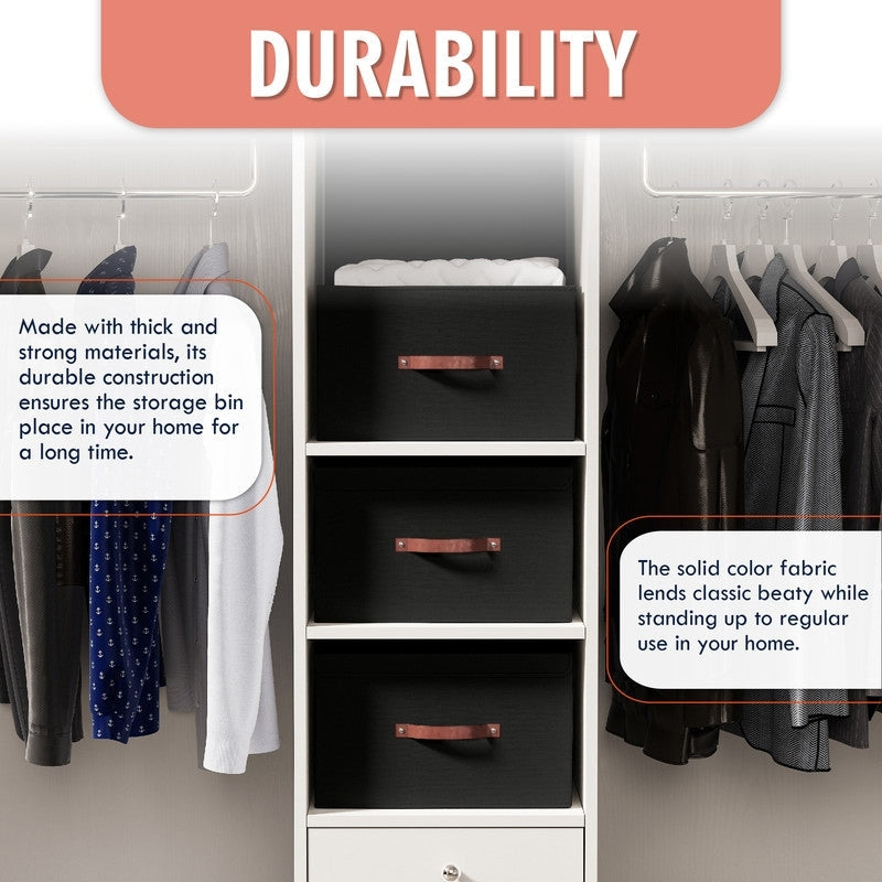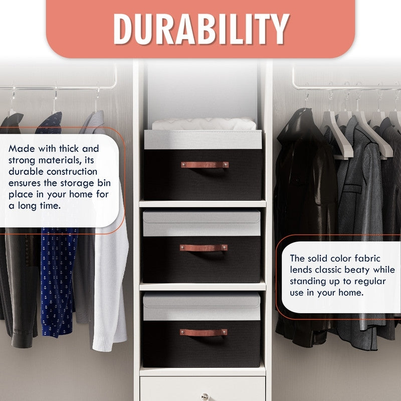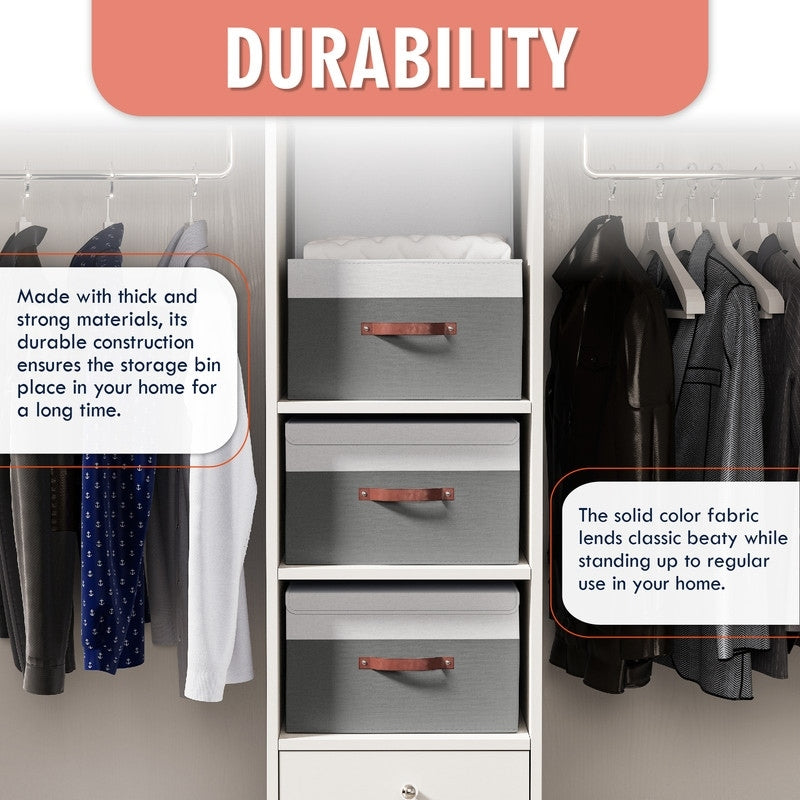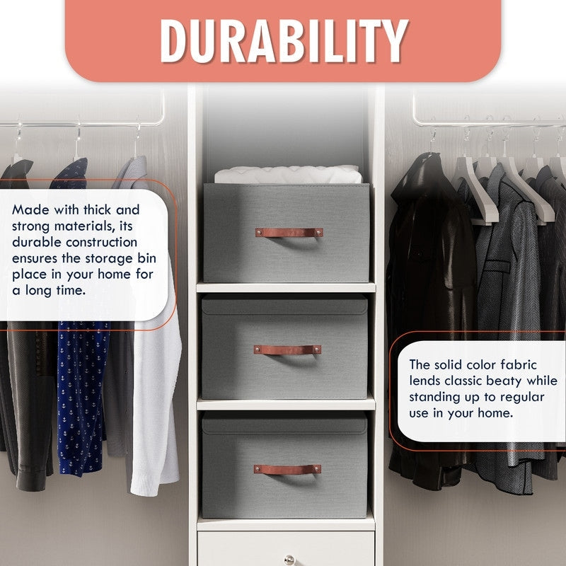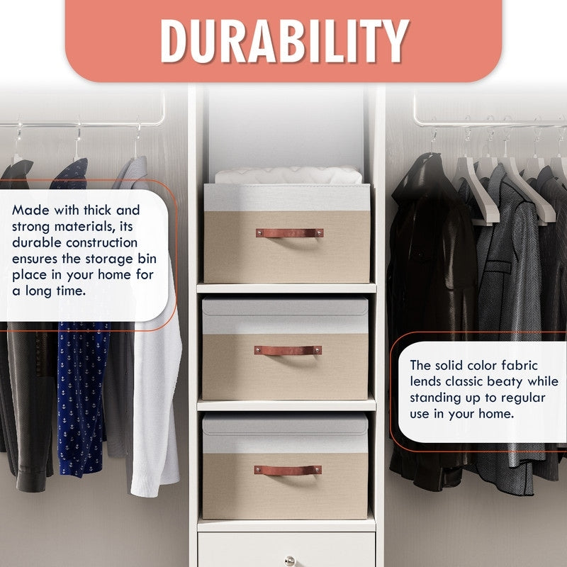 Foldable Collapsible Large Storage Box Bins Linen Fabric Shelf Basket with Leather Handles and Lid - Set of 3