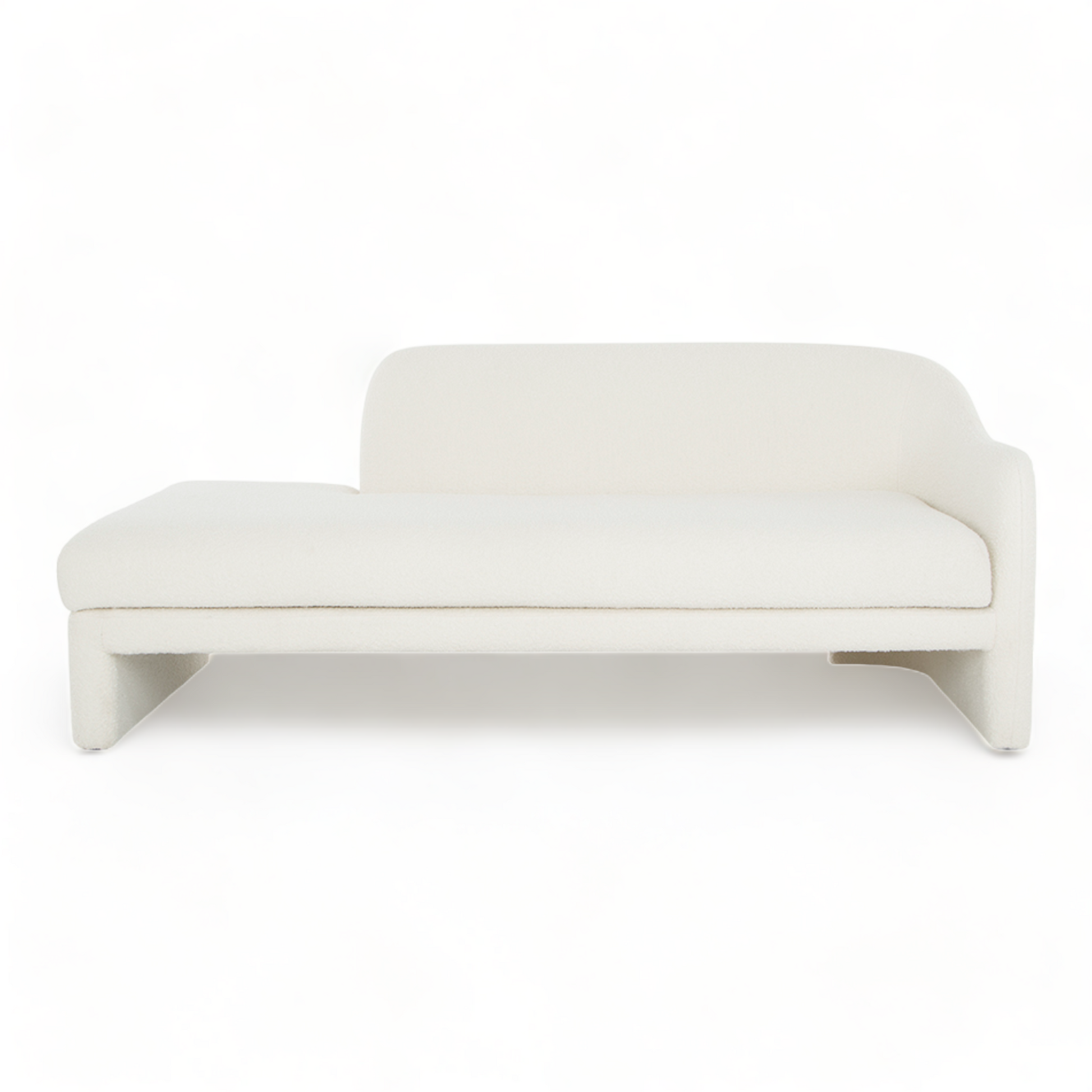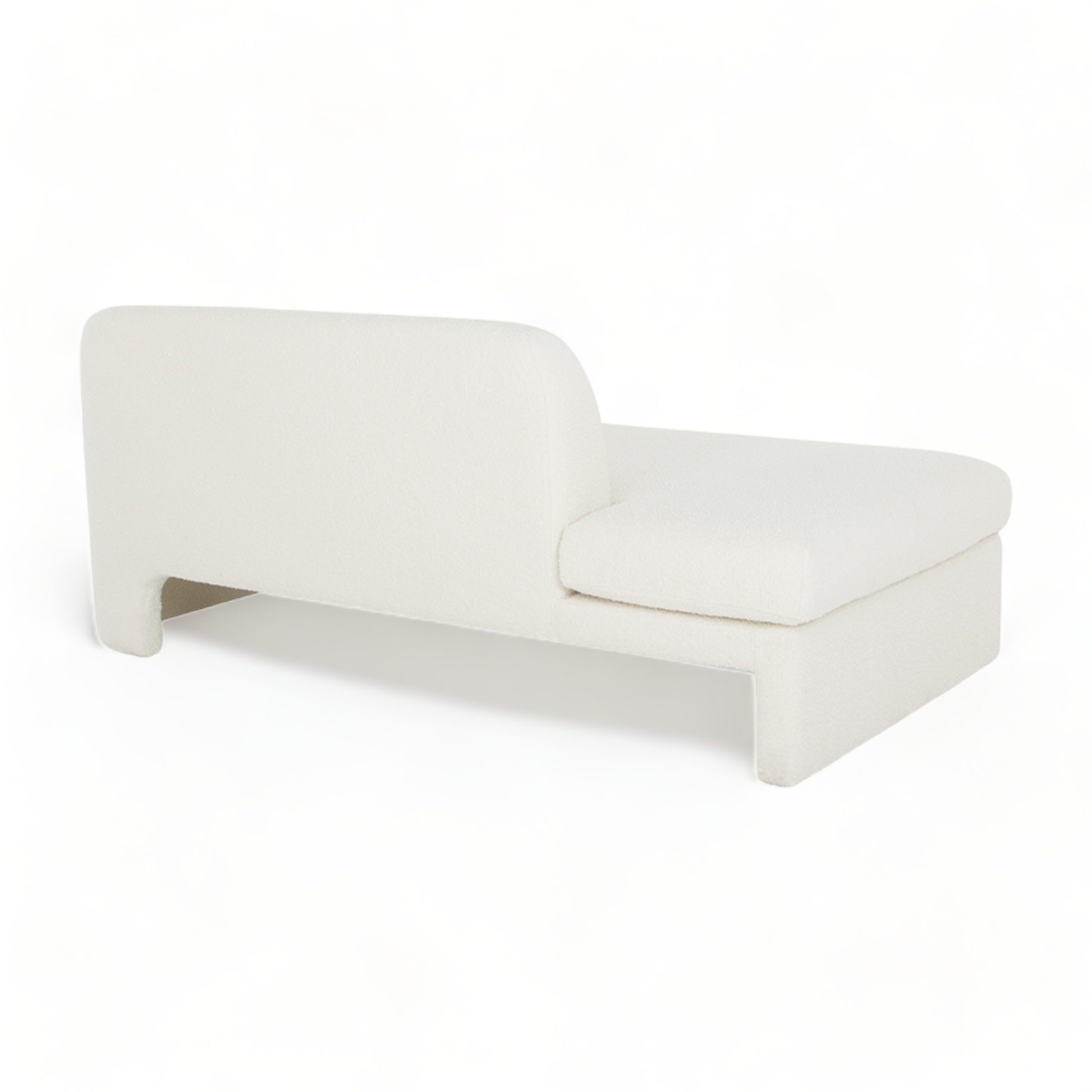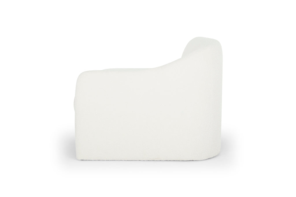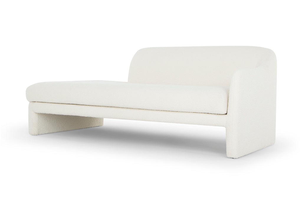 [description] La méridienne Furore, avec sa forme unique et son design scandinave, se distingue dans tout salon ou chambre contemporain. Elle est dotée d'un dossier incurvé, d'un accoudoir et d'une assise confortable recouverte de tissu bouclé blanc. Placez-la dans votre salon, votre chambre ou votre entrée pour une touche d'originalité.