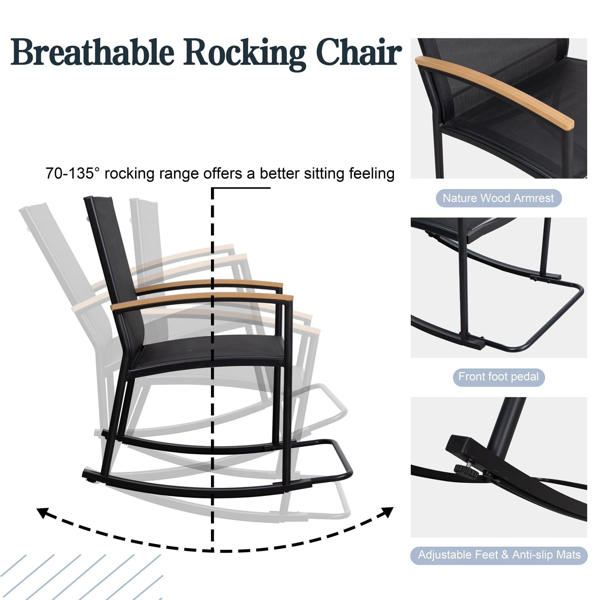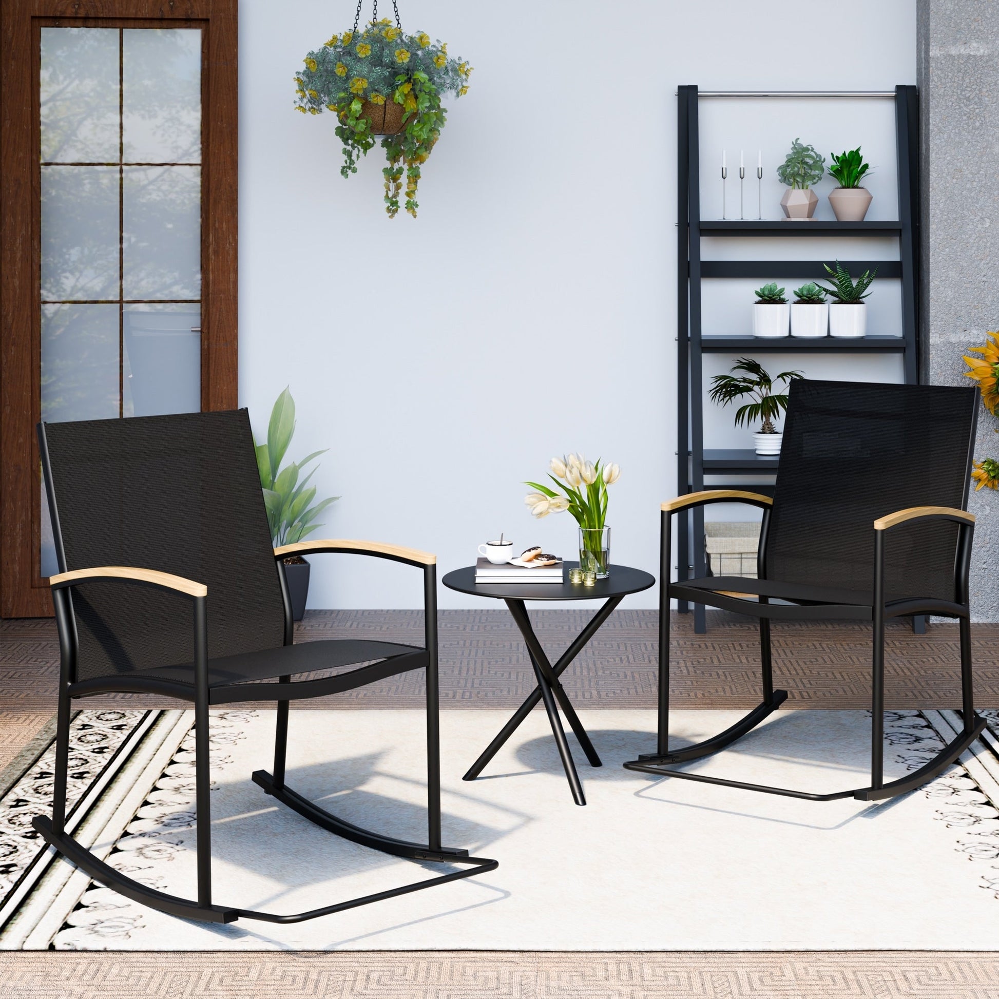 Stylish Appearance: this beautiful black wicker bistro set that includes two rocking chairs with cushions and a coffee table. Outdoor living just got better. Not only does it look great but it feels great too! This patio bistro set seats two and adds ambiance when you entertain.
